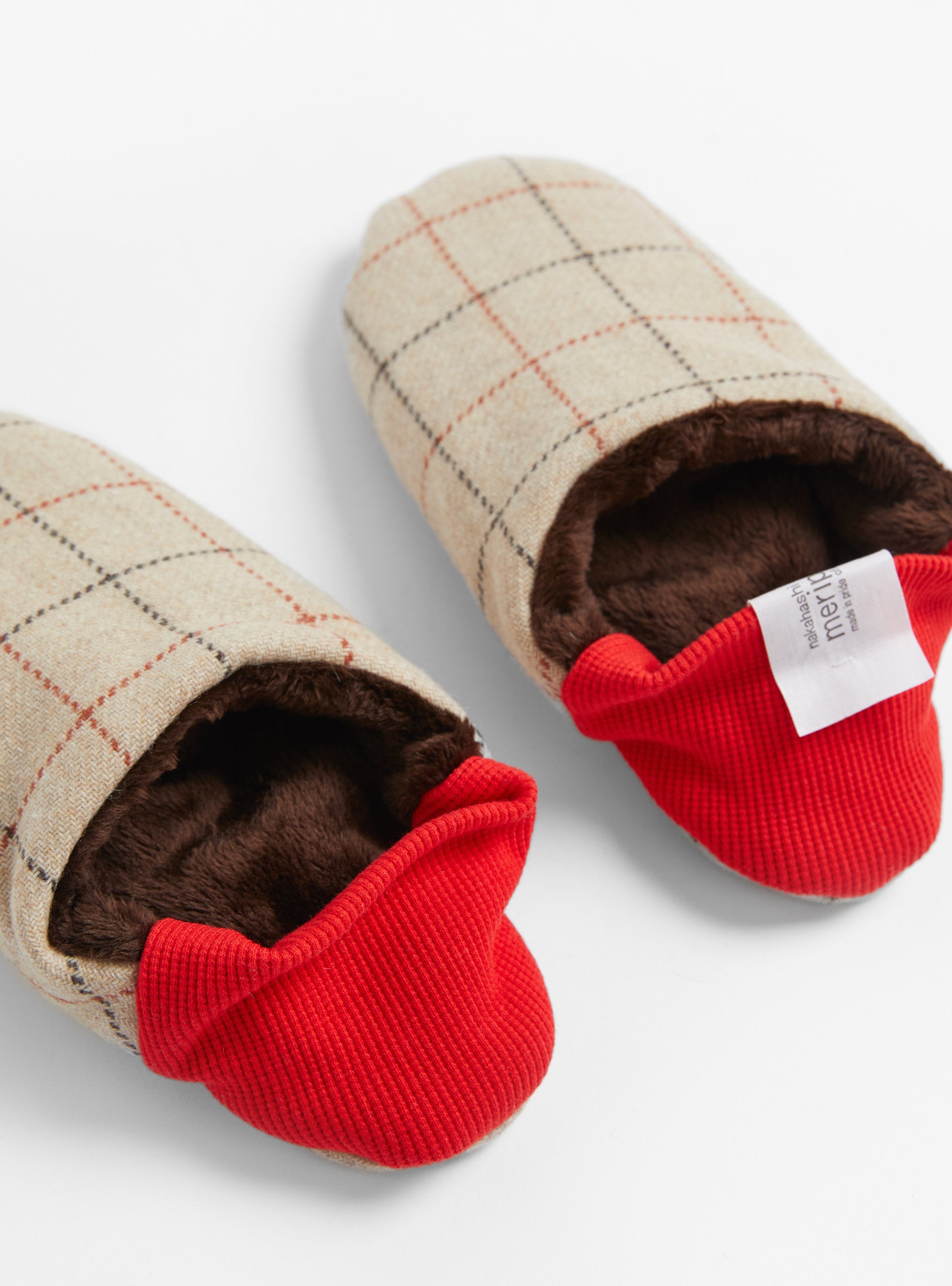 Made in Japan from an ultra-soft wool blend, these Recycled Wool Micro Boa Red slippers from Merippa have collapsible heels for easy wear around the house. They are reversible and packable.