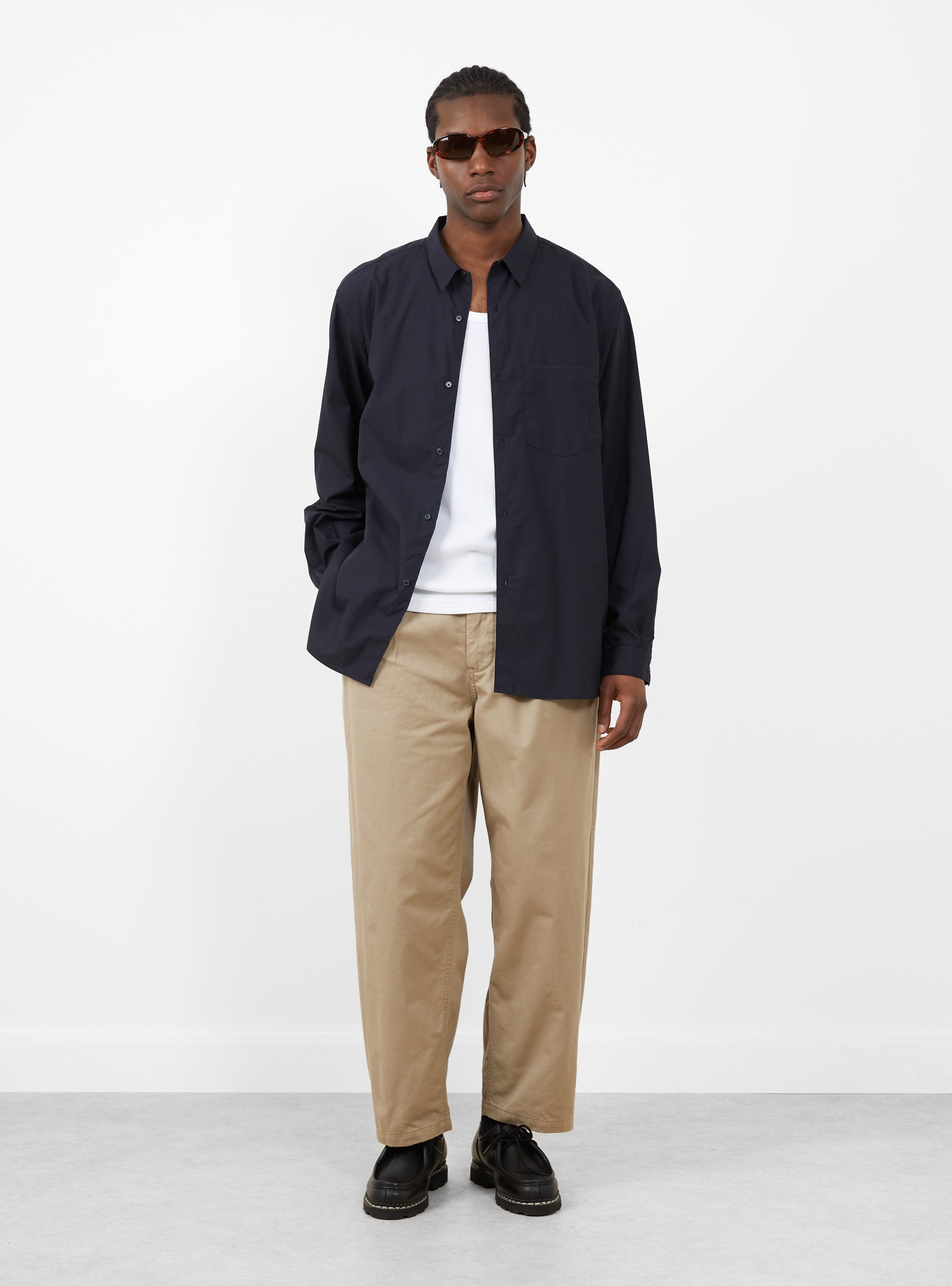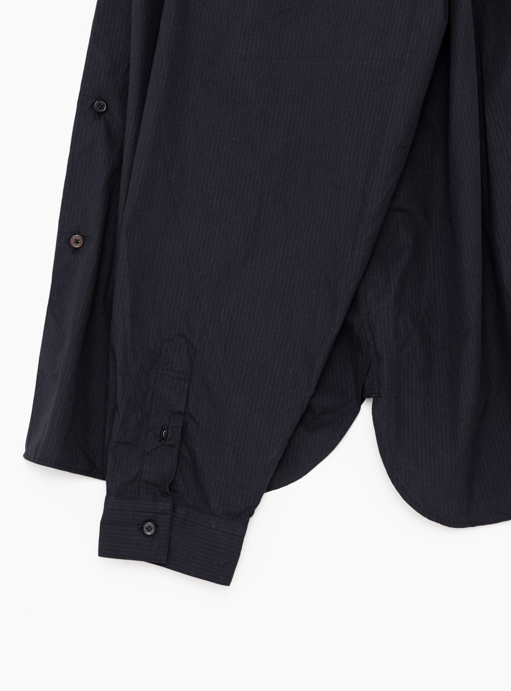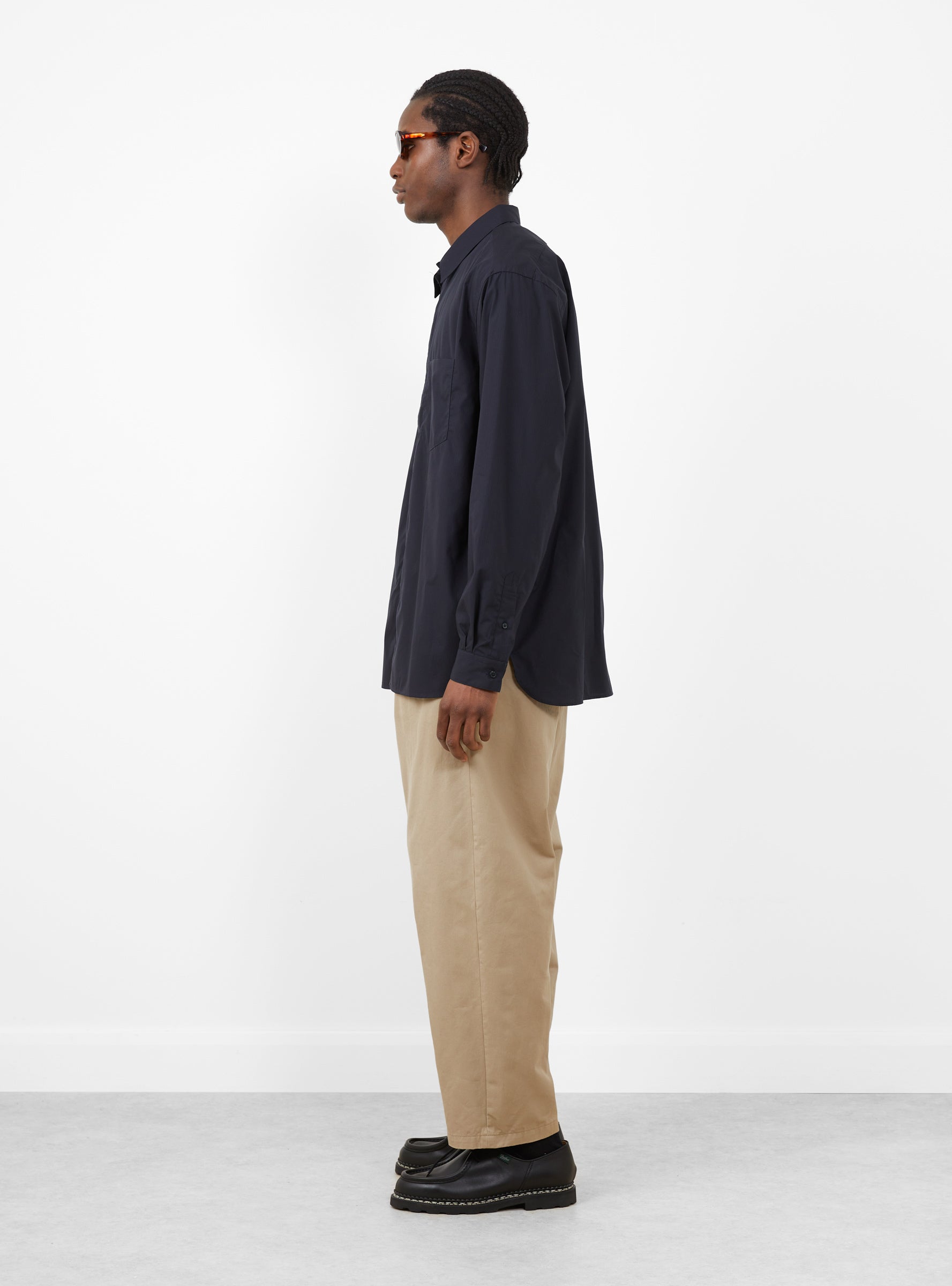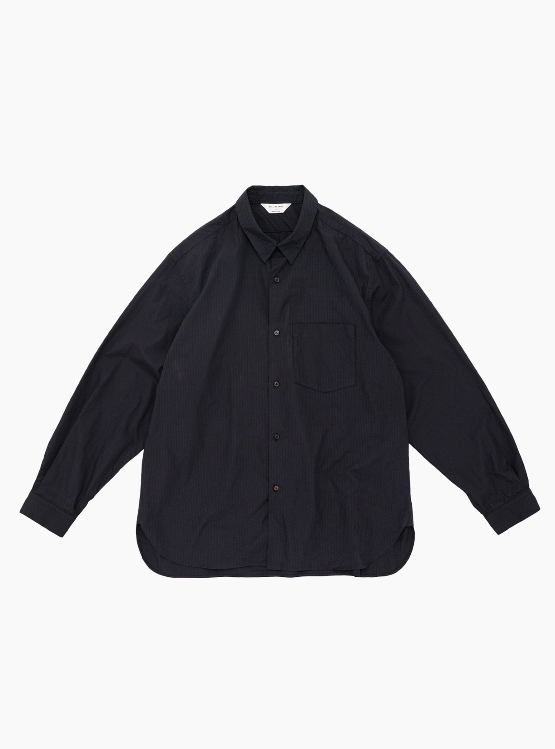 The Regular Collar Shirt comes in Navy Stripe from Still By Hand and is made in Japan from the brand’s original cotton yarn-dyed fabric produced in Nishiwaki, Hyogo. The subtly bumpy corded stripe features varied weaving patterns in the same colour. The shirt has a relaxed fit without being overly oversized and includes a single chest pocket.