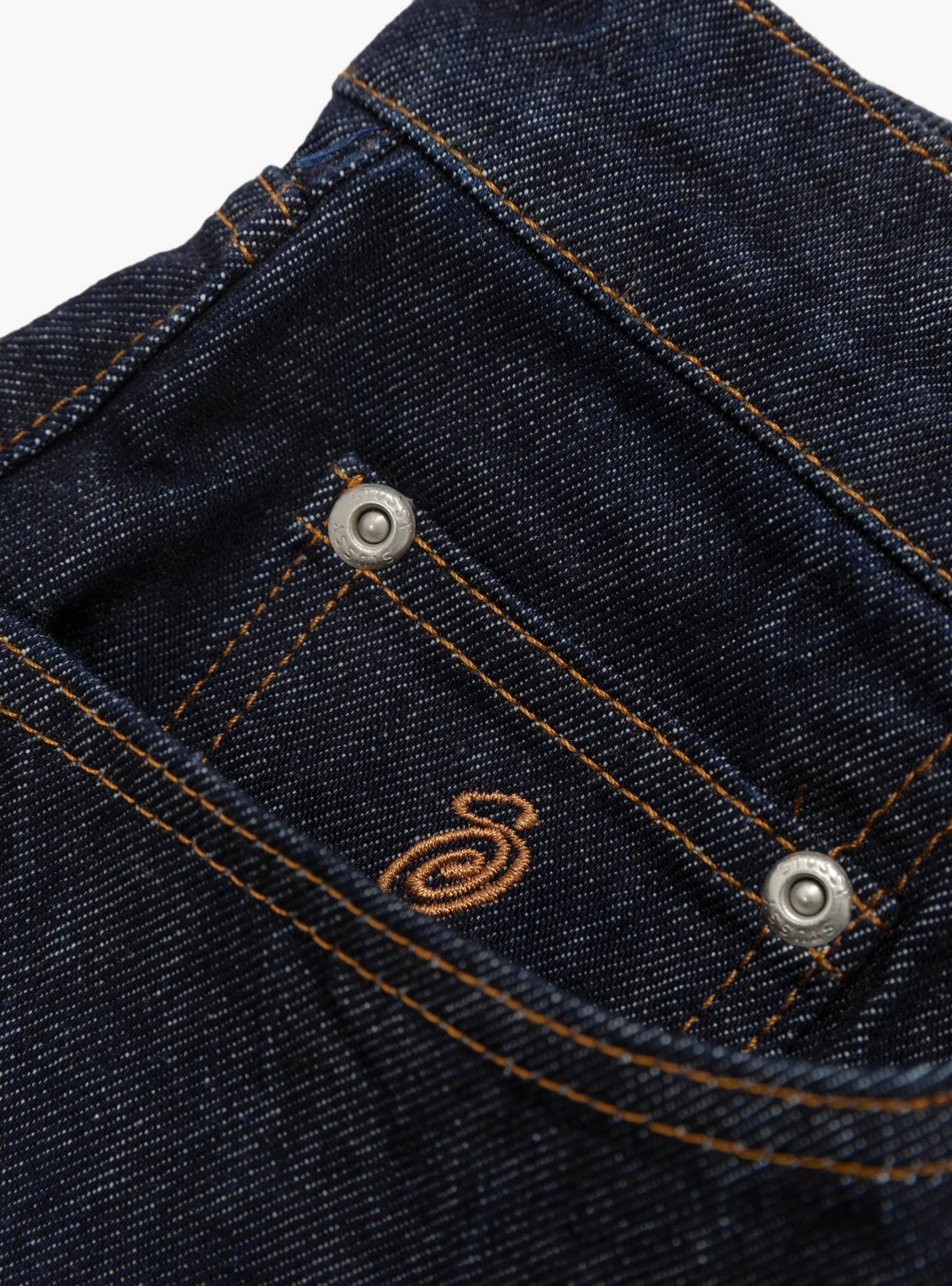 The Relaxed Jeans Denim from Stüssy are cut to a wide-leg fit, the widest leg opening in Stüssy's denim range. Made from cotton denim, the five-pocket design is detailed with a swirly 'S' embroidery on the coin pocket and features branded nickel shank hardware, as well as a suede Stüssy logo patch.
