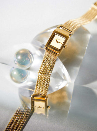 Crafted from 18kt gold-plated metal, this Revel Tethered watch from BREDA features Japanese-made Seiko Quartz movement and a woven mesh strap.
