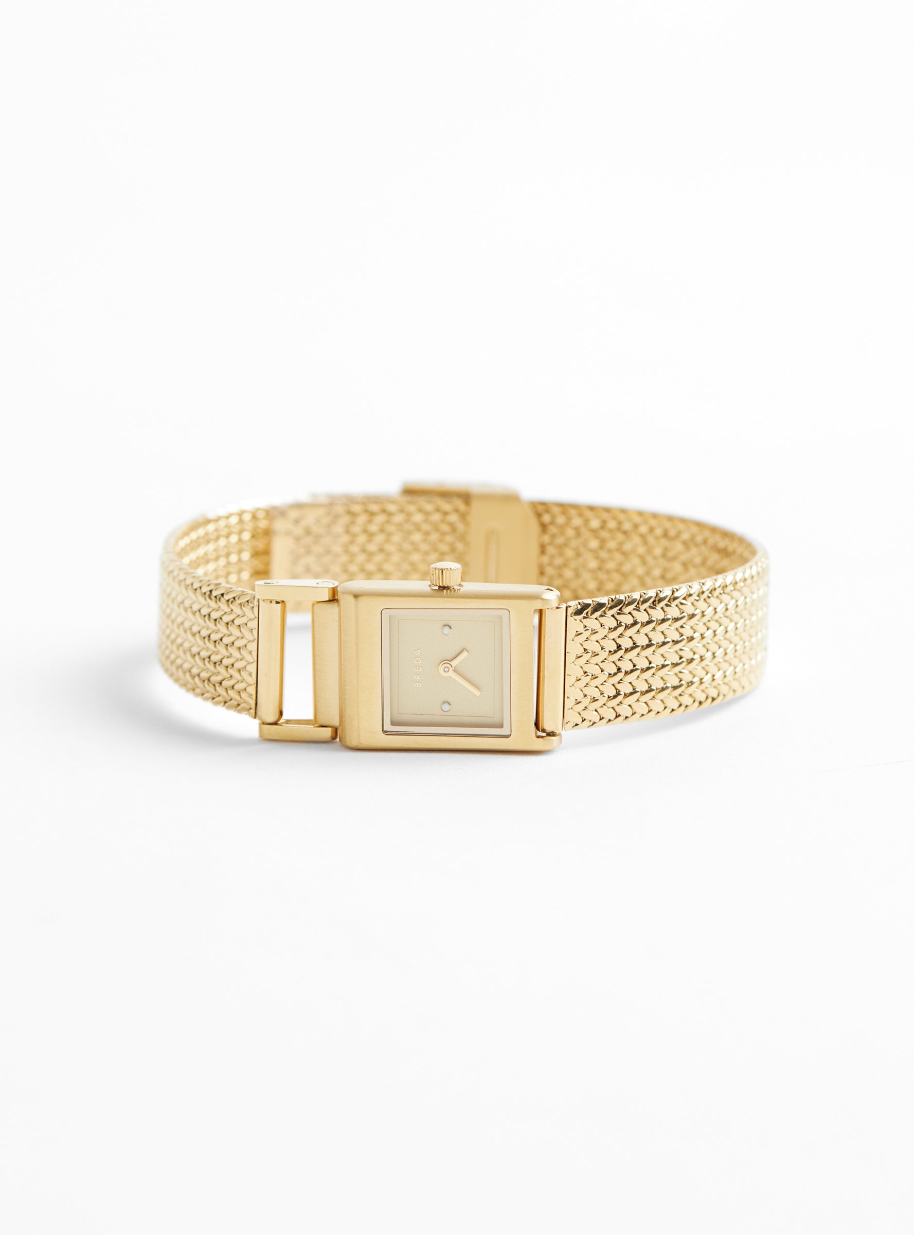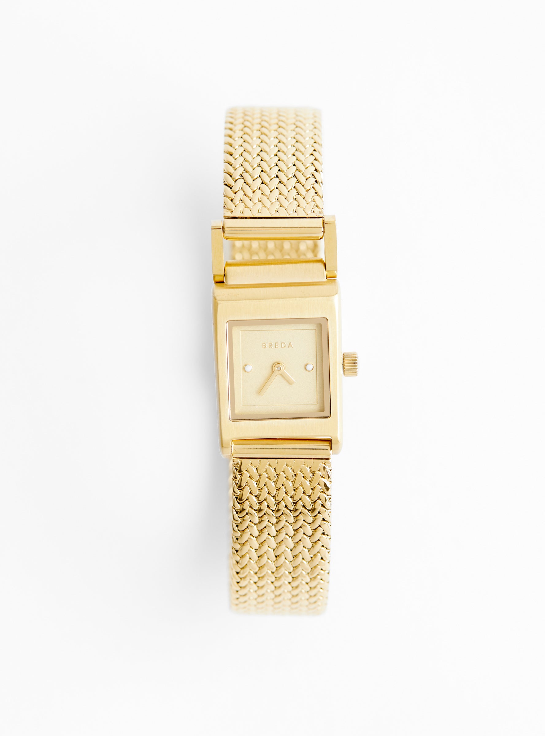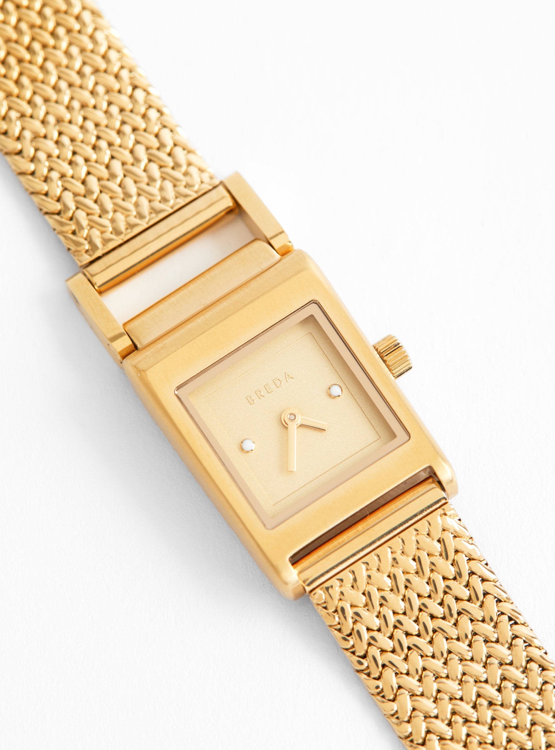 Crafted from 18kt gold-plated metal, this Revel Tethered watch from BREDA features Japanese-made Seiko Quartz movement and a woven mesh strap.