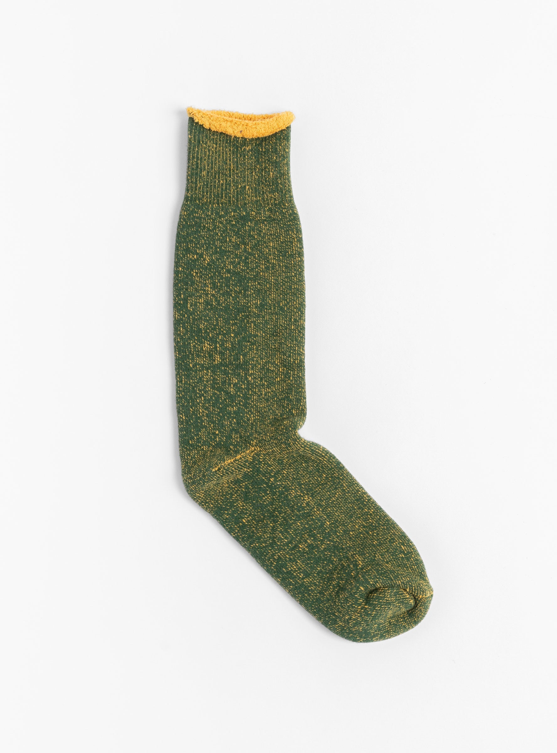 The Reversible Pile Socks Ivy Green and Dark Yellow from ROTOTO are made in Japan from a cotton-based blend. The reversible design adds versatility while providing a soft, comfortable fit.