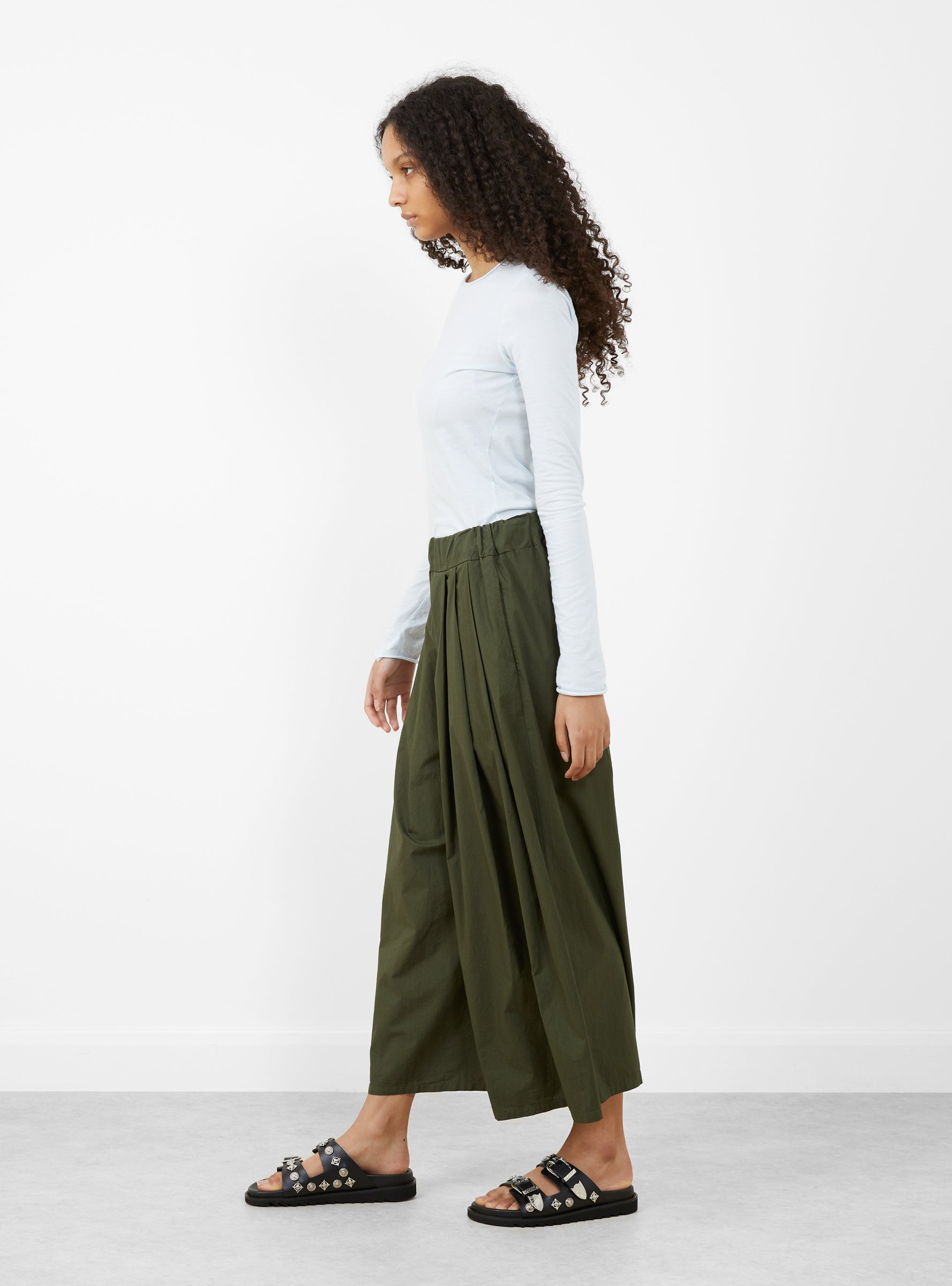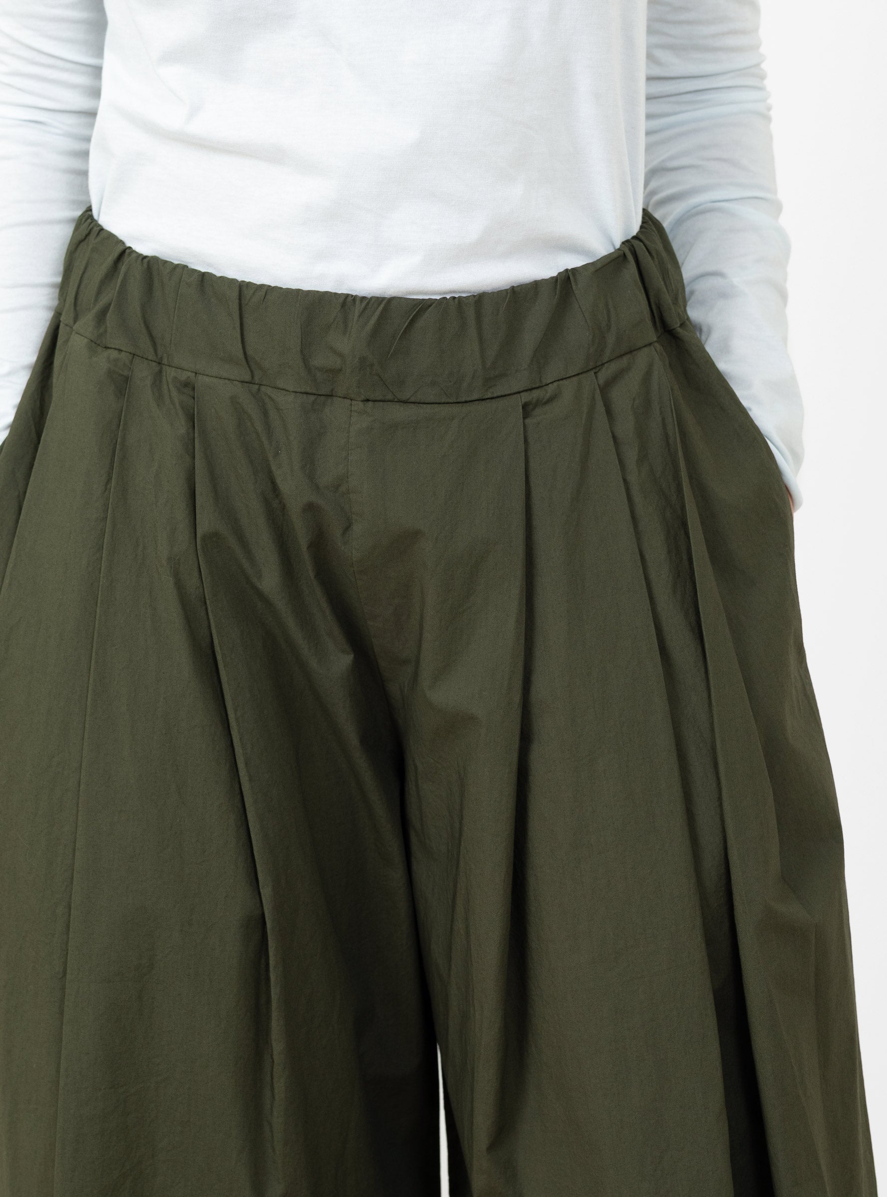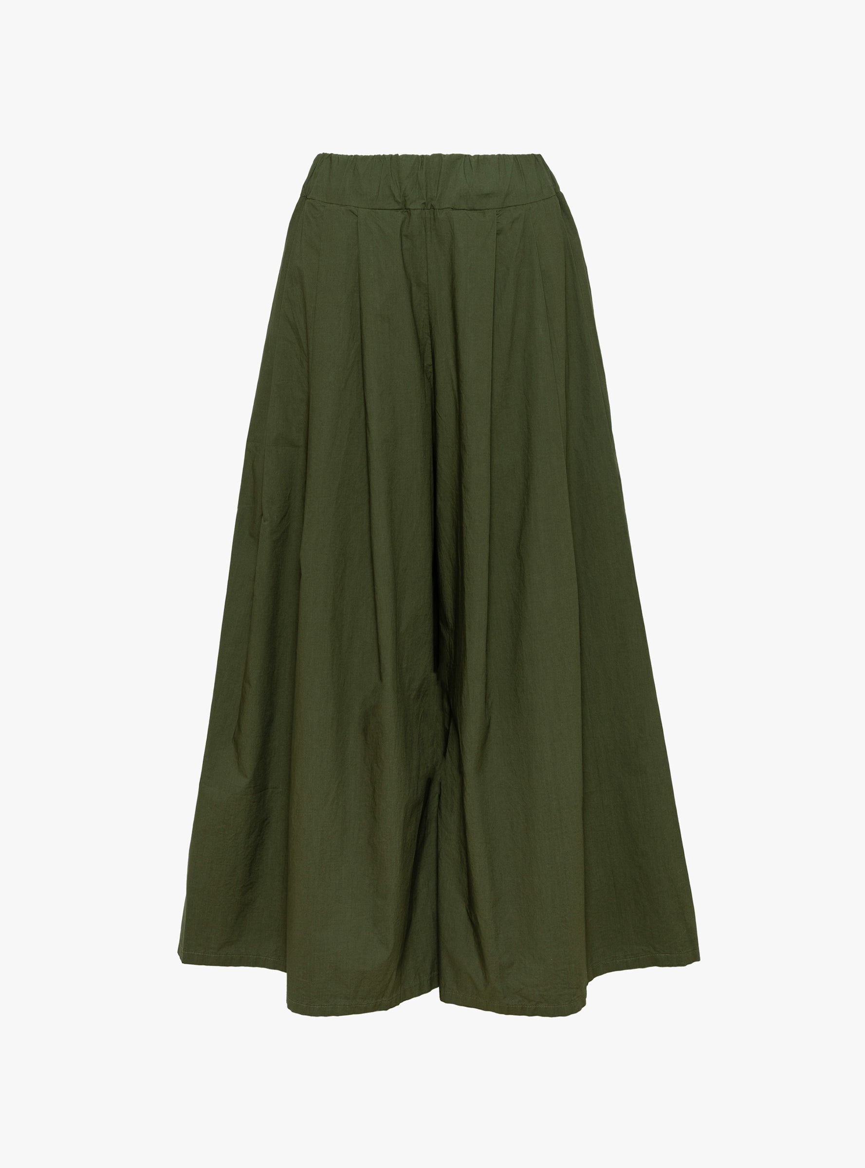 The Rombo Clara Trousers in Olive from Labo.Art are cropped, wide-leg culottes cut from Italian cotton, offering a lightweight and breathable feel. The elasticated waist with subtle pleating ensures a comfortable fit while maintaining a structured silhouette. The flowing legs create ease of movement and a relaxed, contemporary shape, making them versatile for both casual and refined styling.