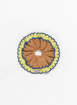 The Ruffle Scrunchie from Tomasa comes in a vento colourway. Knitted in Spain with organic cotton, the double-layered, ribbed scrunchie features contrasting brown and yellow yarn with waves at the contours.