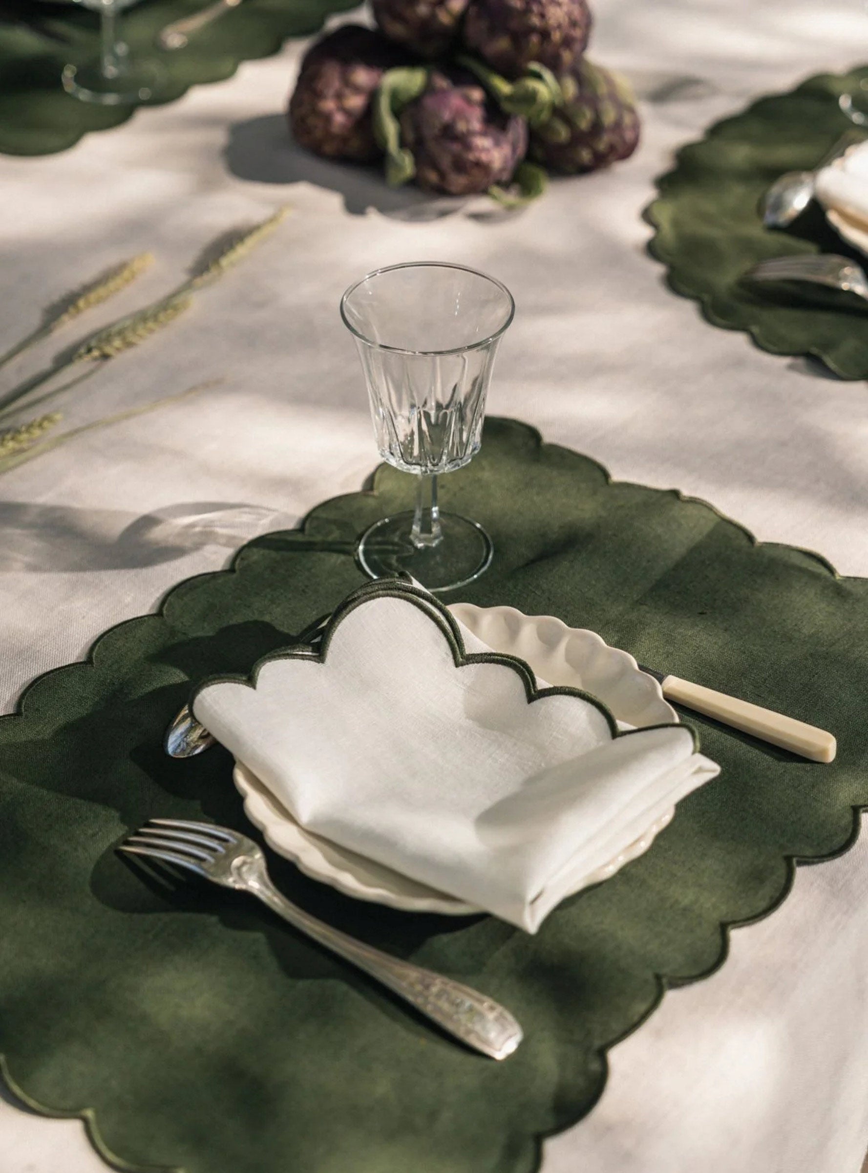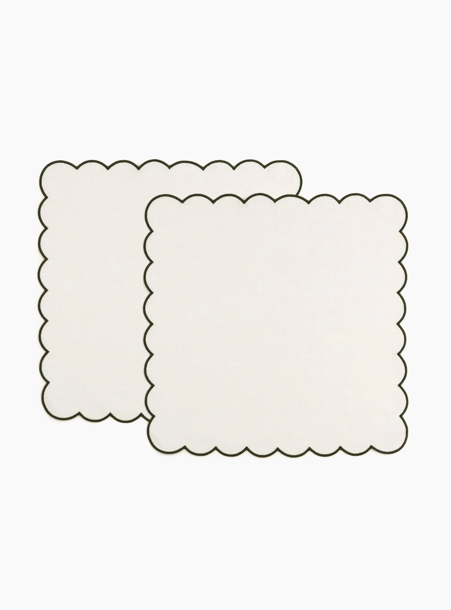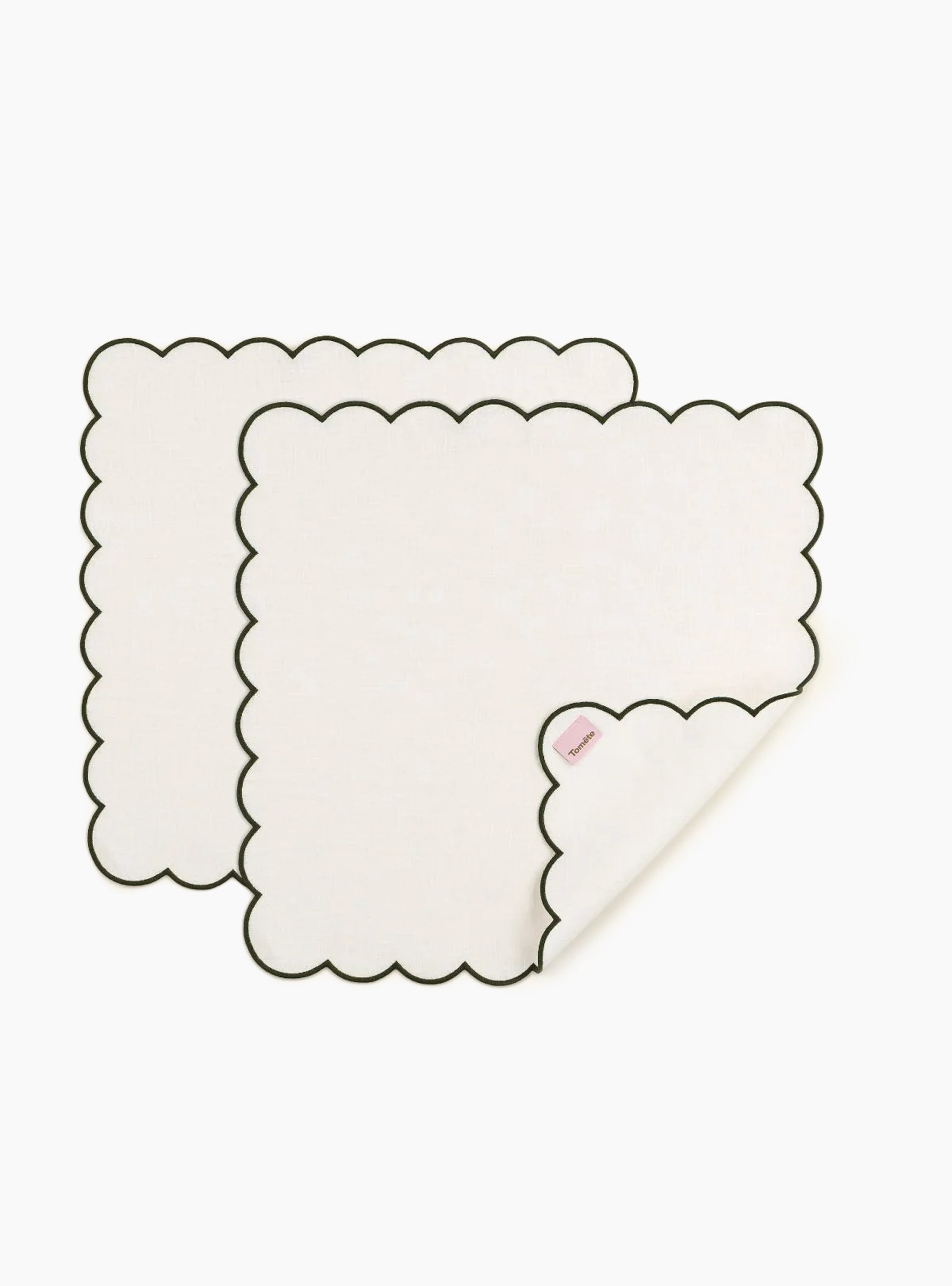 The Scalloped Napkins from Tomète are made in Portugal from European flax linen. Each set includes two square napkins in White & Green, finished with meticulously crafted scalloped embroidery for a refined look, suitable for everyday use or special occasions.