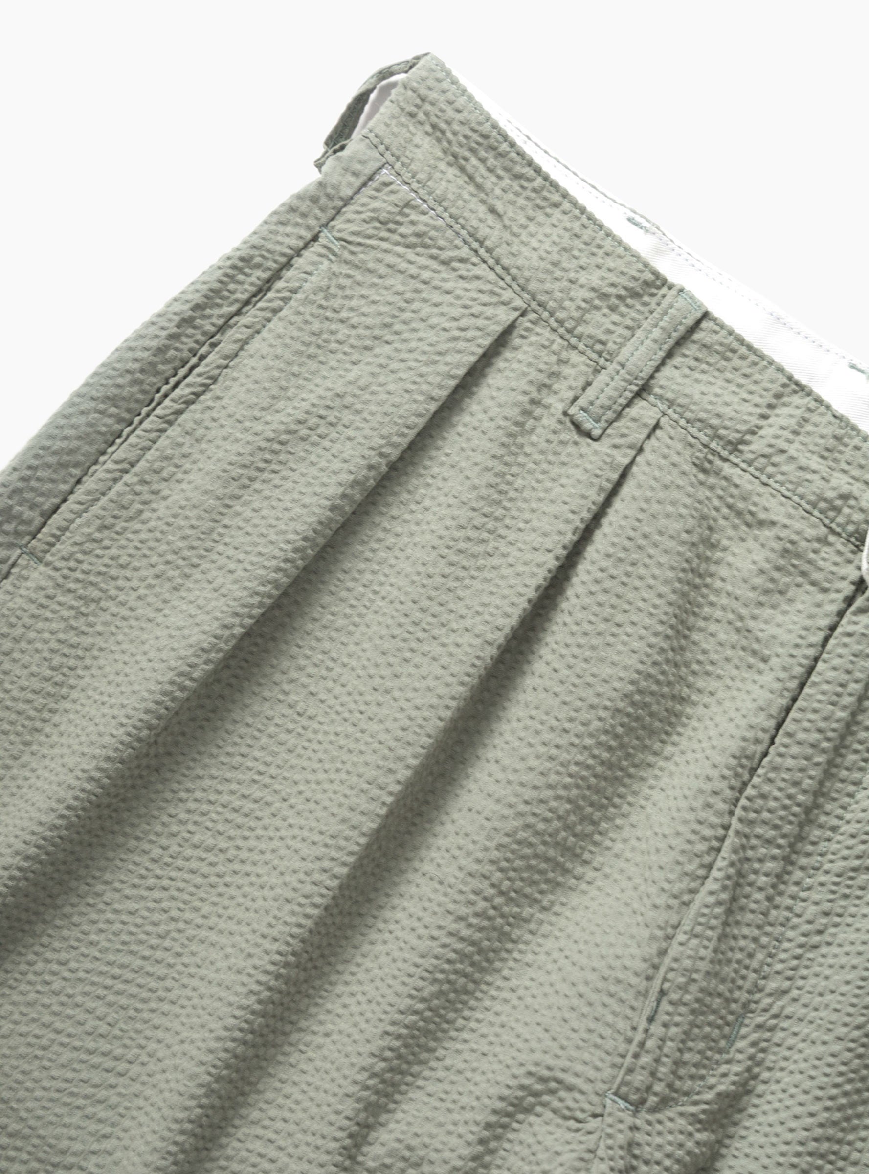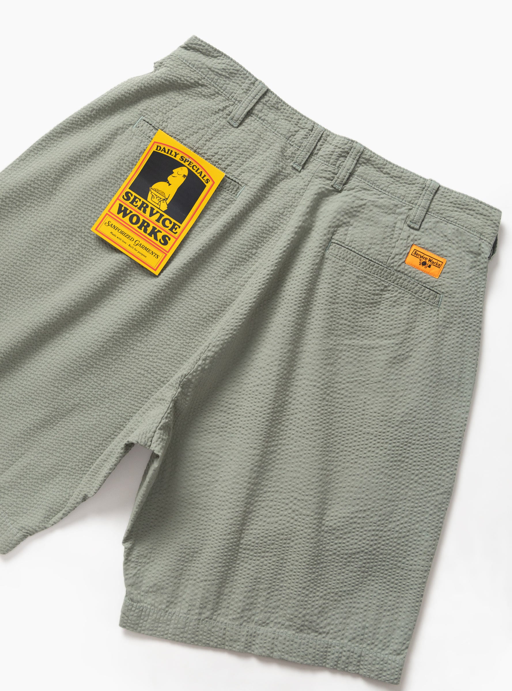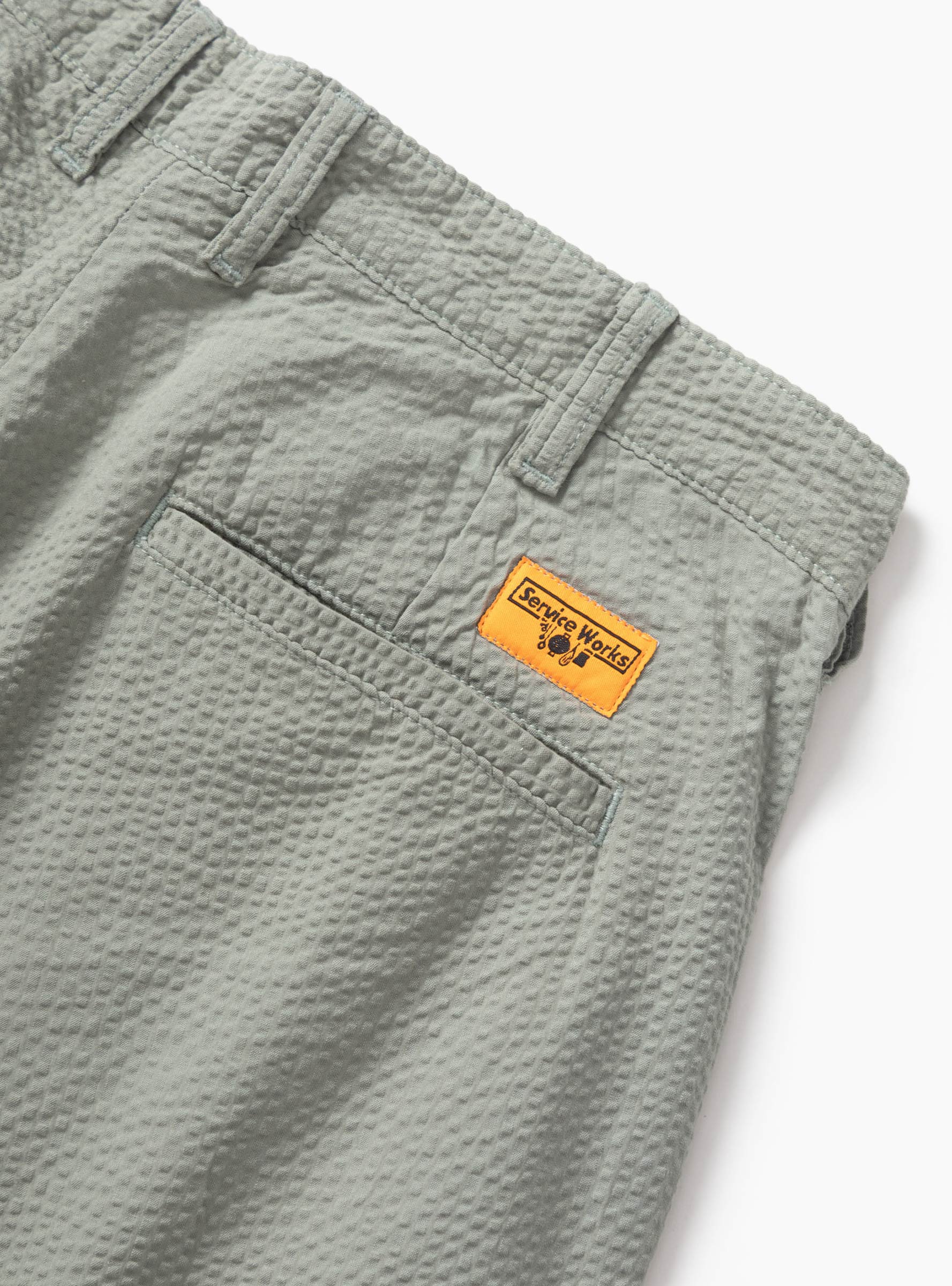 The Seersucker Part Timer Shorts come in Sage from Service Works and are made from GOTS-certified organic cotton seersucker. Garment dyed for subtle depth, they feature double front pleats and a zipper fly with button closure. Functional details include belt loops, rear pockets, and a woven label.
