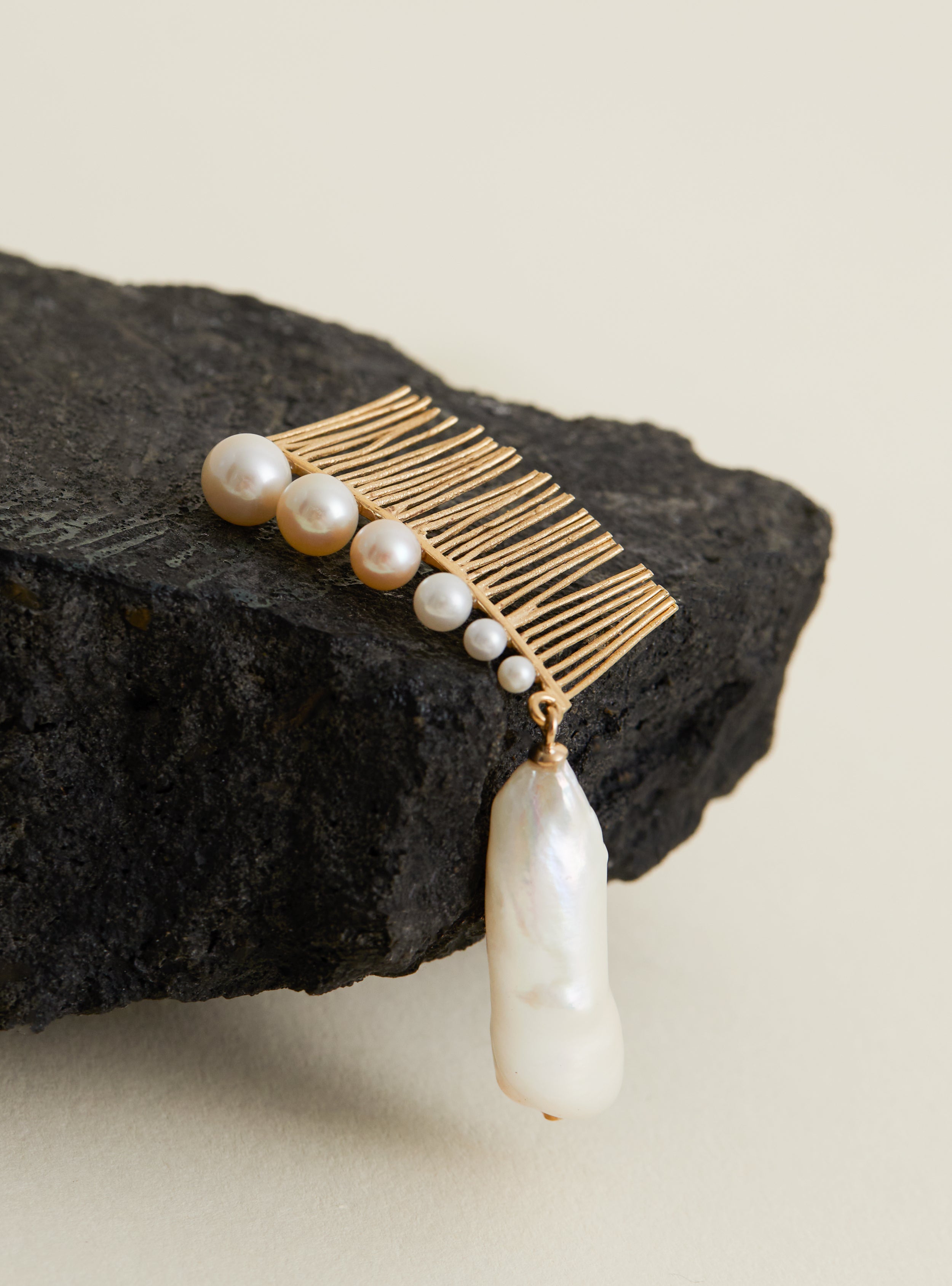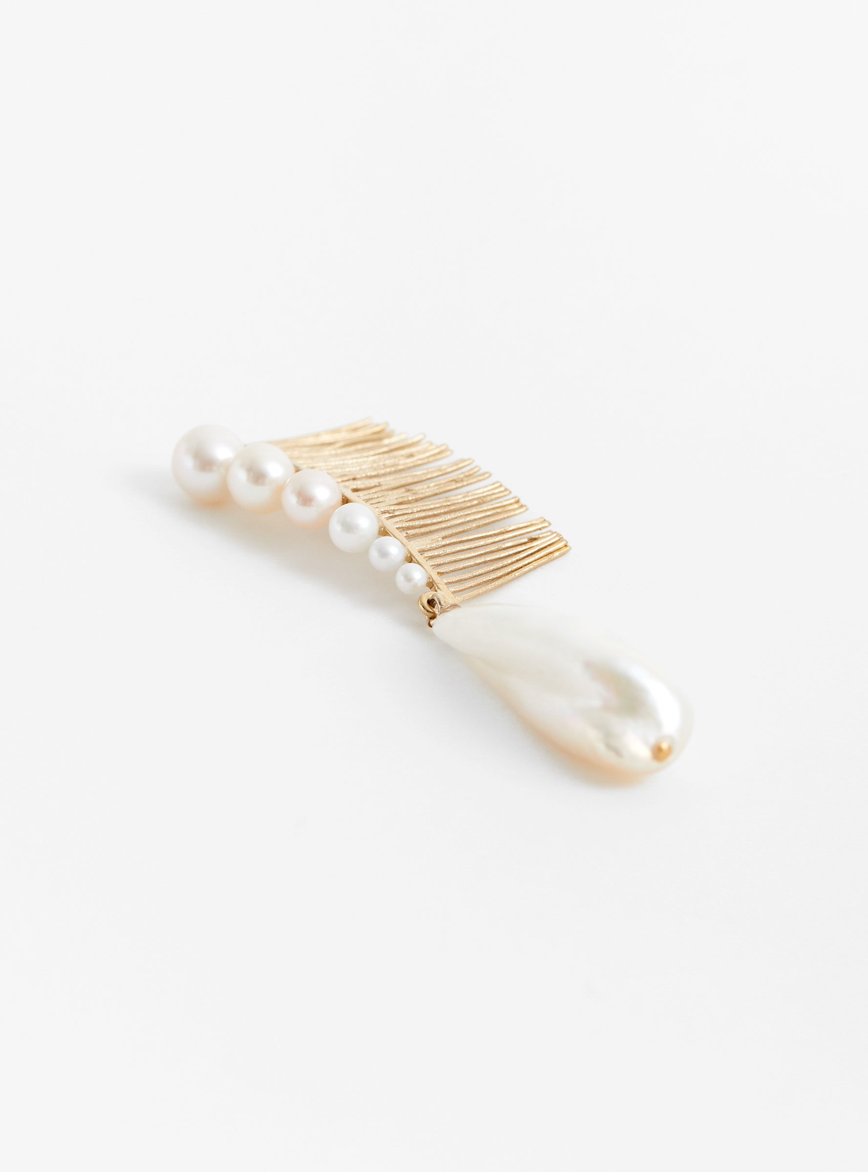 This Sister comb from BEATRIZ PALACIOS is handmade in Spain from gold-plated silver with a freshwater pearl handle and coordinating embellishments.