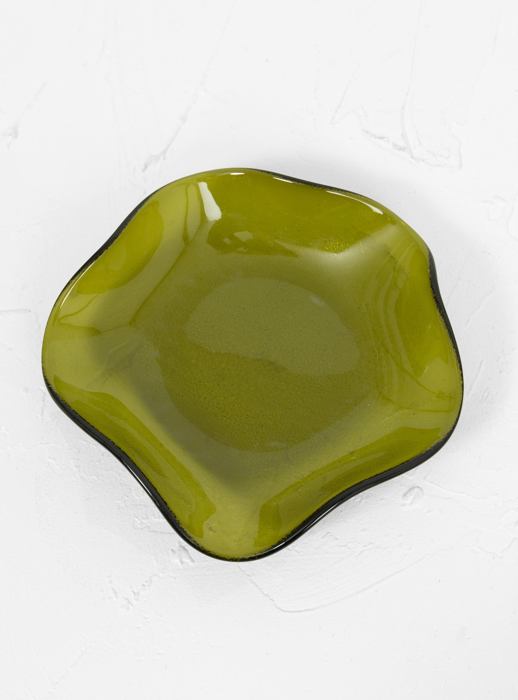 The Petal Plate from Sophie Lou Jacobsen is hand-made in New York City. Coming in an olive colourway, the opaque bowl takes a delicate petal shape with curved edges. It is made using a process called slumping, where the plate is shaped in ceramic and then cast in plaster, and glass-discs are heated in a kiln and slumped over the mould.