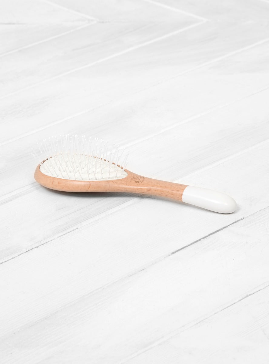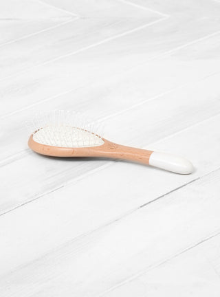 Suitable for all hair types, the Small Wooden Detangling Brush from Parisian brand Bachca has flexible nylon pins that detangles hair with ease and avoids breakage. The ball tip pins are sat on a rubber cushion that protects and massages the scalp.