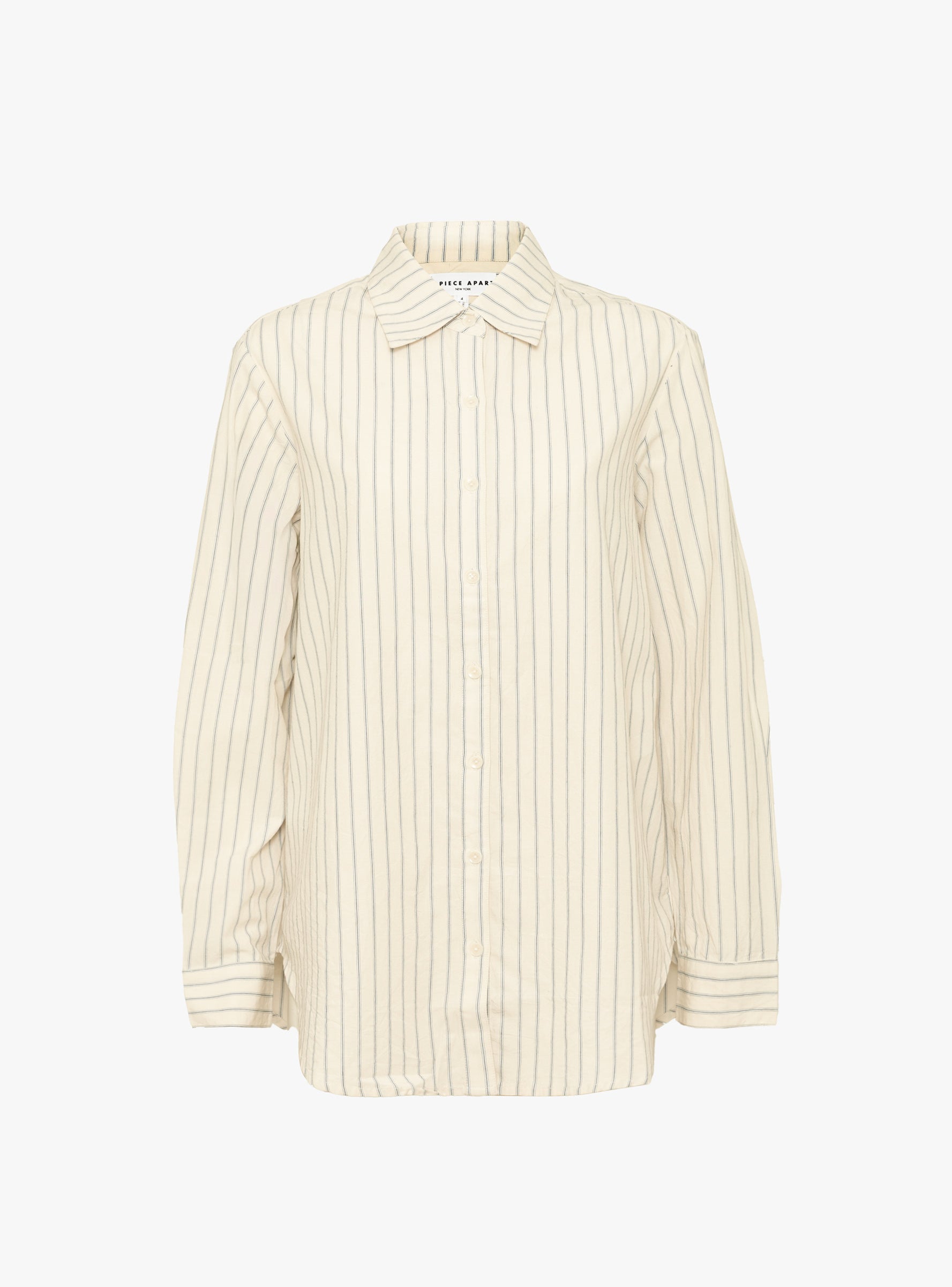 The Sodi Wrap Button Up from Apiece Apart comes in a cream and navy palette and is crafted from organic cotton. Designed with a relaxed silhouette, it features a classic shirt collar and front button placket, finished with a high low shirttail hem. An additional side button allows the shirt to wrap and cinch at the waist, offering a subtle shift in shape while maintaining an easy, everyday feel.