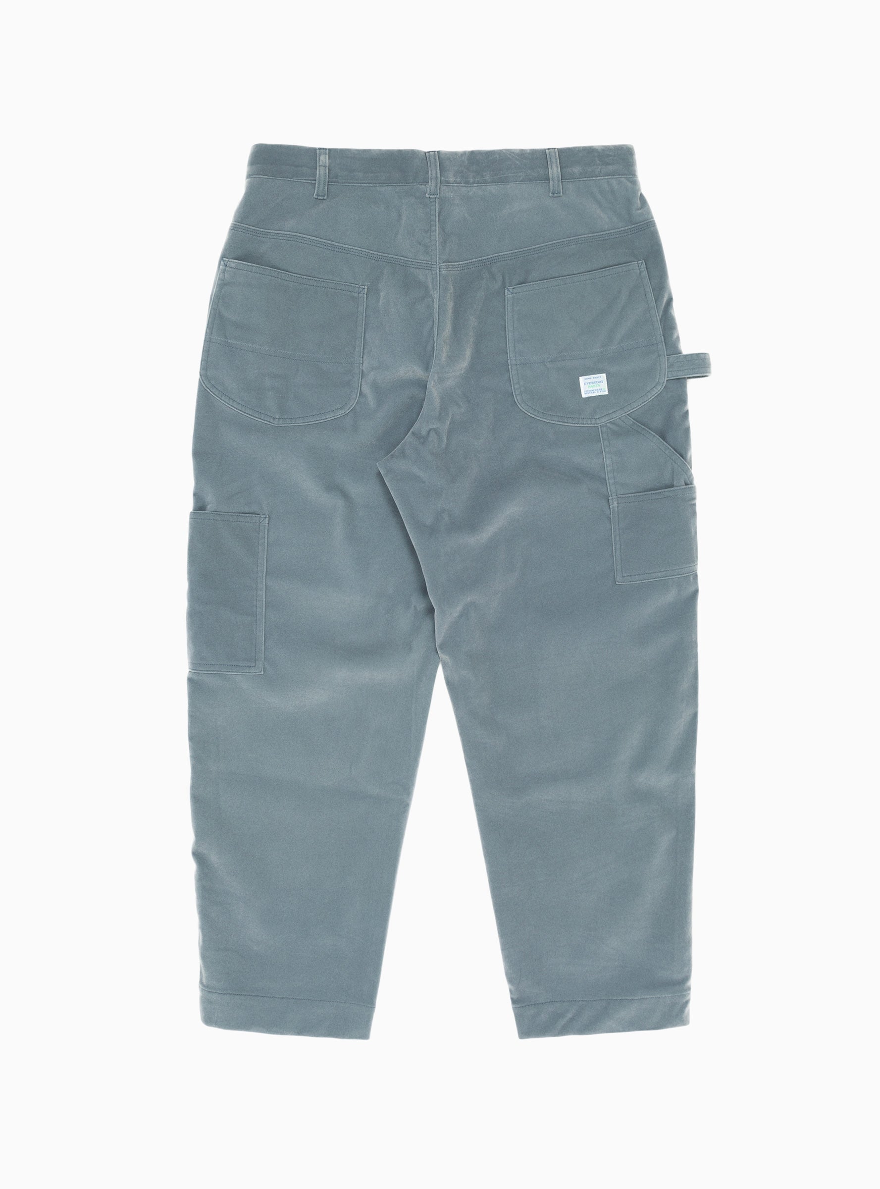 Inspired by traditional carpenter styles, these blue Staple pants from Home Party’s SS24 collection are made from plush blue velvet, sourced from Nagoya, Japan. Cut to a loose silhouette with tapered legs, they feature self-fabric knee patches and hammer loop detailing.
