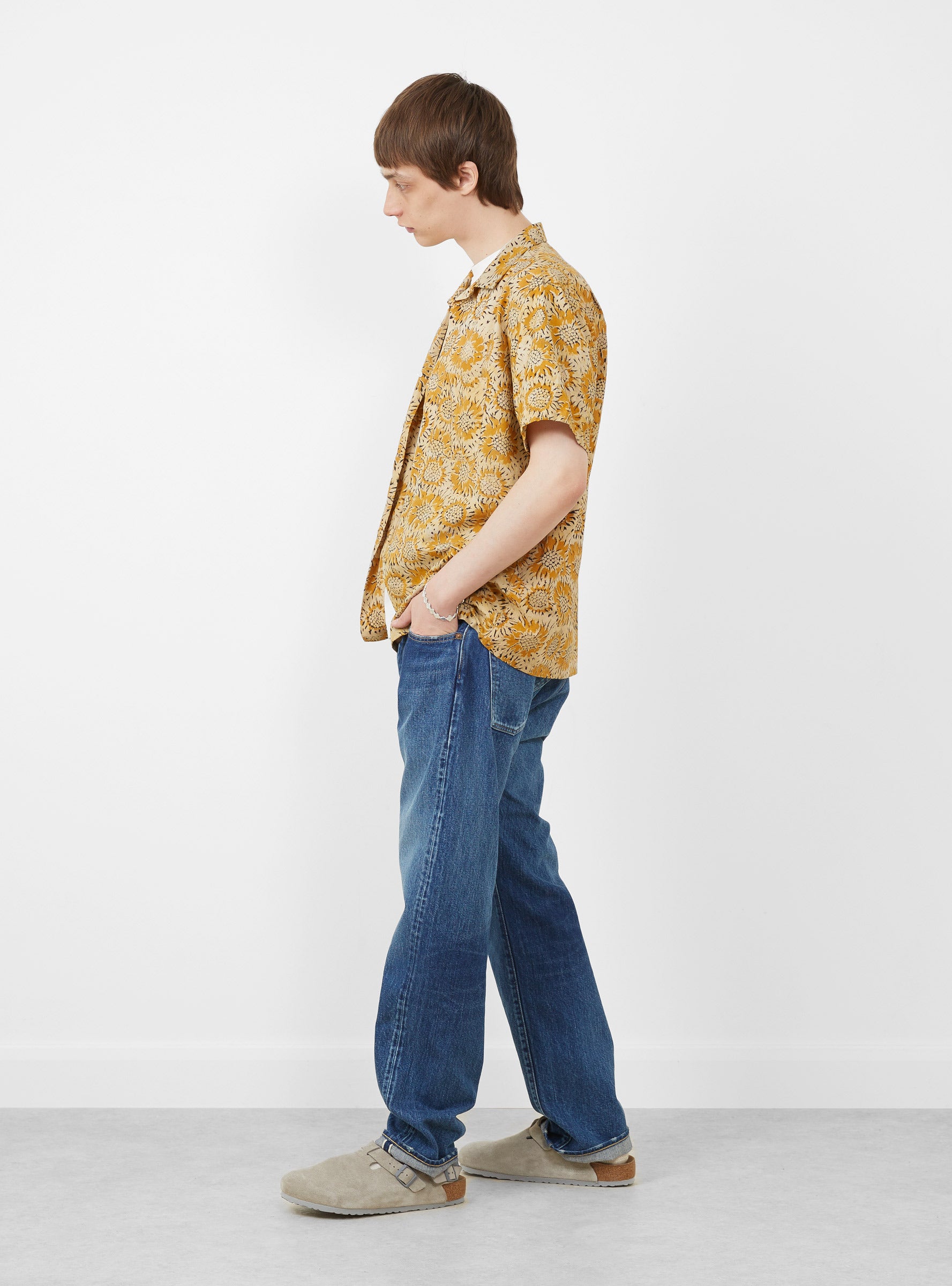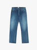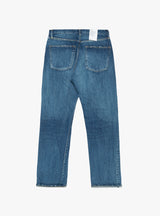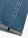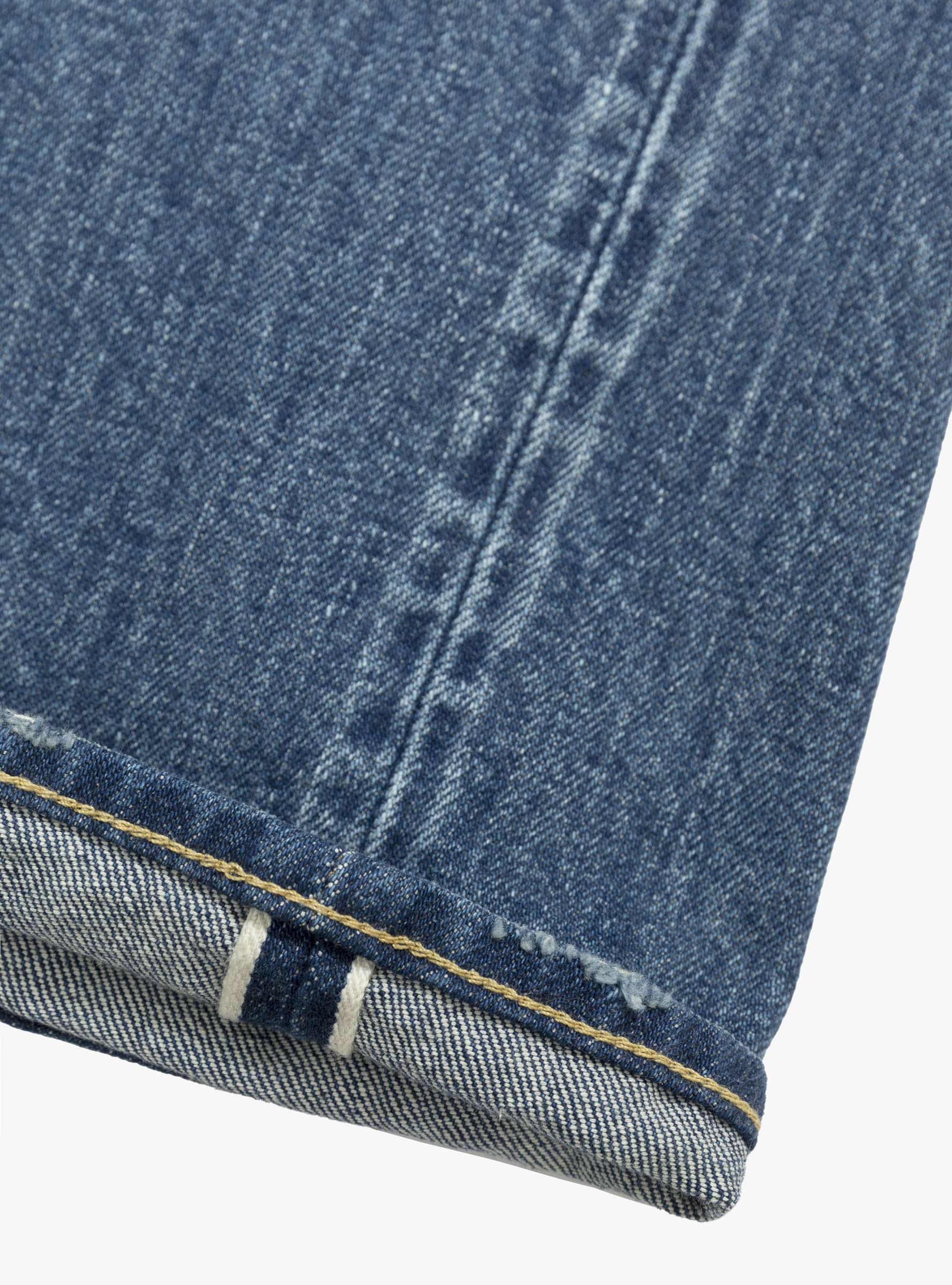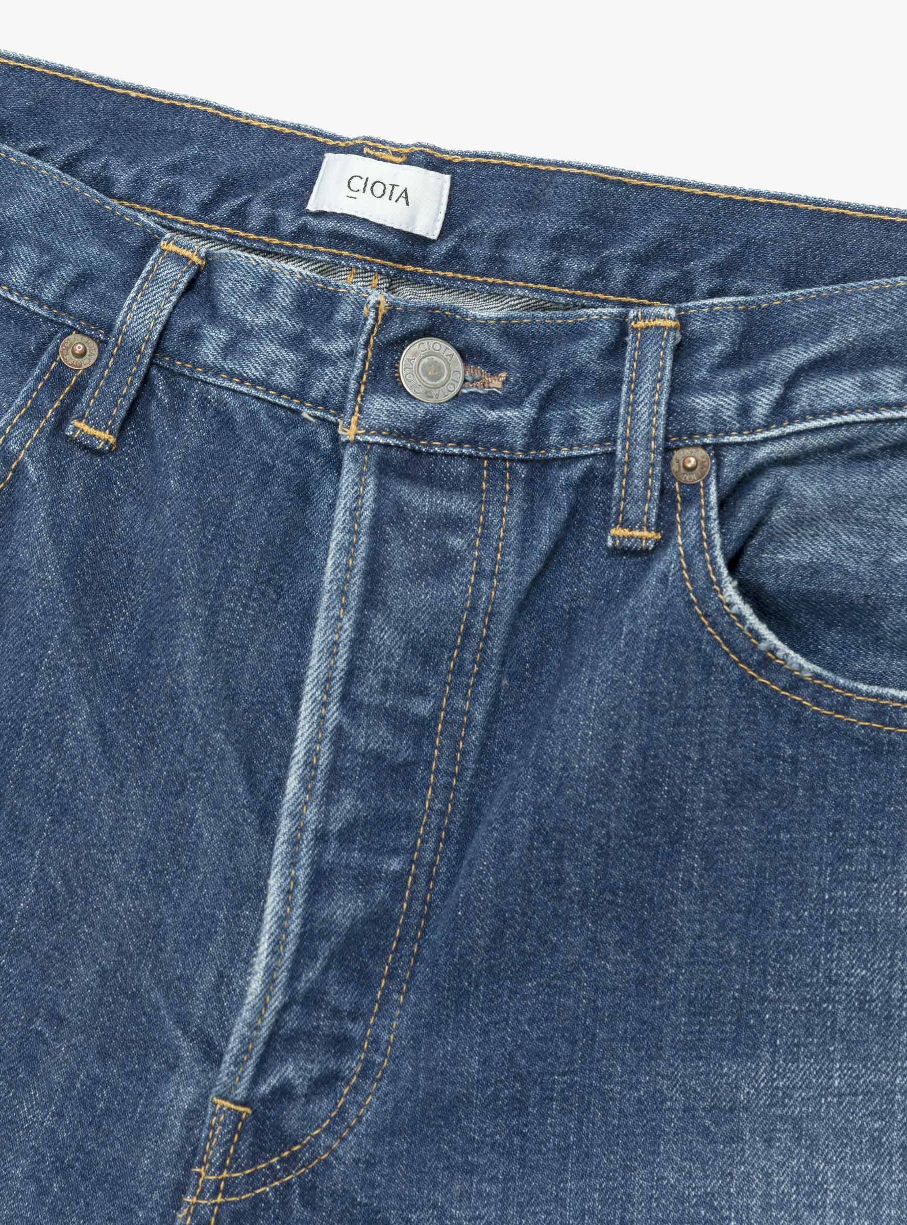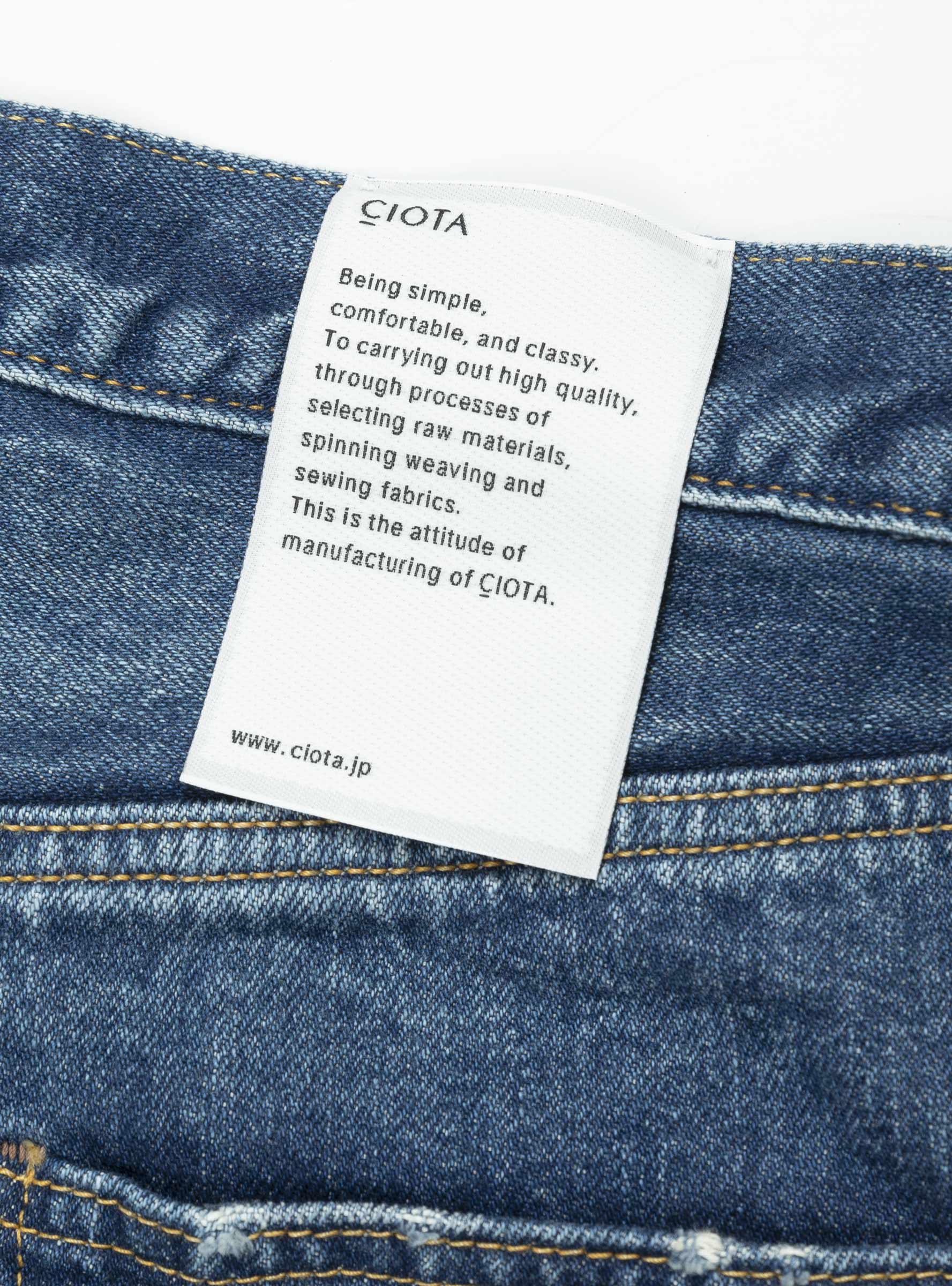 CIOTA's Straight 5 Pocket Pants in Medium Dark Blue Damage feature raw, untreated fabric for an authentic feel. Made from soft Suvin cotton and woven on a vintage shuttle loom, the selvedge finish develops distinctive wear over time. The design is finished with a rolled hem.
