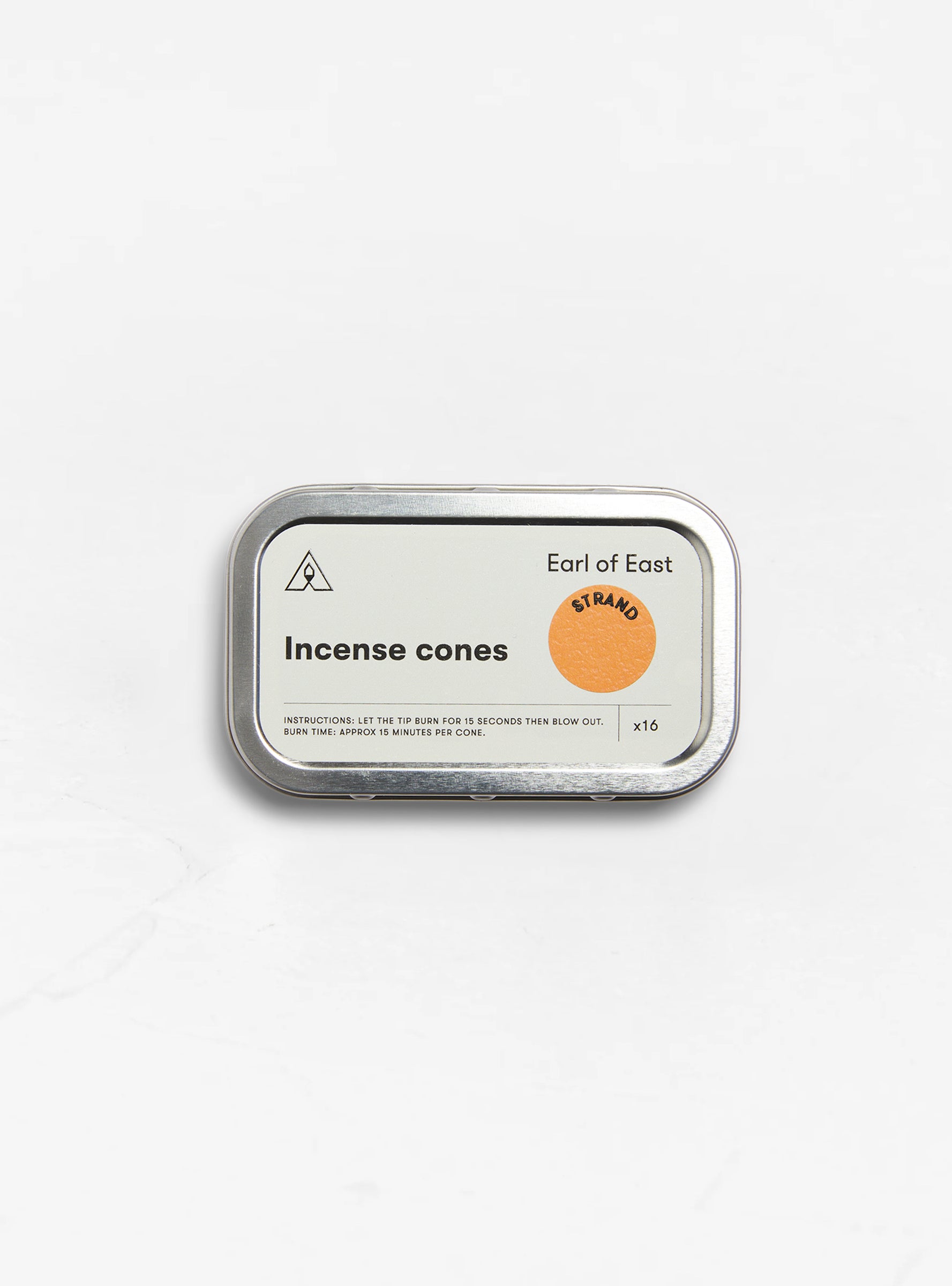 These Strand incense cones by Earl of East create a clarifying and invigorating scent. Each cone burns for approximately 15 minutes and each tin contains 16 cones.