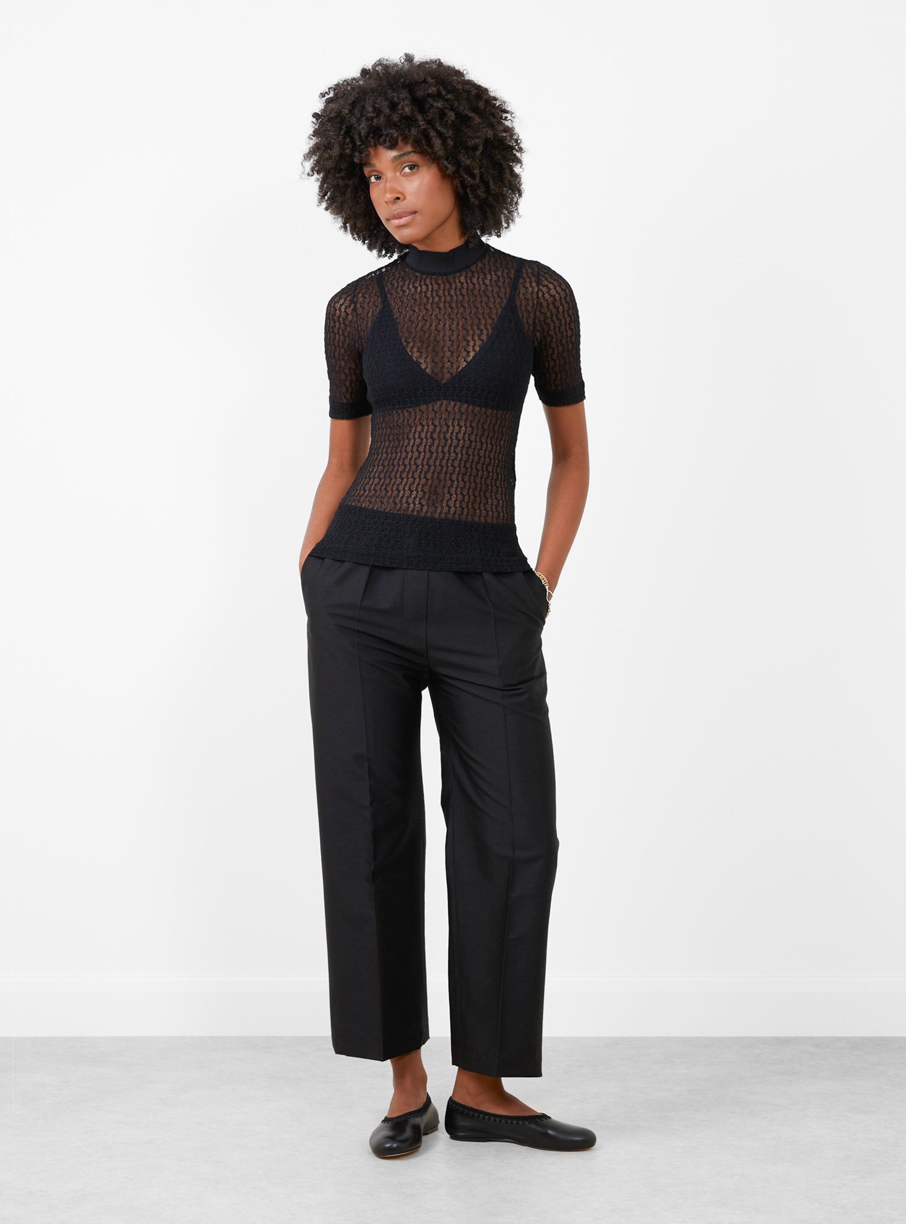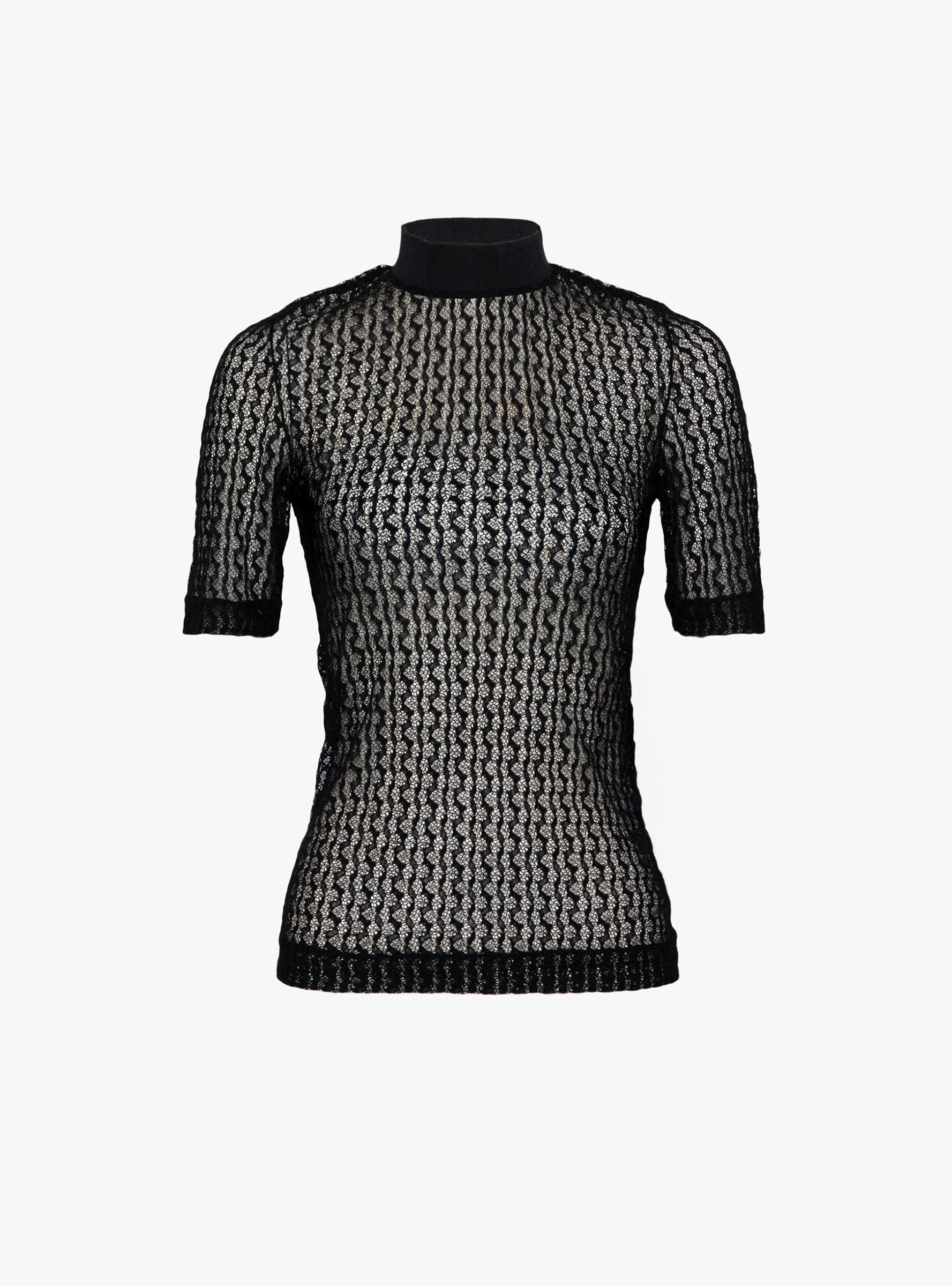 The Stretch Lace Short Sleeve Top from TOGA PULLA arrives in Black. Made in Japan from a stretch nylon blend, this fitted high-neck top features short sleeves and a semi-sheer lace construction. Designed as a versatile layering piece or standalone statement.