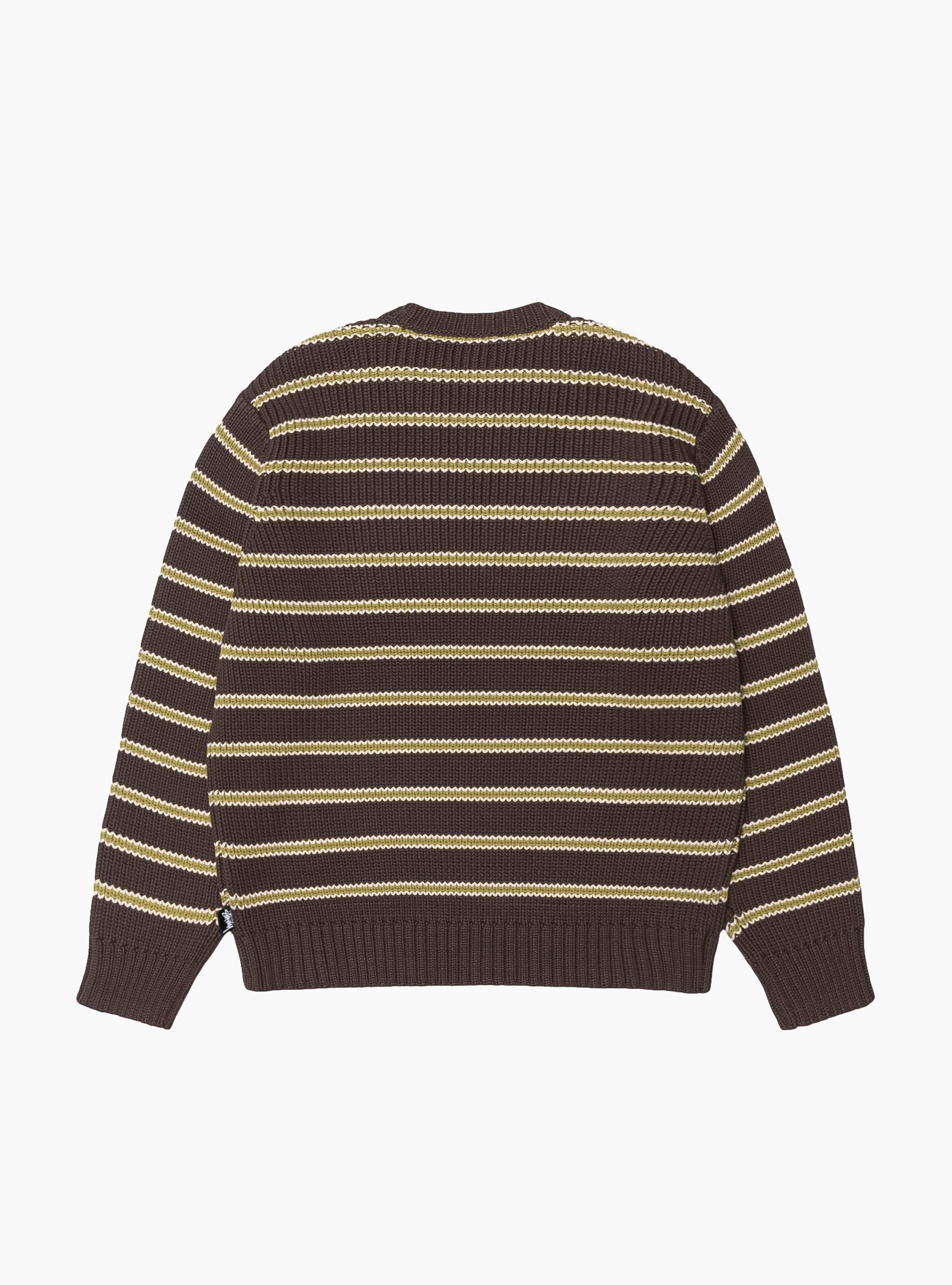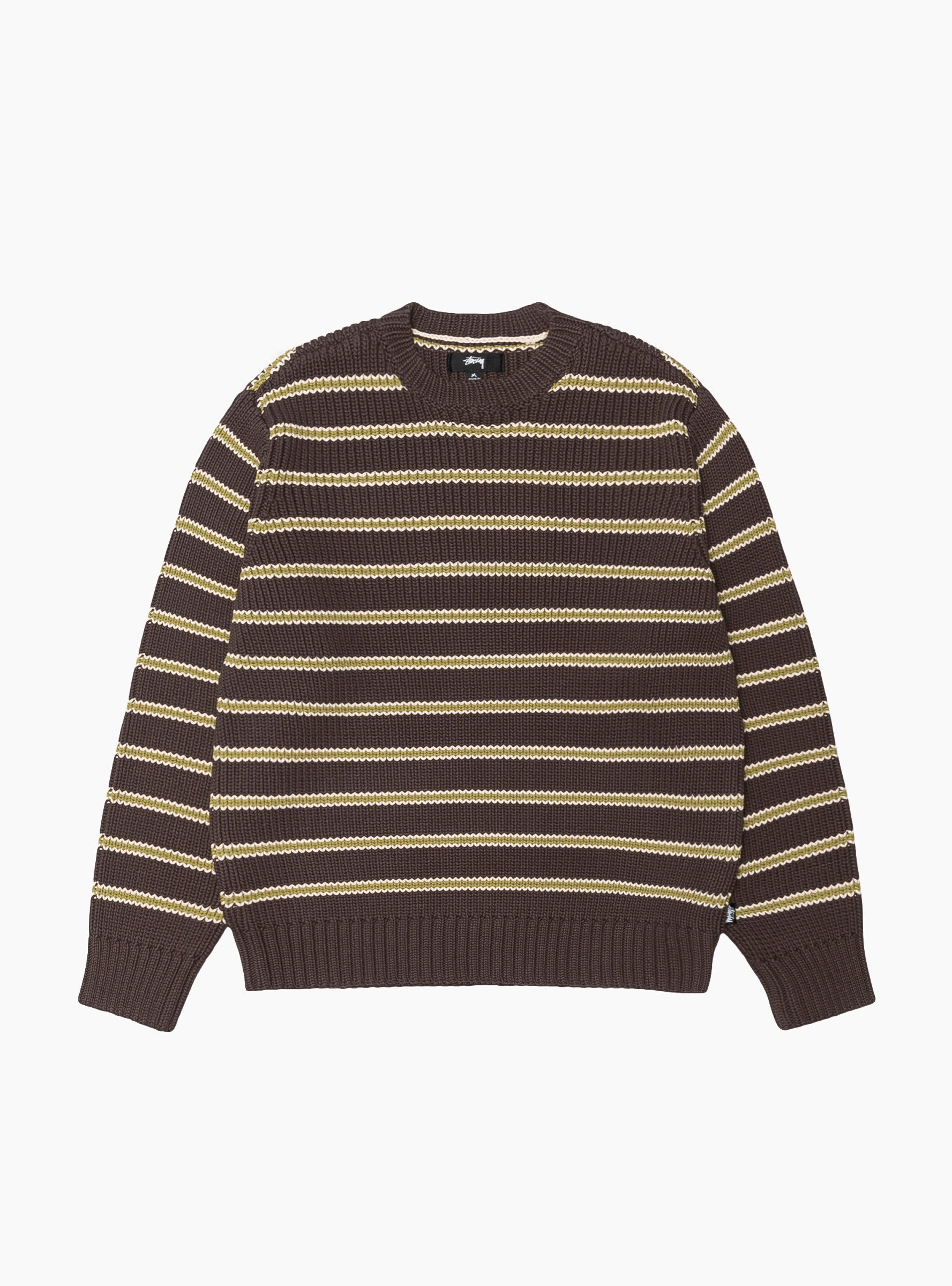 The Stripe Crew from Stüssy arrives in Forest. This relaxed fit crewneck sweater is knitted in a 3-gauge cotton and nylon blend, featuring a single ribbed neckline, double ribbed cuffs and hem, and a Stüssy big stock flag label at the side seam.