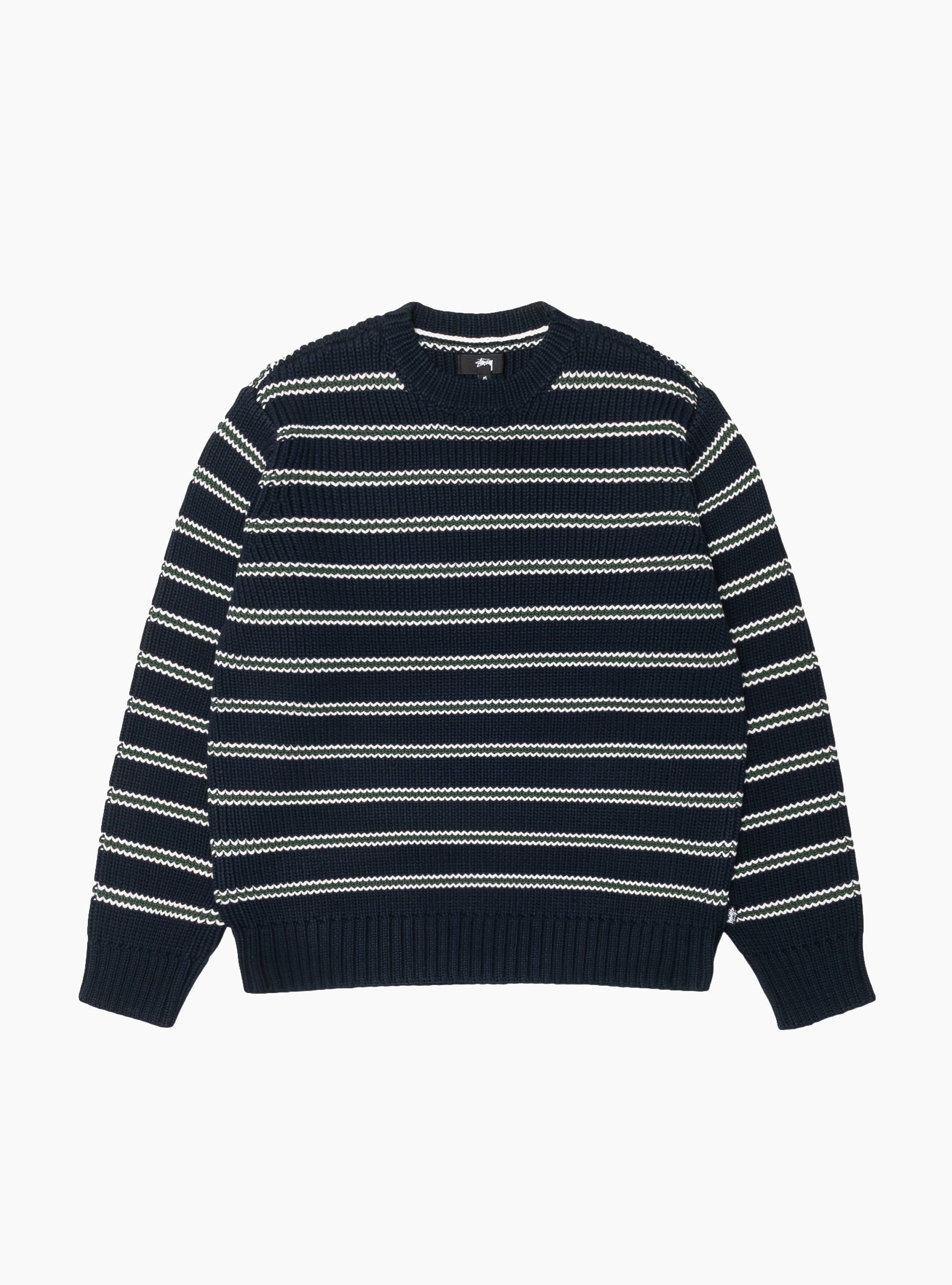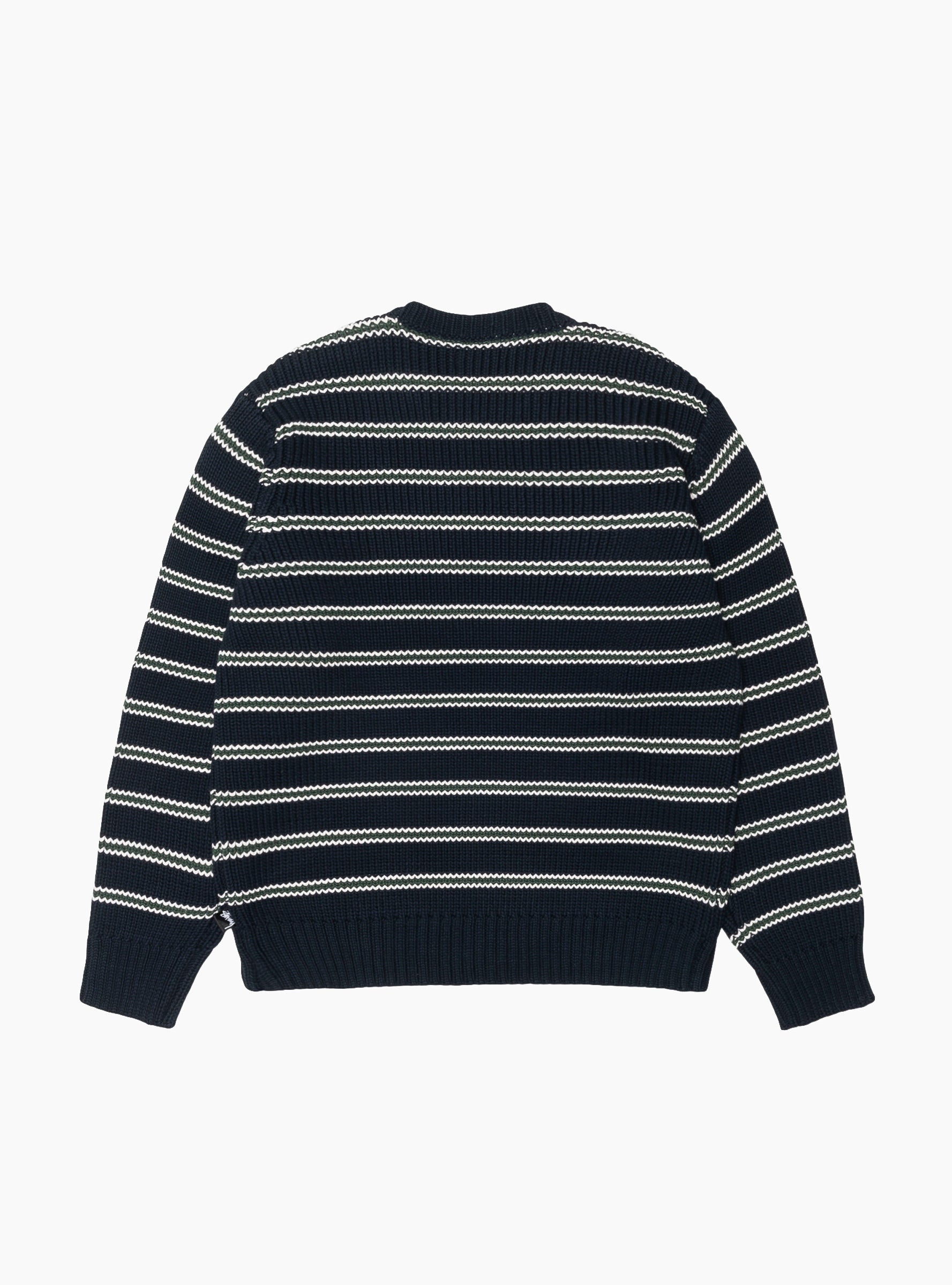 The Stripe Crew from Stüssy arrives in Ocean. This relaxed fit crewneck sweater is knitted in a 3-gauge cotton and nylon blend, featuring a single ribbed neckline, double ribbed cuffs and hem, and a Stüssy big stock flag label at the side seam.