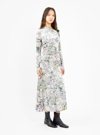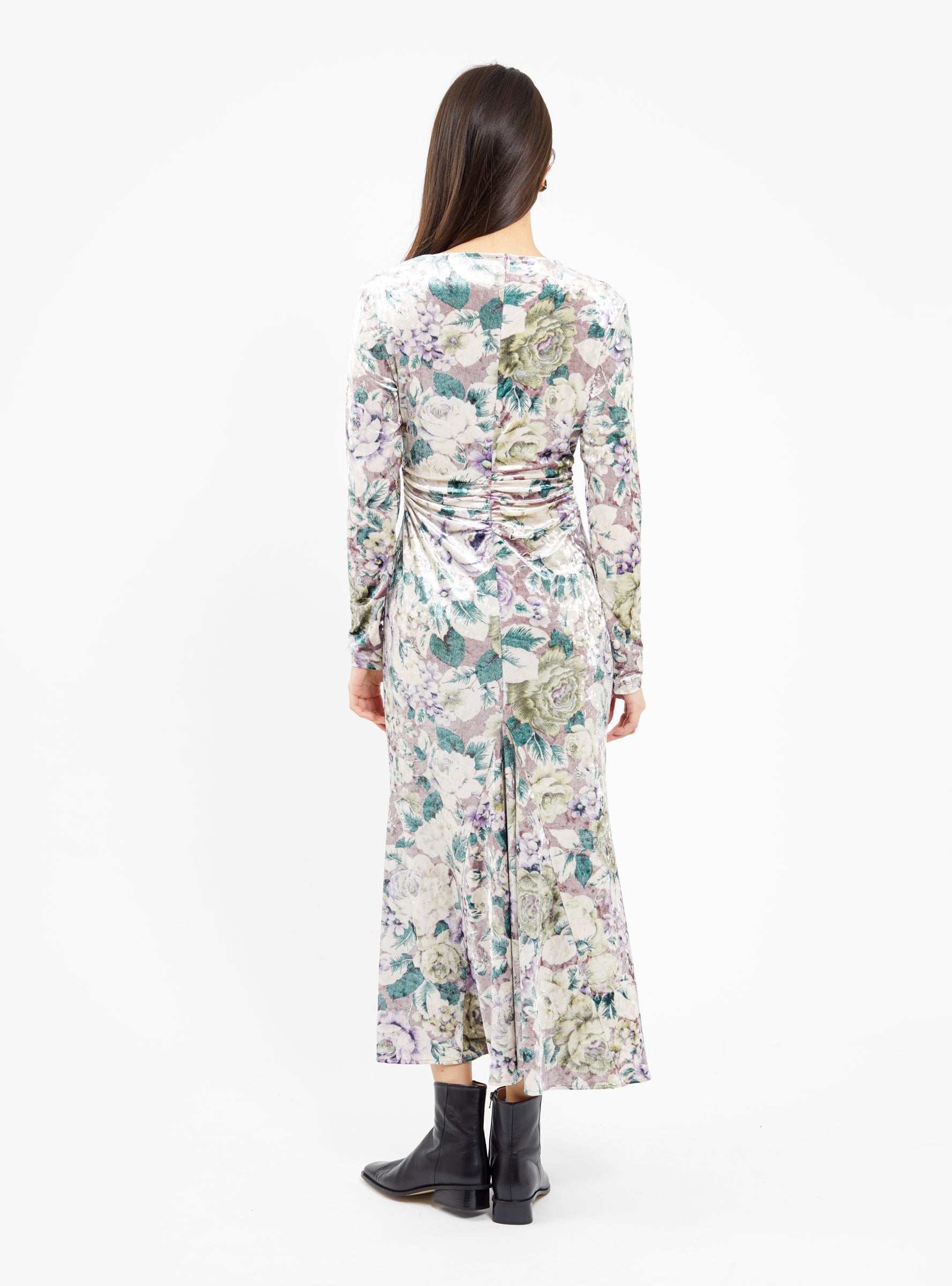 A signature of the label, Rachel Comey's Surveillance dress is reworked for the season in light-purple floral velour, with a touch of stretch for added comfort. Gathered at the side and back, it forms to the body before falling to a flared godet skirt.