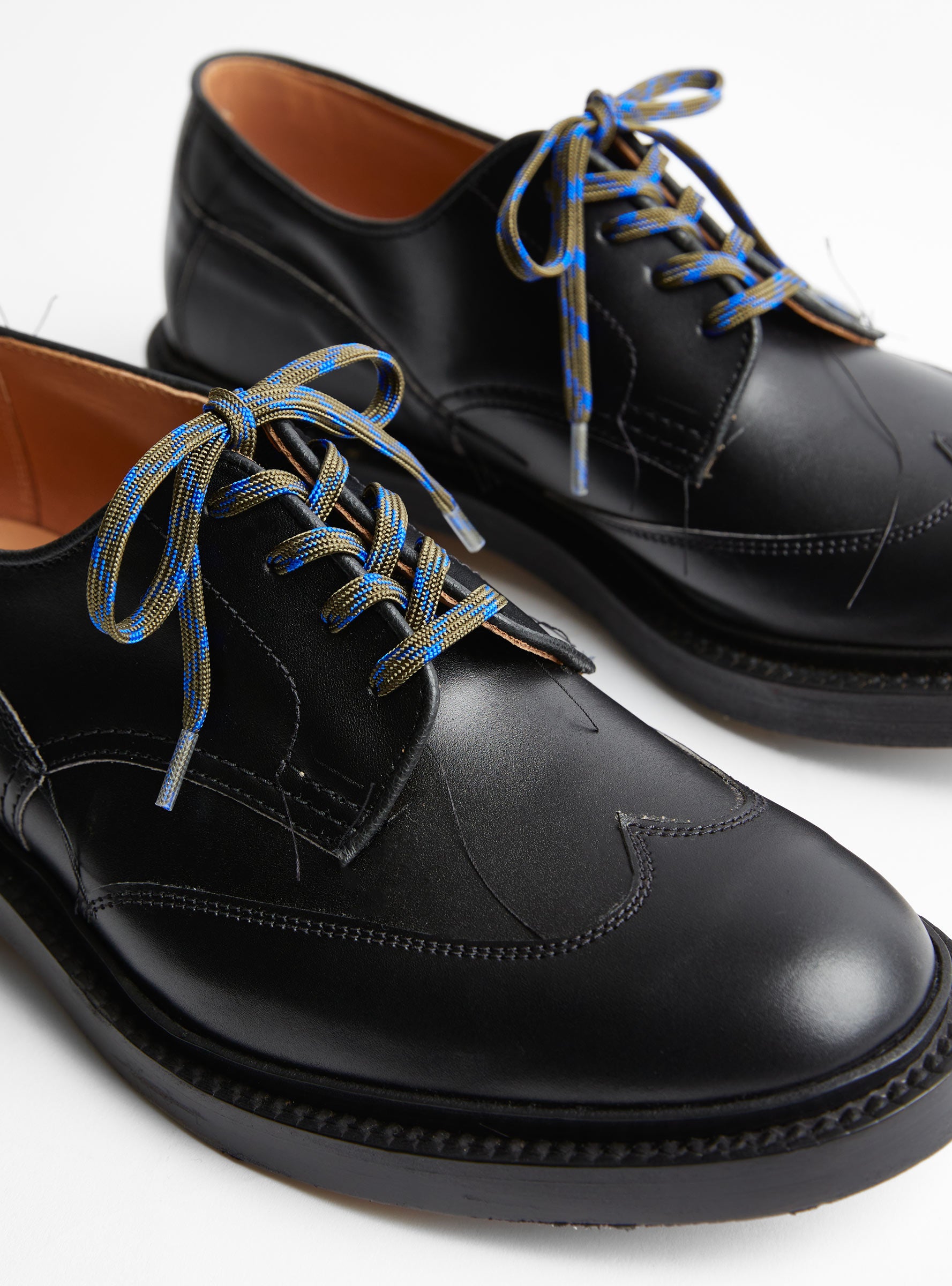 The TDR x Tricker's Austerity Derby arrives in Black. Made in the UK from 100% leather, these shoes draw on post-WW1 austerity designs, when materials and time were limited in Britain. The construction removes broguing and simplifies finishing to reduce factory operations, leaving stitching unfinished and soles with natural factory marks. Soft deer leather is used in the tongue area for comfort, while minimal broguing on the outer heel symbolises hope for a return to fully finished shoes. The shoes come with a pair of Japanese Vincent Shoe Company laces.