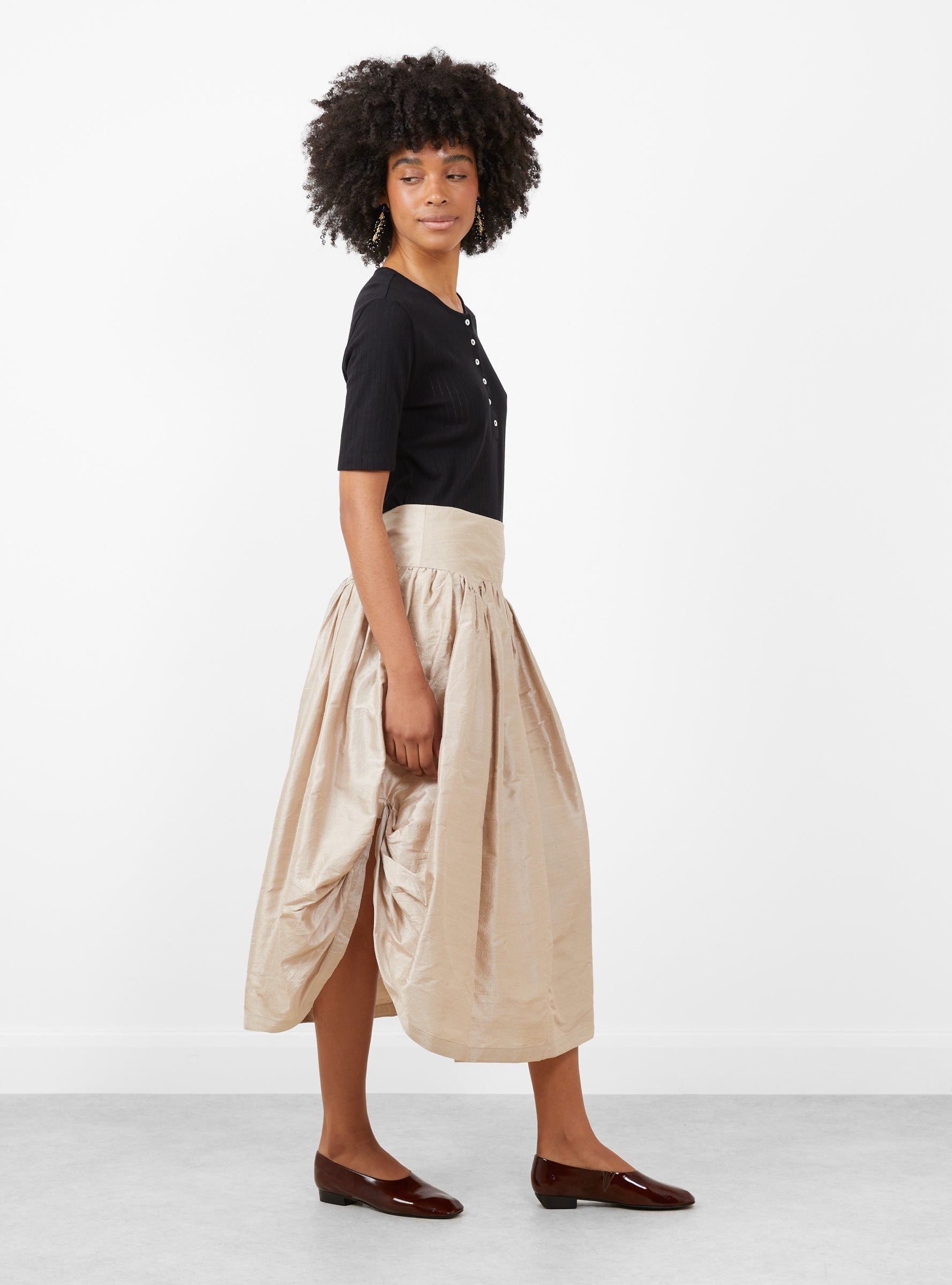 The Terra Skirt in Steel Grey from Rachel Comey is a full-length silk skirt with a drop waist, featuring ruching and gathered sides for a softly draped silhouette. Crafted in the USA from pure silk, the skirt offers fluid movement and a refined handfeel.