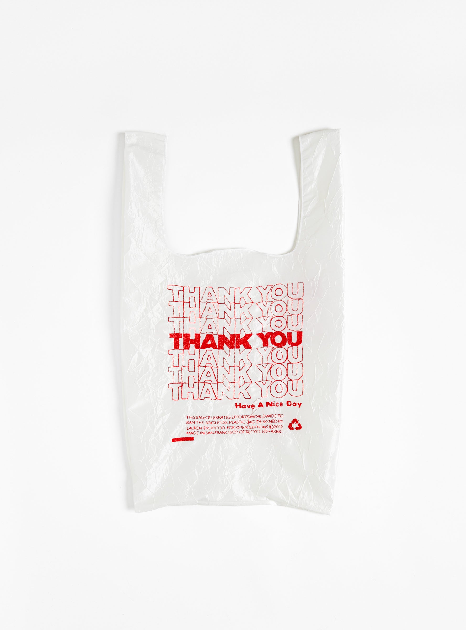 The Thank You Bag in Red on White features intricate embroidery of an illustration by artist Lauren DiCioccio, designed to resemble a single-use plastic bag. Crafted locally from recycled materials in San Francisco, the sturdy and washable tote is part of a series celebrating global efforts to continue the 'ban on the bag.' This thoughtful, everyday accessory serves as a reminder to reuse and recycle.