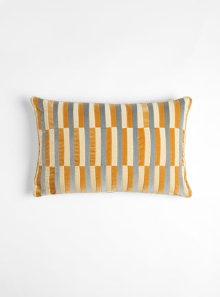 The Thea Cushion by Christina Lundsteen is crafted from a premium velvet and features a bold geometric motif in an orange and blue colourway. It's filled with small feathers with a high concentration of down, offering both comfort and design.