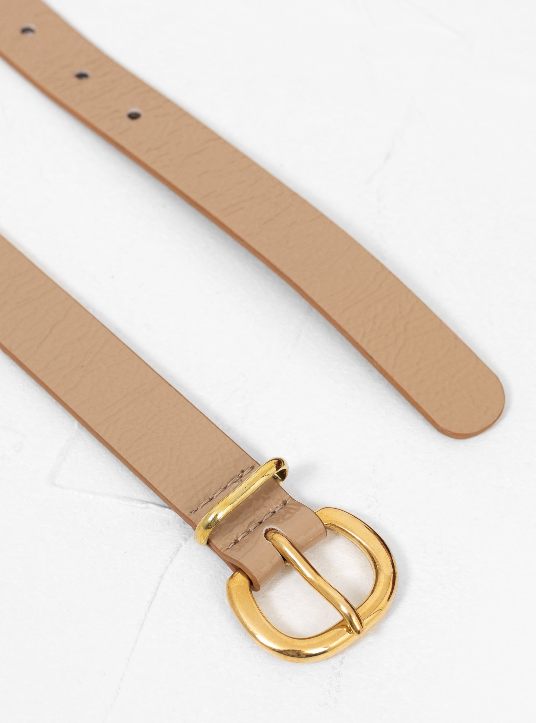 Made in Peru from crinkled patent leather with gold-tone metal hardware, this tan This Estate belt from Rachel Comey is perfectly sized for tailoring, but works just as well cinching oversized outerwear.