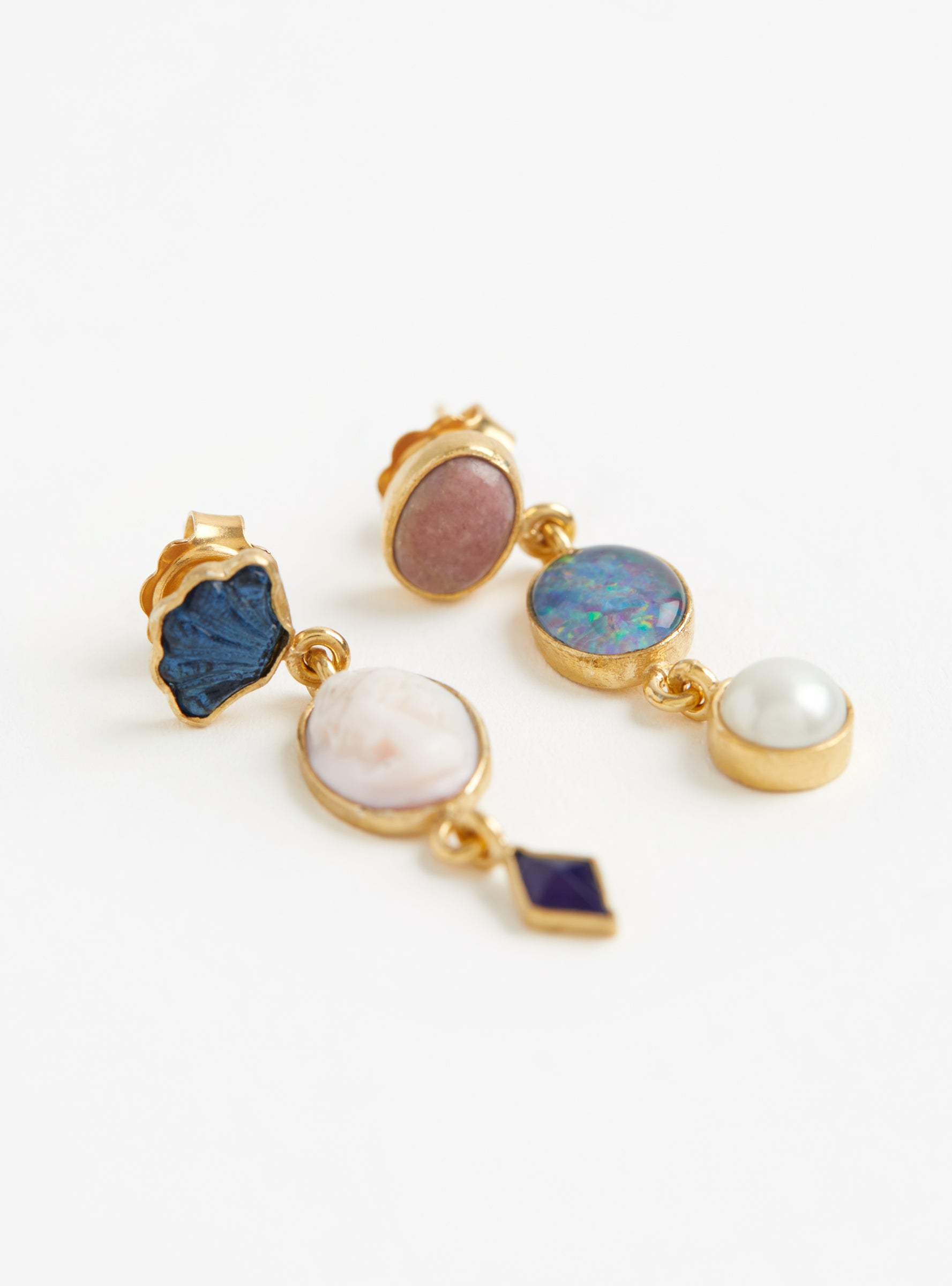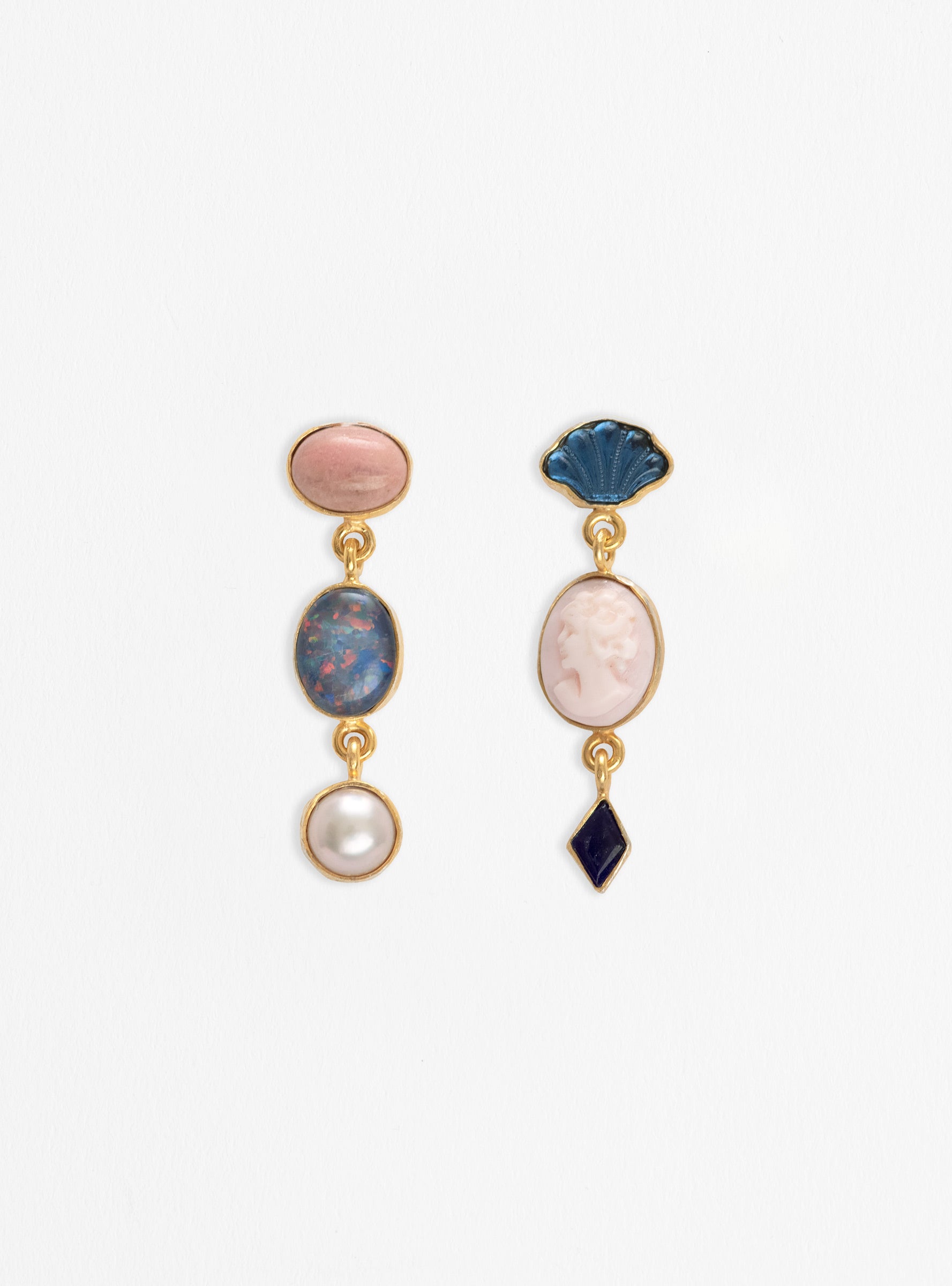 The Three Charm Moving Drop Earrings come in Pink Pearl from Grainne Morton and are crafted in the UK from 18k gold-plated silver. Each earring features a mix of cameo, opal, pearl, rhodochrosite and vintage glass charms that move freely for a playful, layered effect.