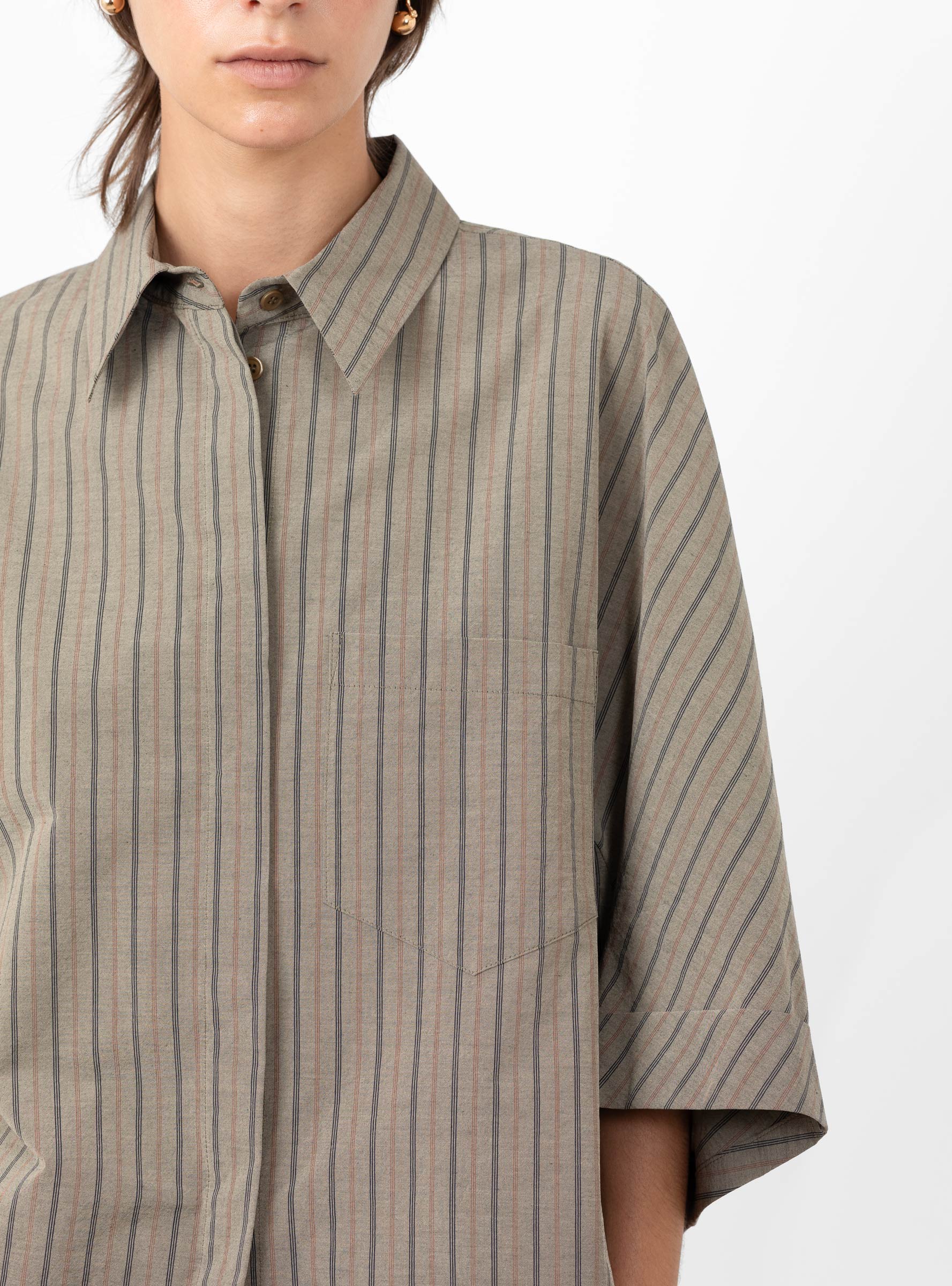 The Tialle Cropped Shirt from Christian Wijnants arrives in Olive Marine Stripe. Cut from soft yet structured 100% cotton, this oversized shirt features an olive and marine stripe pattern. It has generous sleeves, a pointed collar, a single chest pocket and is finished with a curved hem.