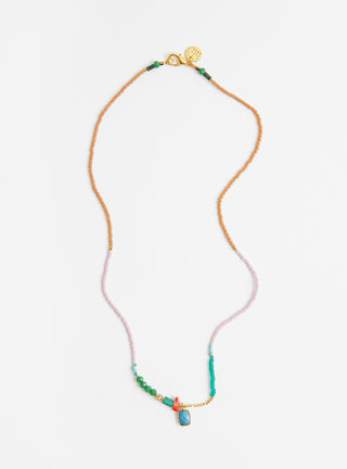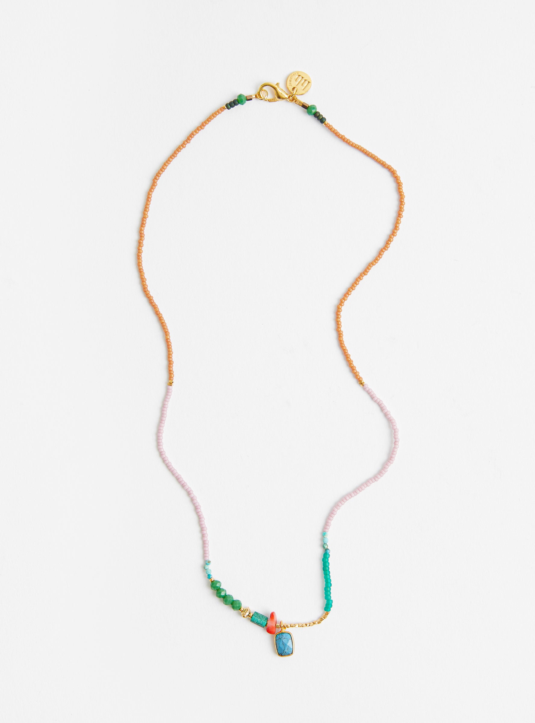 The Tiny Pressed Bead Necklace features a pressed turquoise charm paired with 24kt gold vermeil Hill Tribe beads, an ornate Turkish gold-plated bead, and green Afghan heishi beads. Accents of faceted turquoise, green crystal, red coral, and Japanese Miyuki seed beads add a vibrant touch.