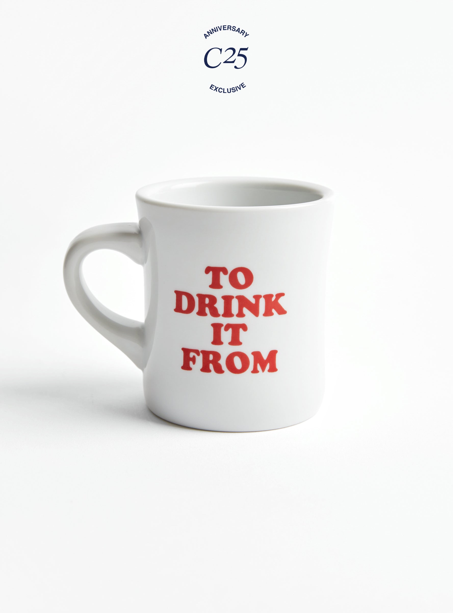 Created in celebration of 25 years of Couverture, the To Drink From Diner Mug is our playful take on a classic. Made from durable ceramic with a gloss glaze finish, it features a bold red print and a solid trim, paired with a curved, ergonomic handle for easy sipping. The shape is inspired by traditional diner mugs, chosen for its weight and familiar feel, while the red text nods to our in-store tote bags, flipping 'to put it in' into 'to drink from'.
