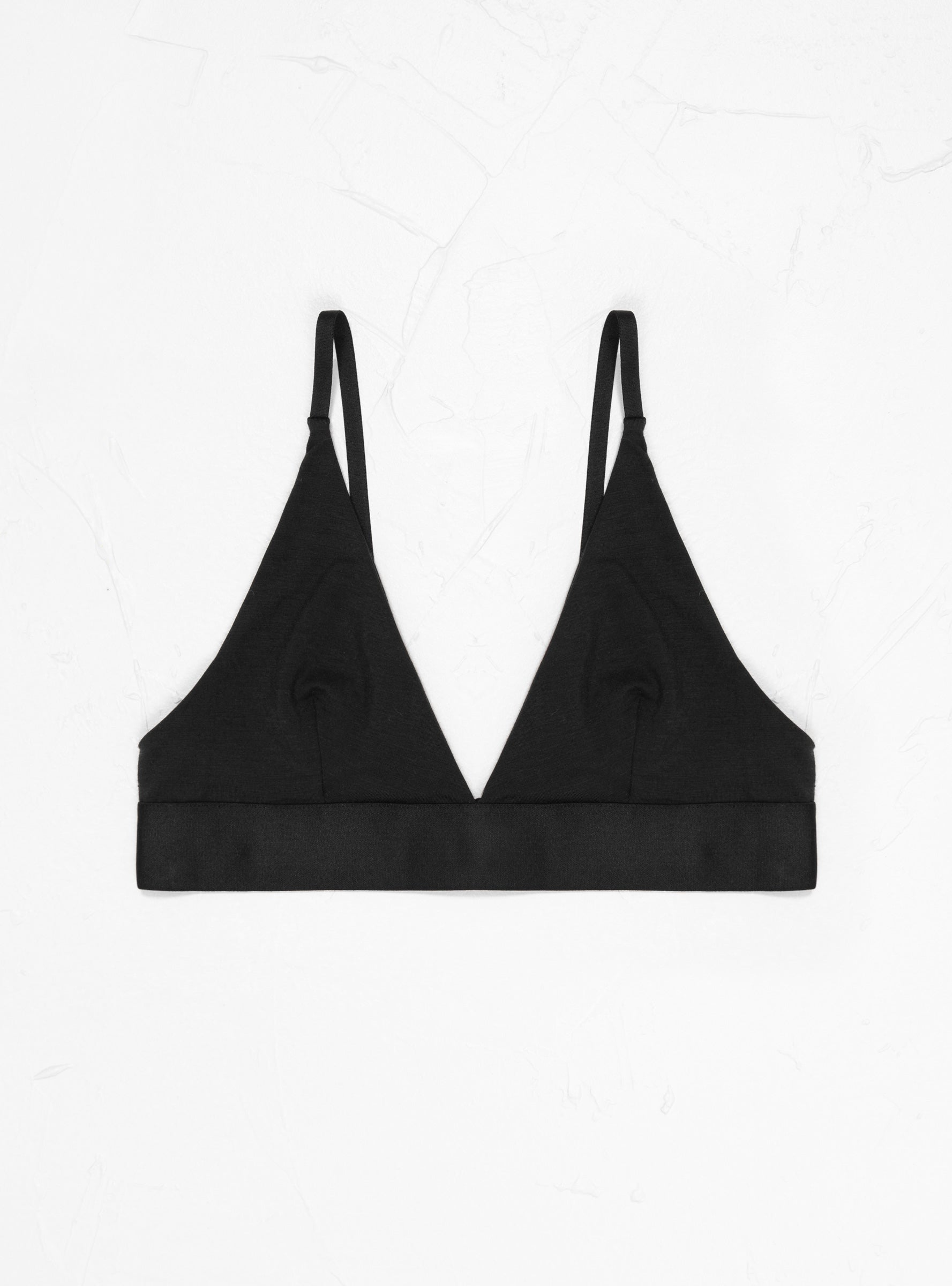 Made in Portugal from bamboo lyocell-blend jersey, which incorporates an element of stretch for added comfort, this Core Black Triangle bra from Baserange features thin, adjustable straps and an elasticated underband for optimum support.