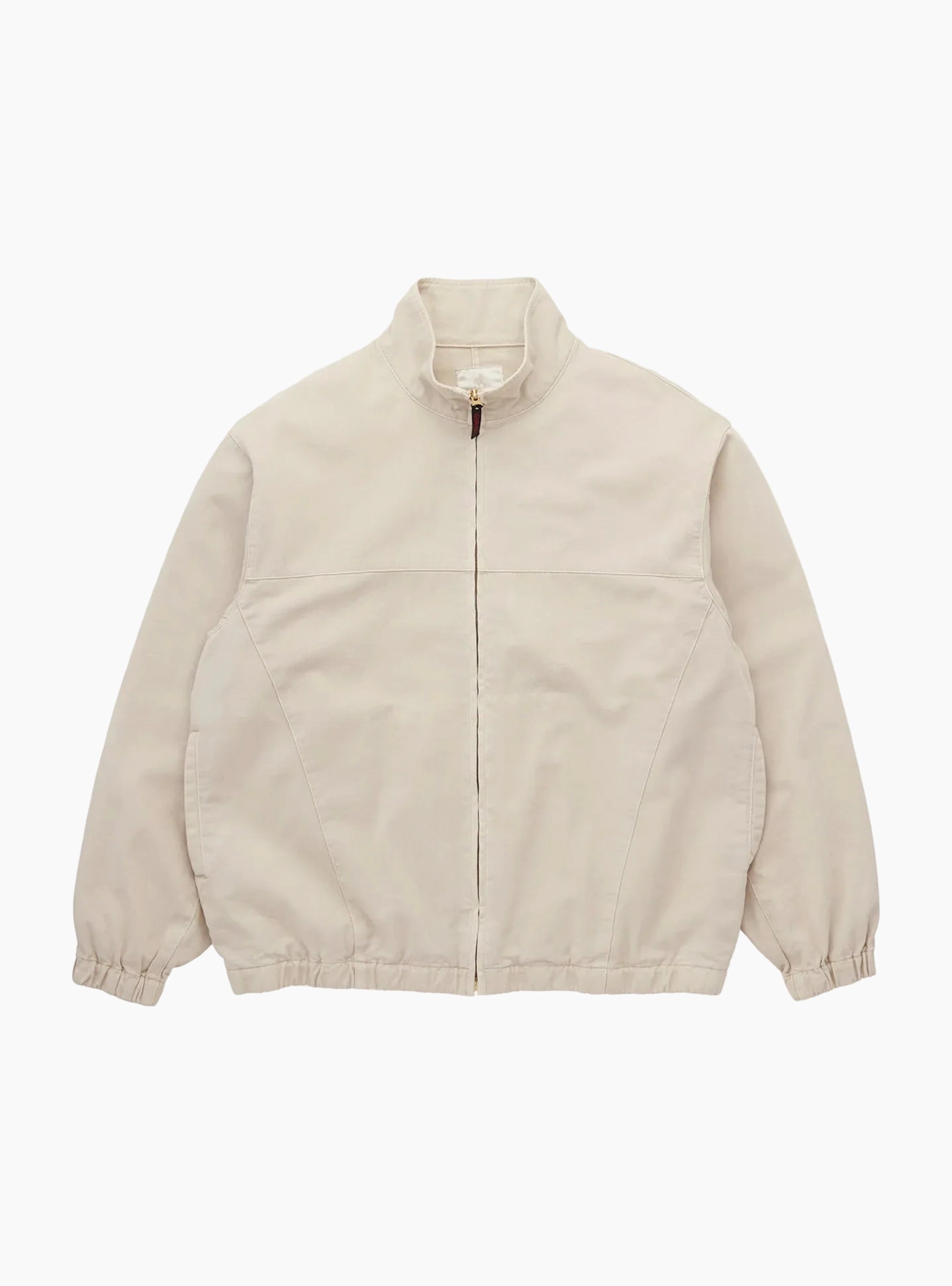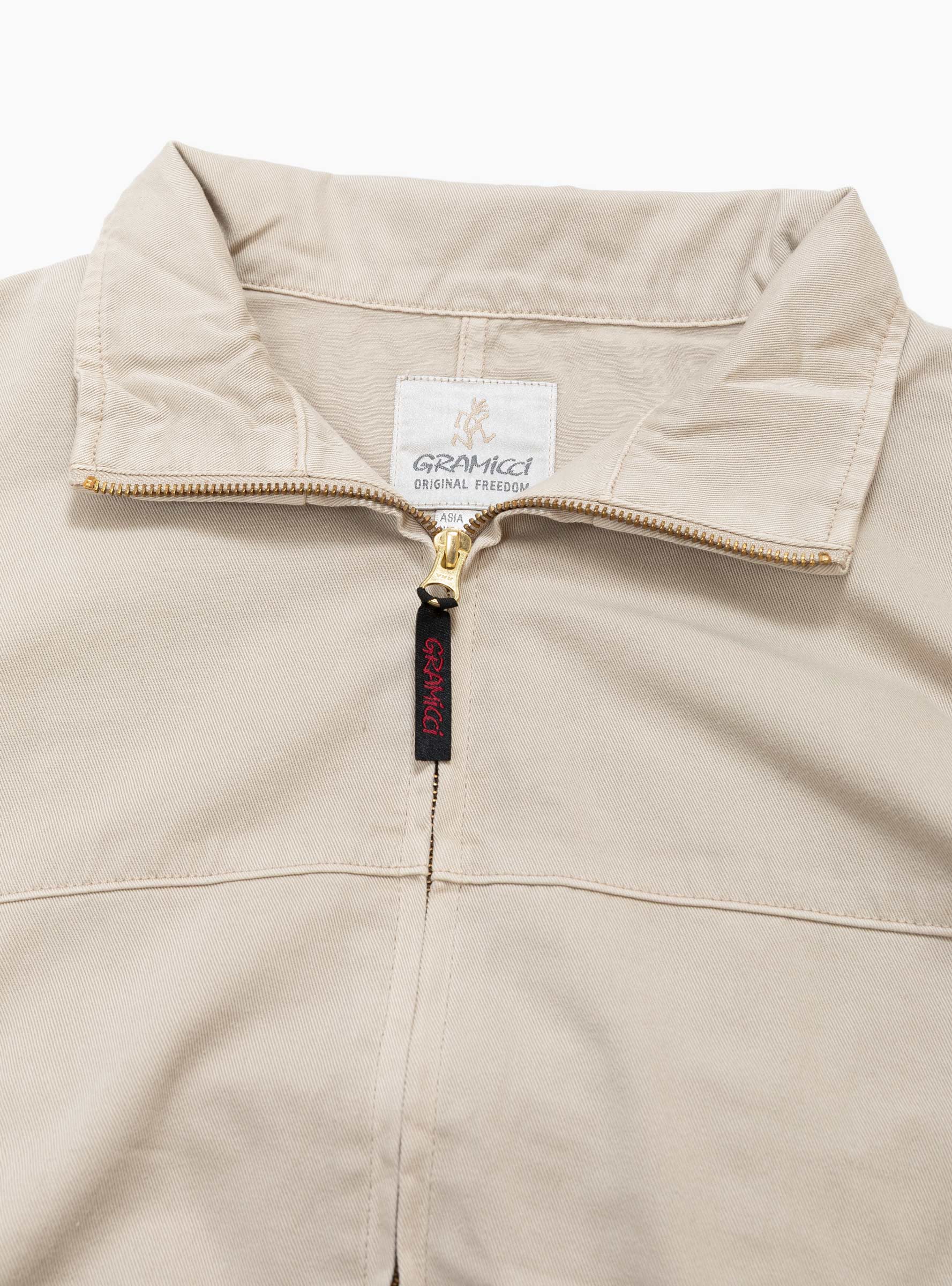 The Twill-Around Jacket comes in Sand Pigment from Gramicci and is made from 100% eco-cotton. Cut from washed cotton twill, it has a relaxed silhouette designed for ease of movement. The jacket features a stand collar, zip closure, elasticated cuffs and hem, and two front pockets, making it a practical and versatile piece for everyday wear.