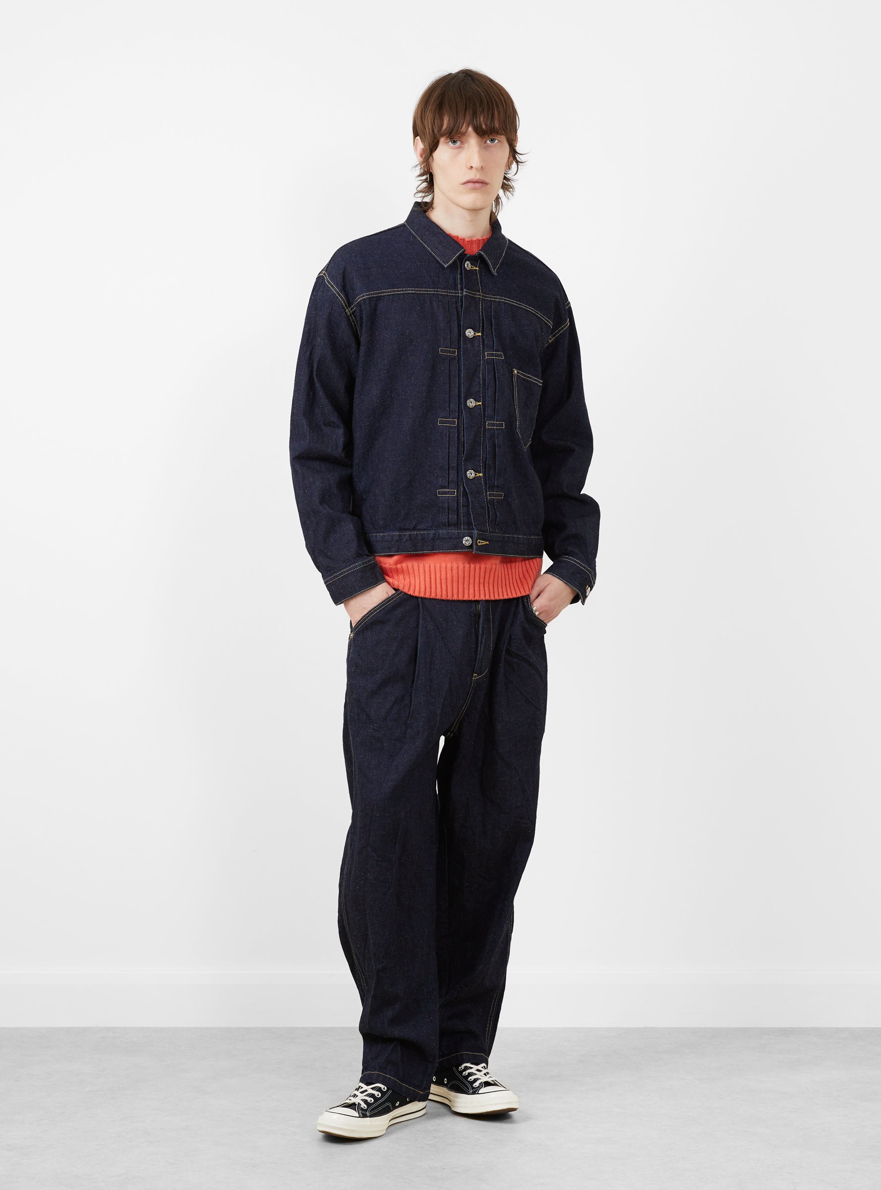 The Type 1 Hemp Denim Jacket comes in a rinse wash and is made from Japanese 12oz denim blended with cotton and hemp. Based on the classic Type 1 silhouette, it has a boxy shape with a single left chest pocket for everyday function. A centre back adjuster adds practicality while allowing small fit refinements, while vintage laurel stud fastenings complete the jacket.