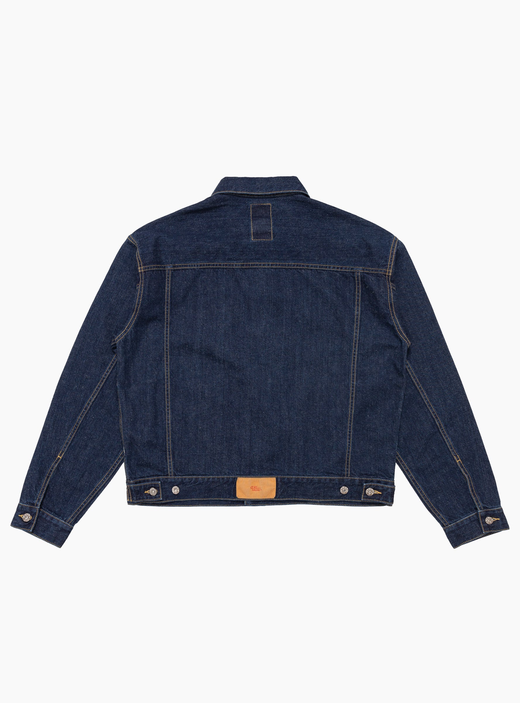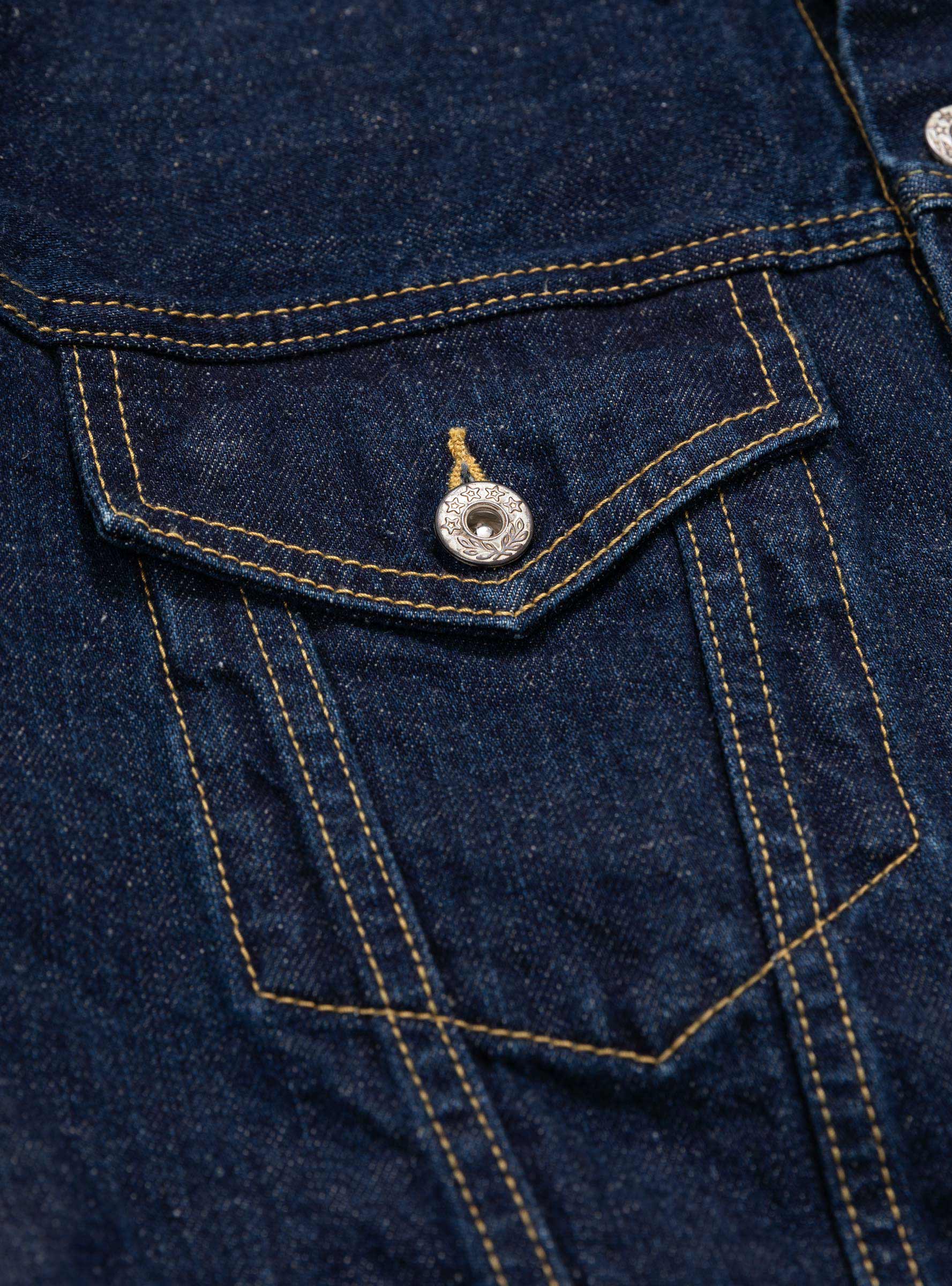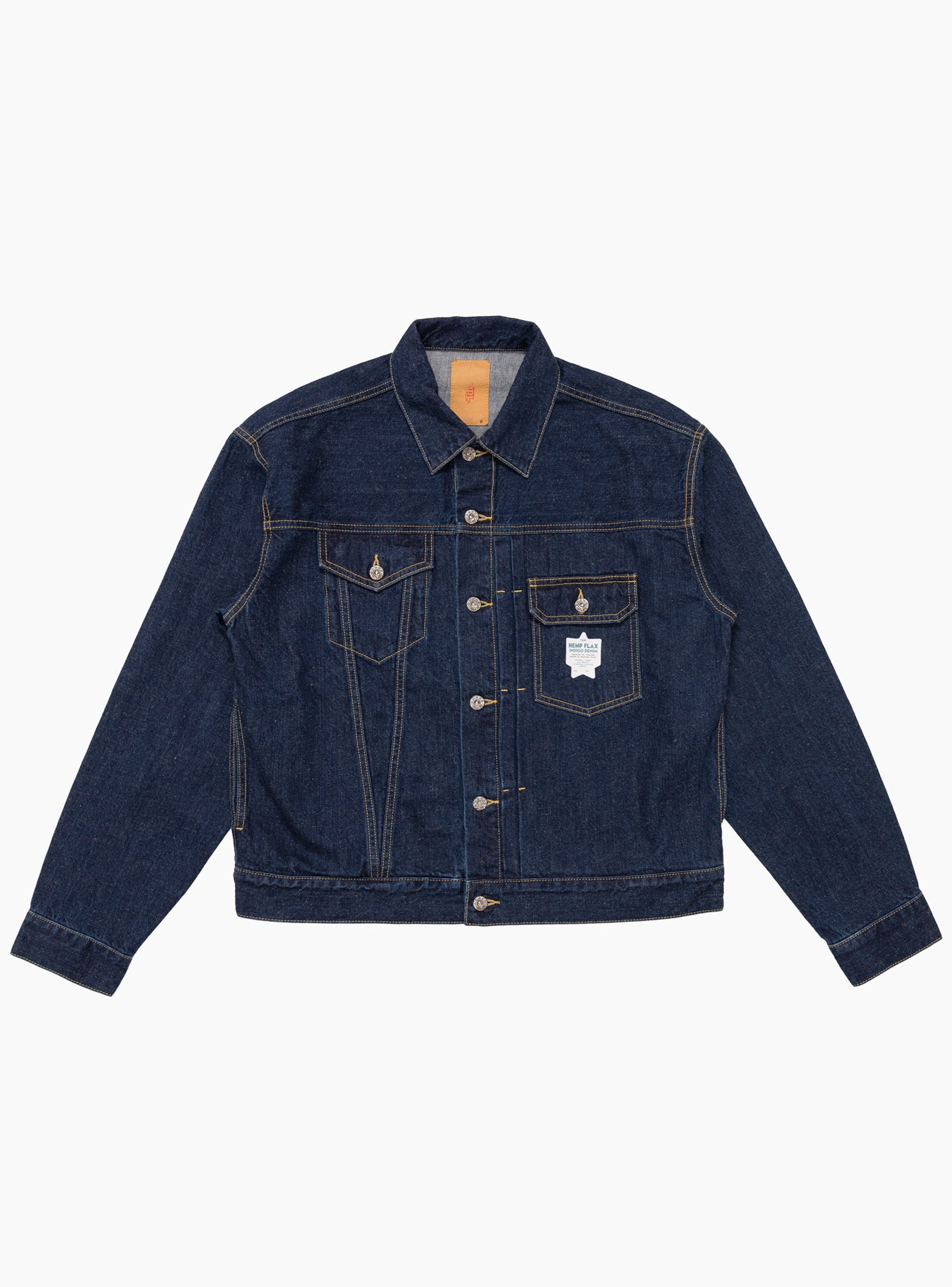 The Type 2+3 Hemp Denim Jacket in Rinse from TDR is a boxy denim jacket crafted from a cotton-hemp blend, offering a classic silhouette with modern functionality. Designed as a hybrid of the Type 2 and Type 3 jacket, it features hidden inside front pockets and vintage laurel stud fastenings for a distinctive touch.
