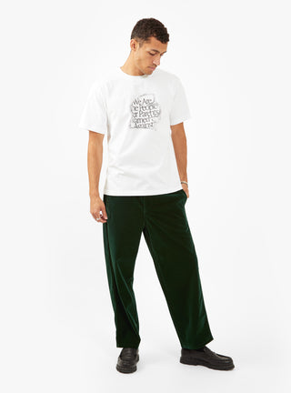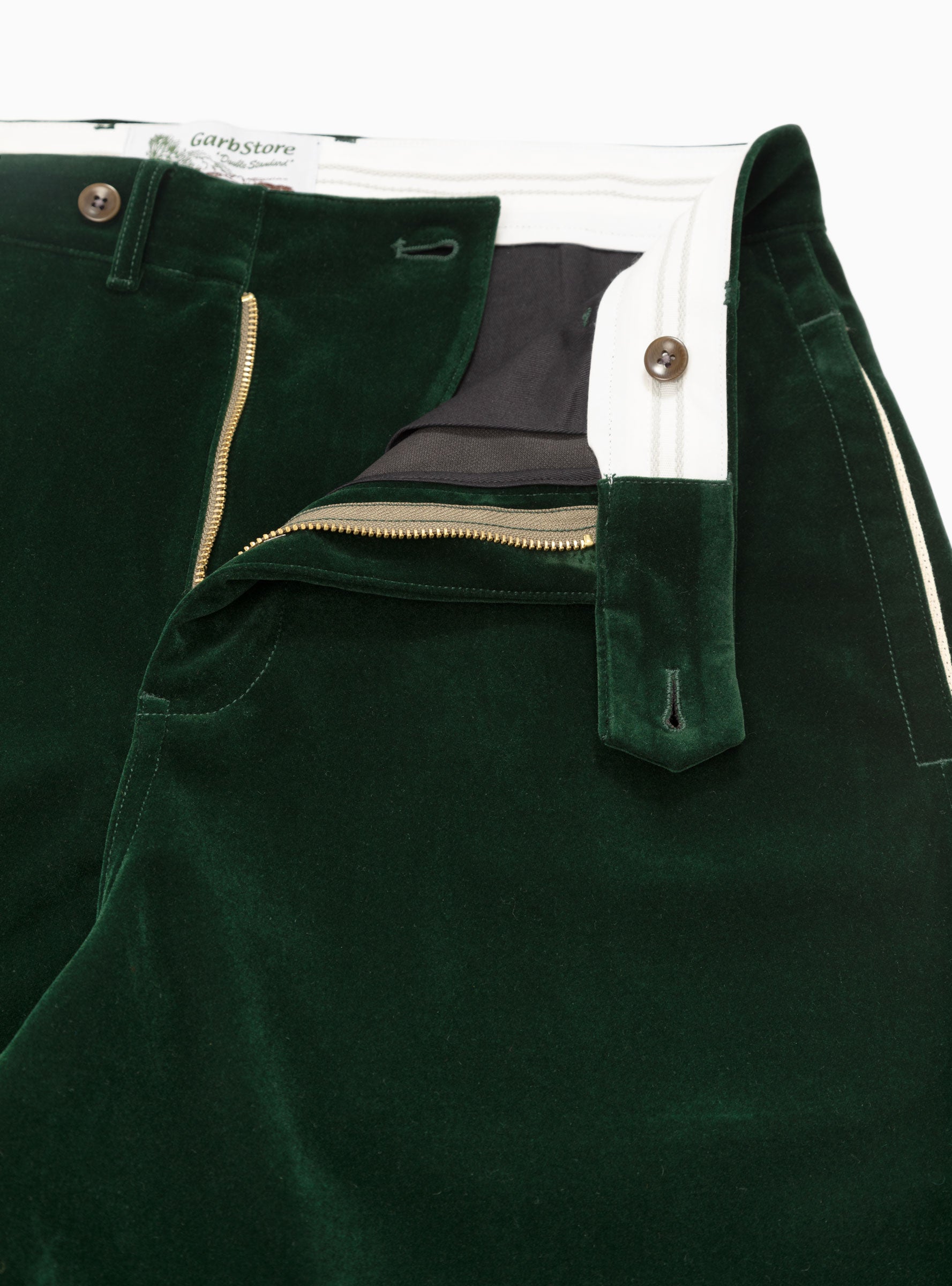 Updated for more formal settings, these bottle-green Manager pants from Garbstore’s AW23 collection are cut from short-pile velvet to a loose silhouette with wide legs and an extended corozo button fly. Rubber grip framing the inside of the waistband provides a snug fit.