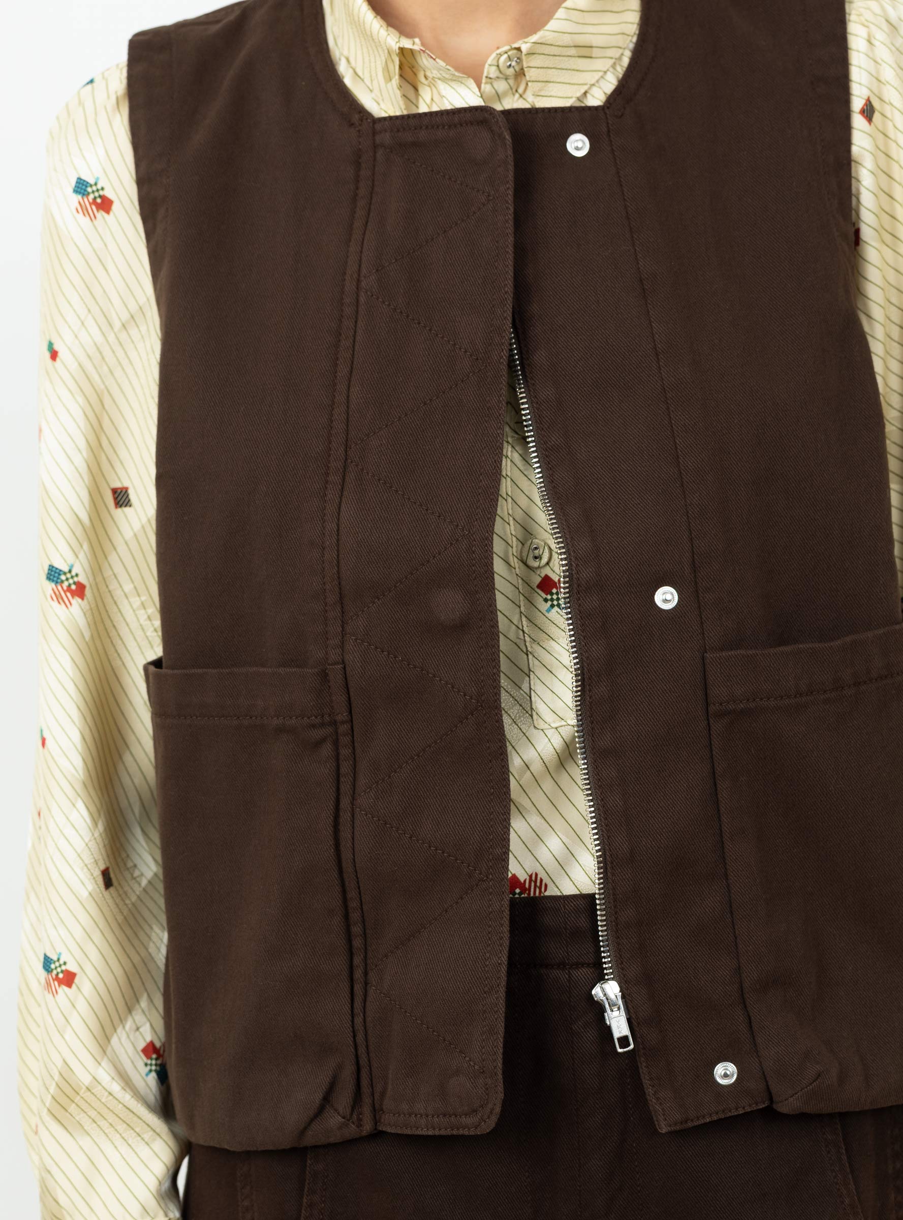 The Vestio Top from Rachel Comey comes in Chocolate and is made in the USA from brushed bull denim and features a round neckline with a concealed front snap placket. Designed with two front patch pockets, it has a versatile boxy silhouette perfect for layering and everyday wear.