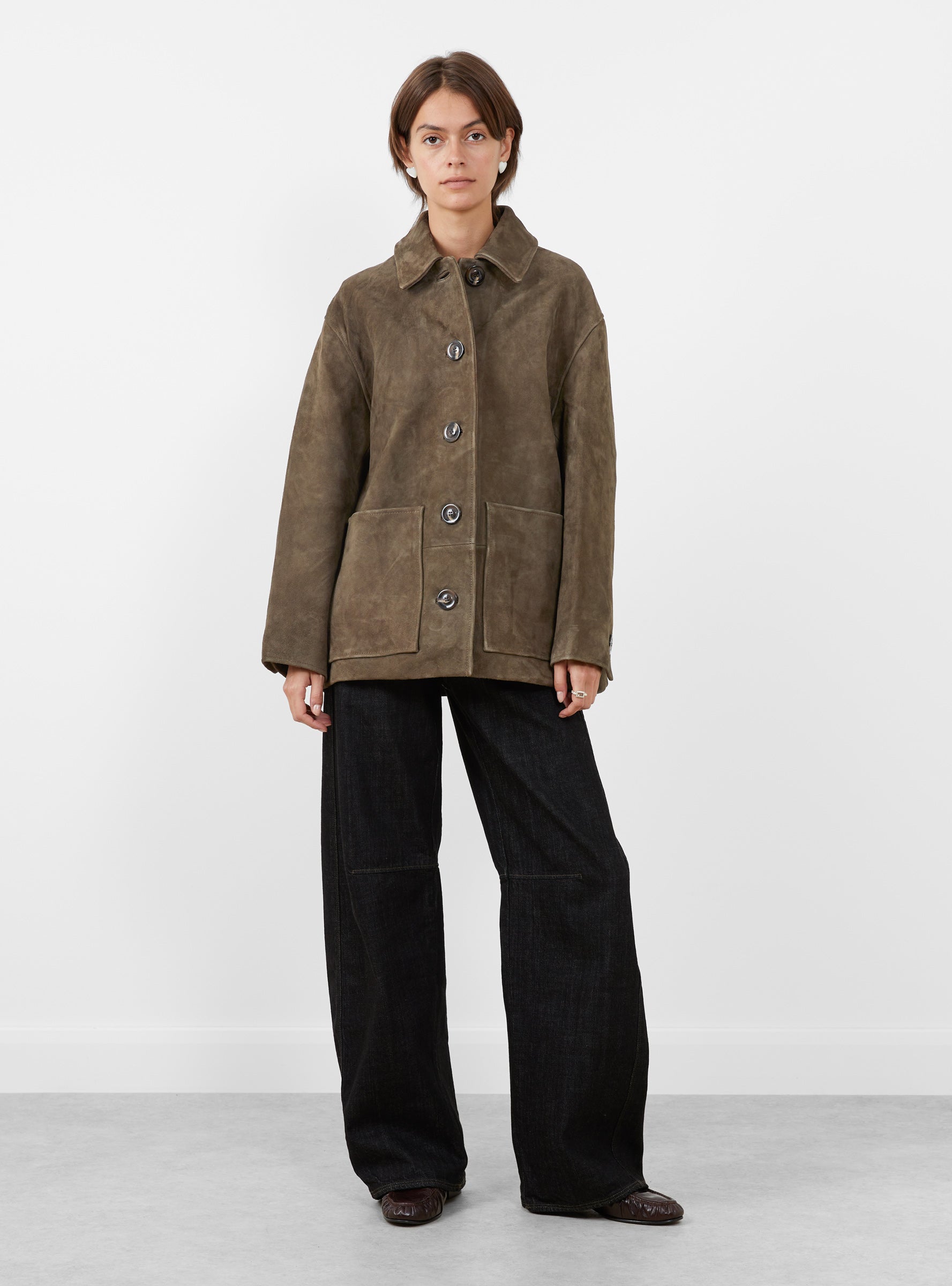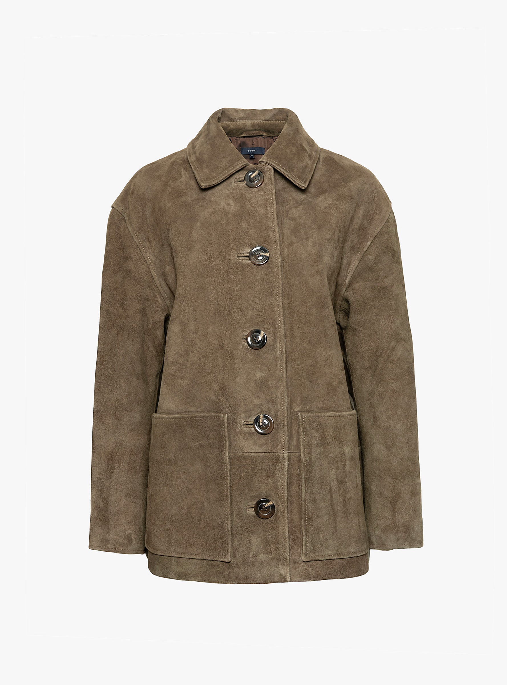 The Vincenzo Suede Jacket from Soeur arrives in Dark Khaki. A relaxed outerwear piece crafted from LWG-certified suede leather, it features an oversized fit, two front patch pockets, a large button placket and utilitarian detailing.