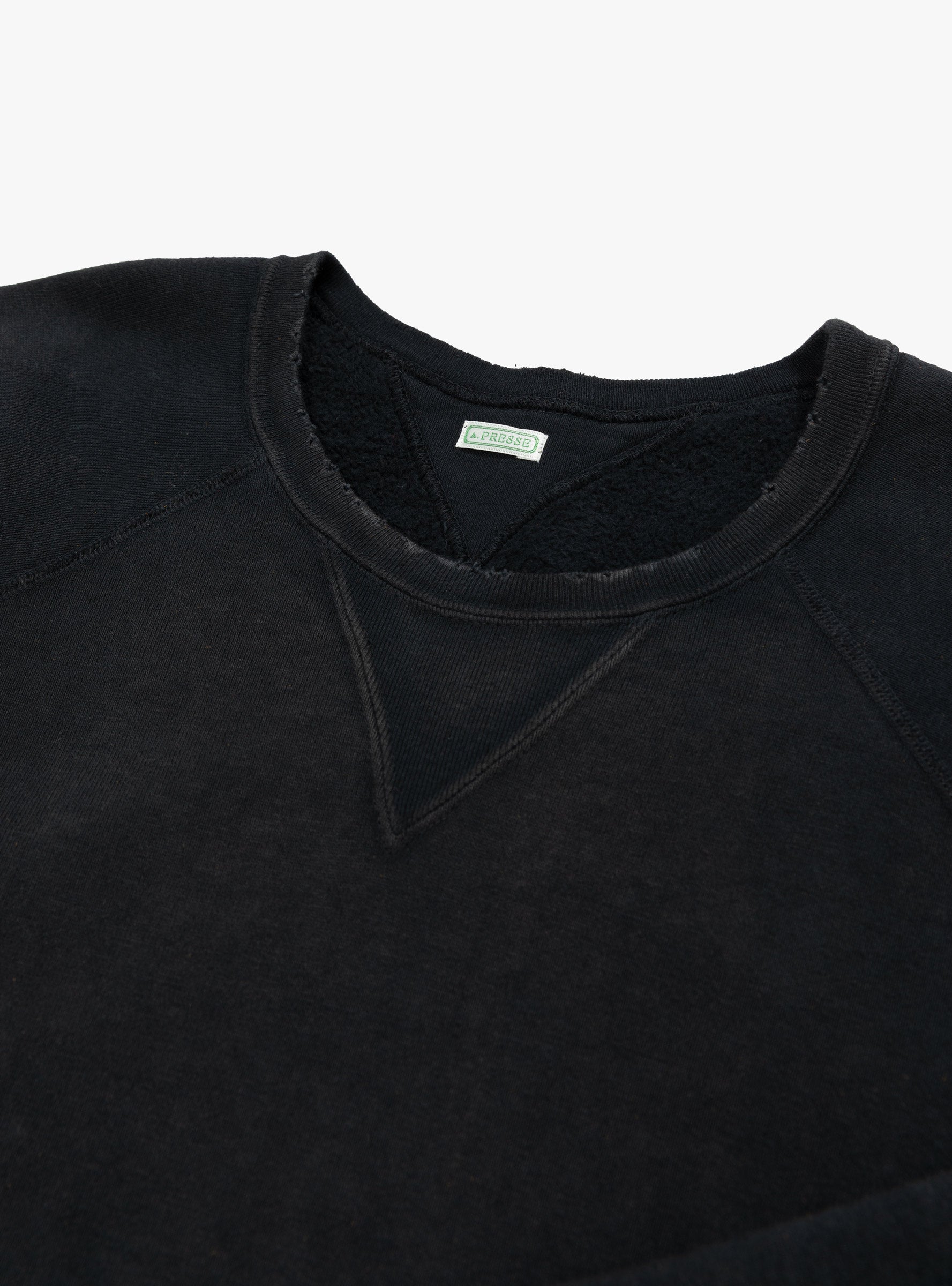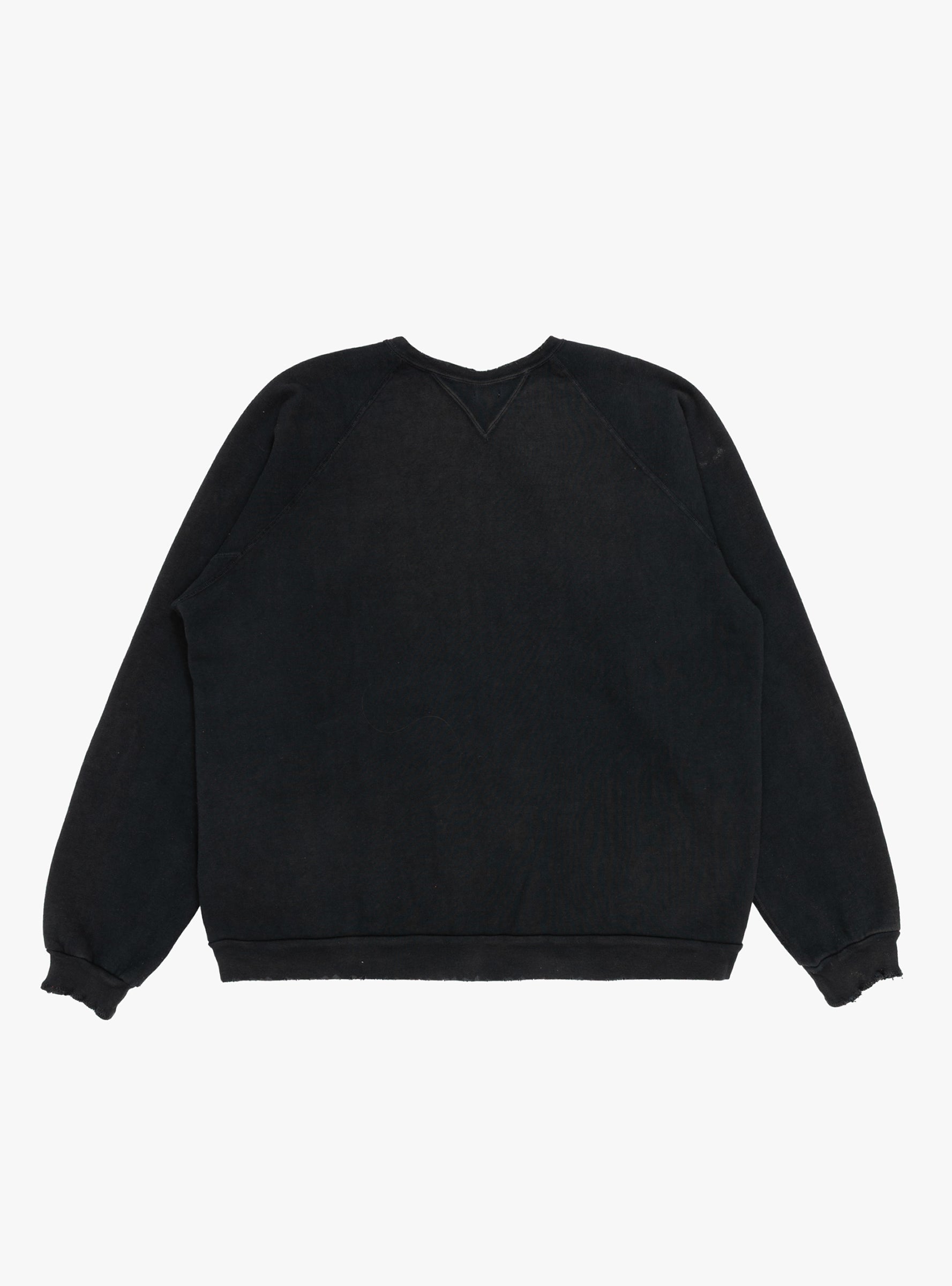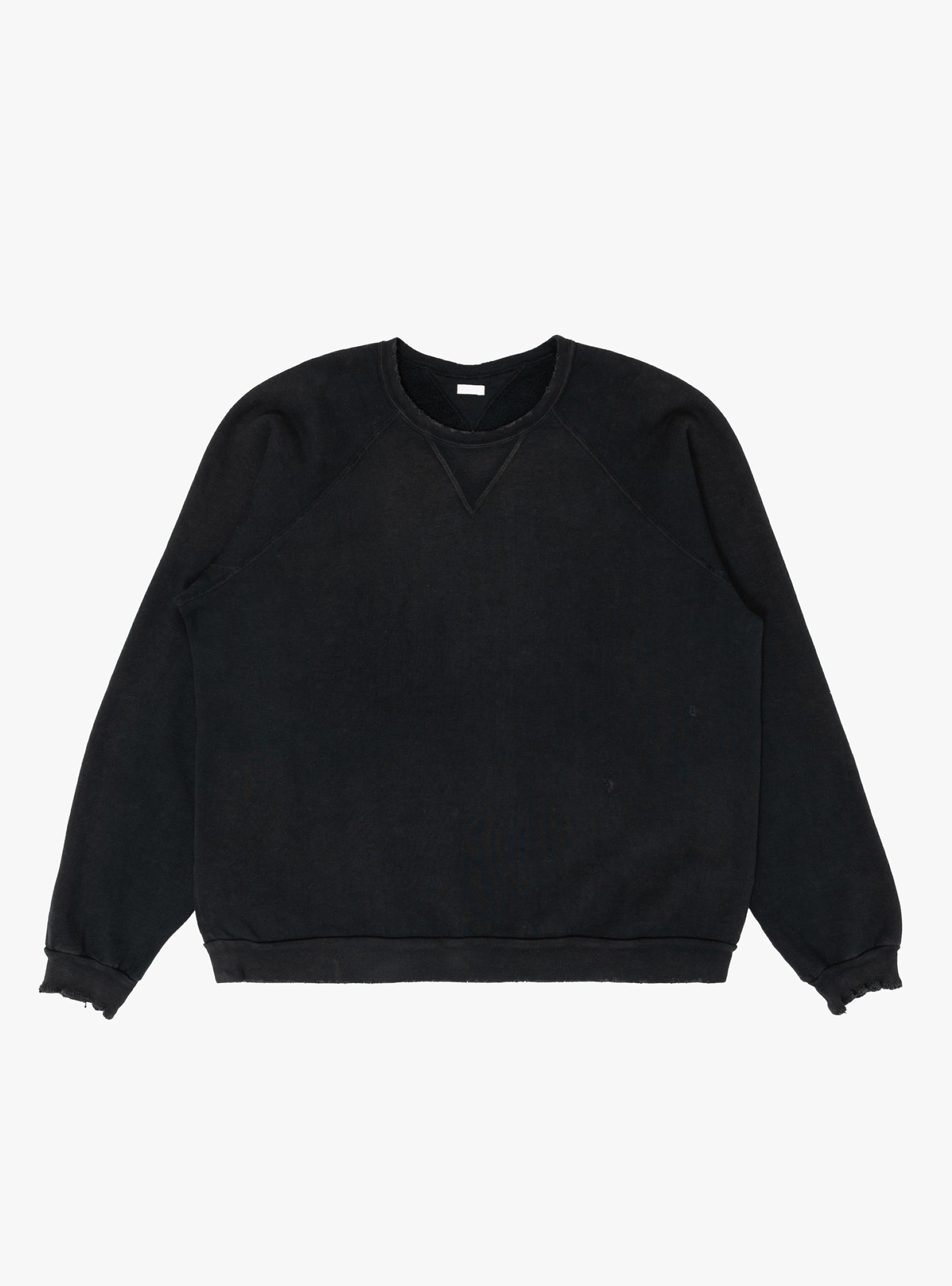 The Vintage Double V Sweatshirt from A.PRESSE comes in Black and is crafted in Japan from 100% cotton. Made from thick hanging fleece with a soft, fluffy texture, this sweatshirt features a V-shaped gusset and thin, stretched rib detailing. The fabric has been hand-distressed and treated to create uneven colour, giving the piece a worn-in, vintage character.