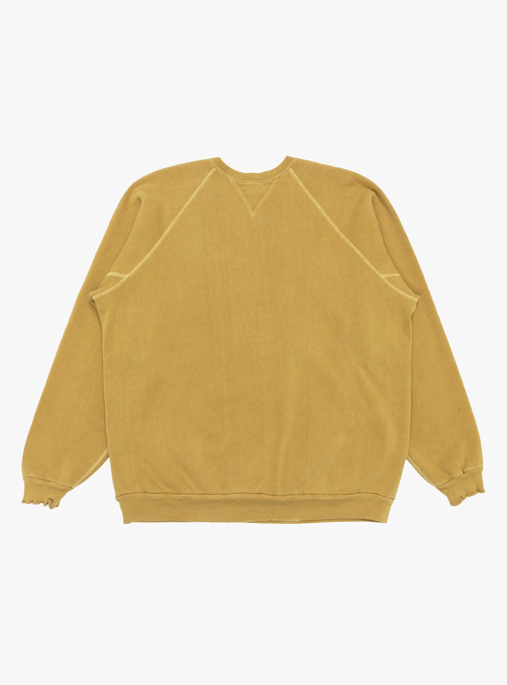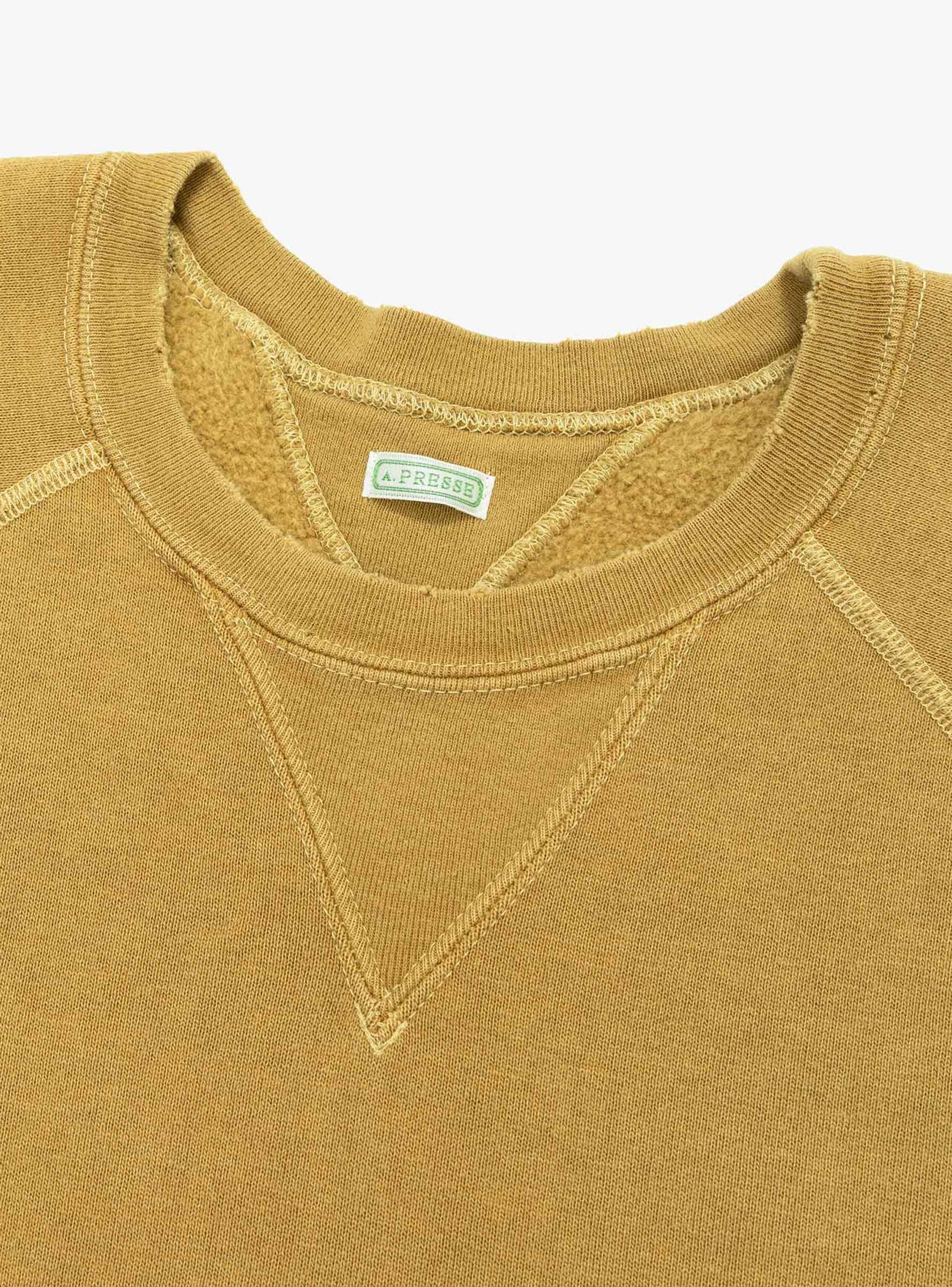 The Vintage Double V Sweatshirt from A.PRESSE comes in Gold and is made in Japan from cotton loop-back fleece. Designed with a deliberately broken silhouette, it features vintage-style thin, stretched ribbing and distorted V-gussets that enhance its worn-in character. Uneven colour and hand-distressed detailing give the piece a lived-in finish.