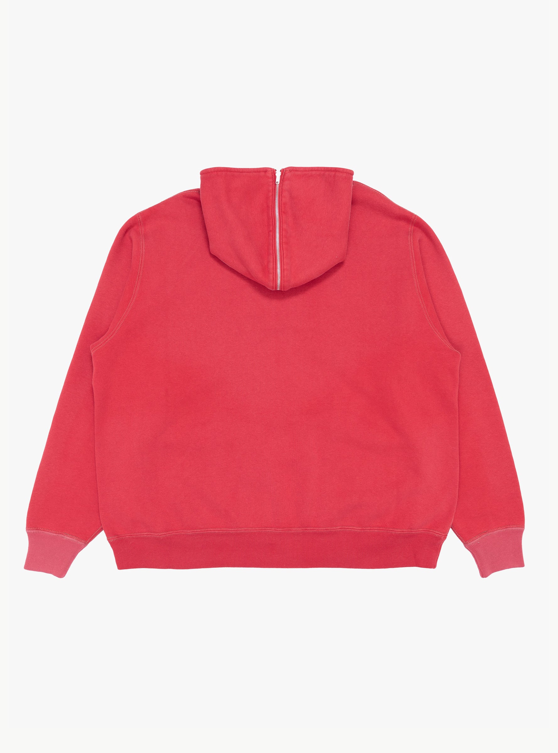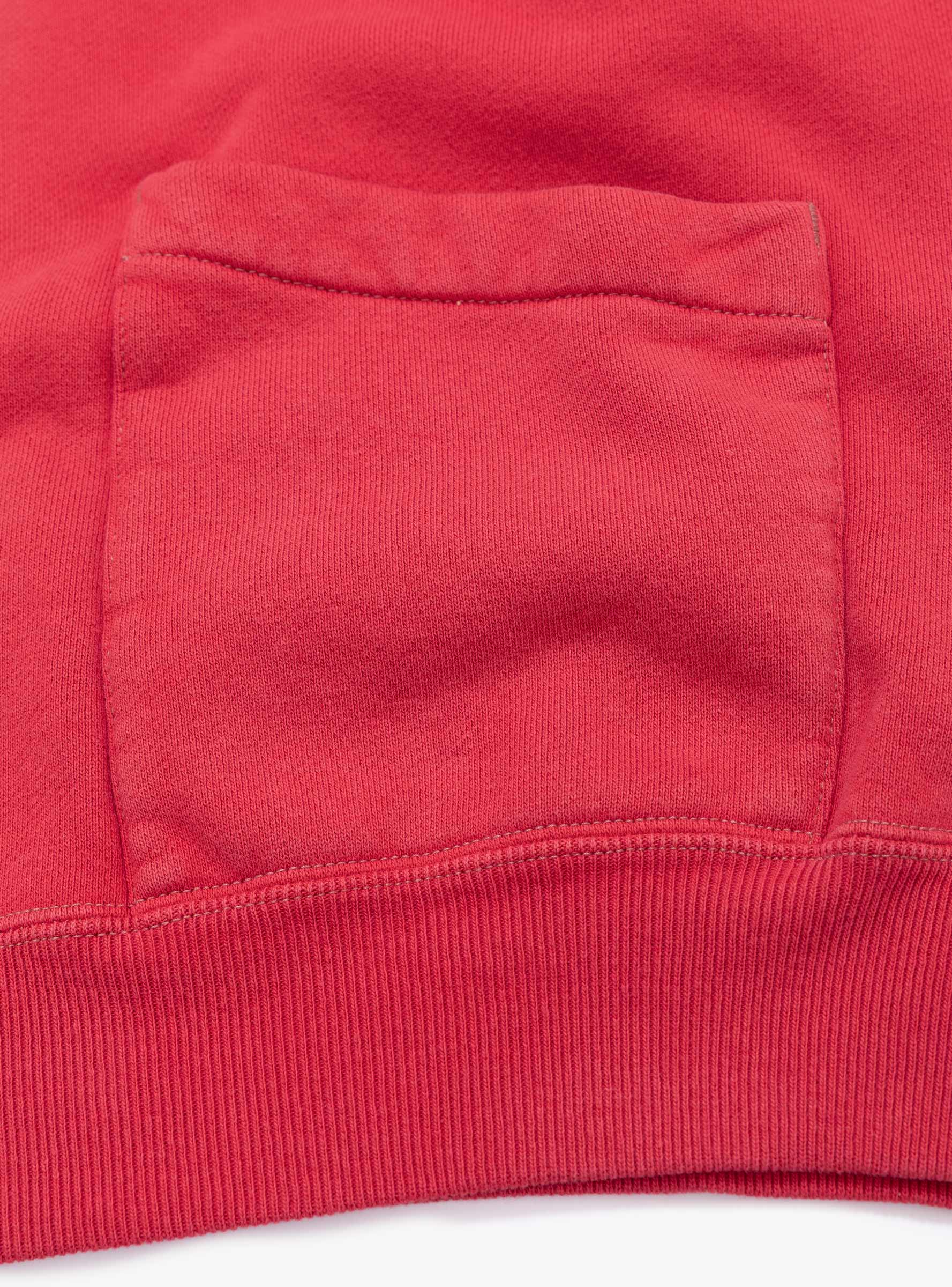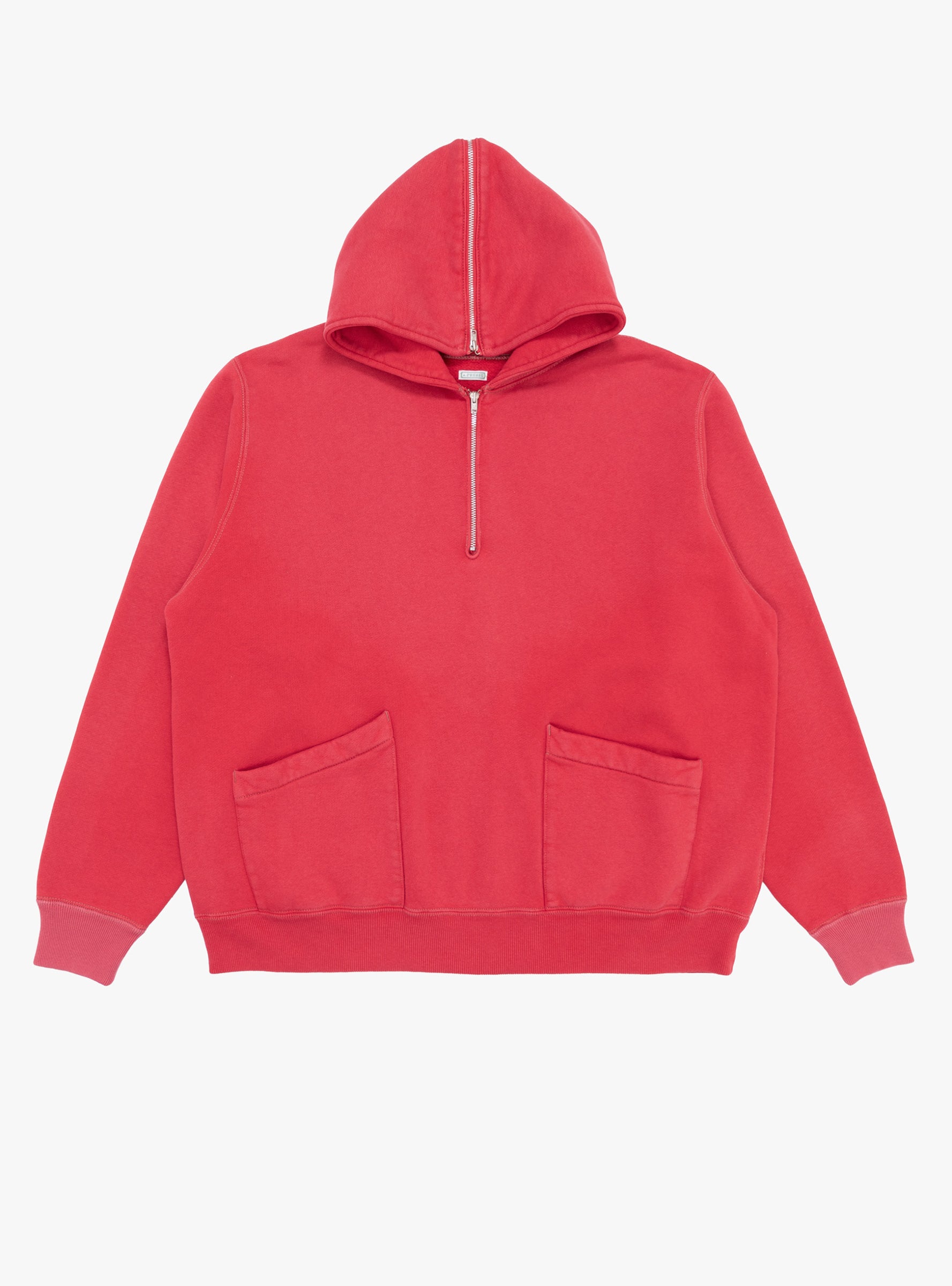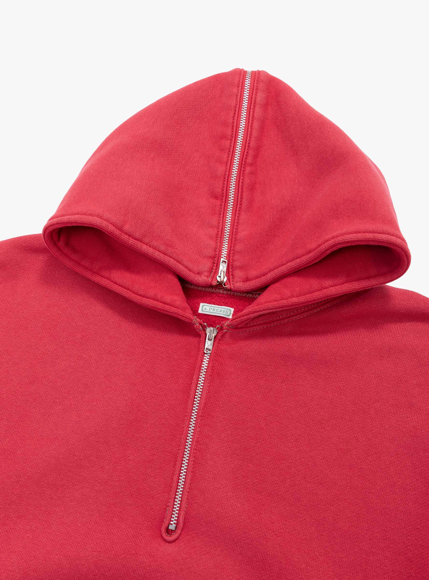 The Vintage Half Zip Sailor Hood Sweatshirt from A.PRESSE comes in Red and is made in Japan from brushed cotton. Designed with a slightly cropped length, the sweatshirt features a half-zip sailor hood and a seamless shoulder construction that creates a rounded silhouette. Uneven colour and hand-distressed detailing give the piece a worn, vintage character.