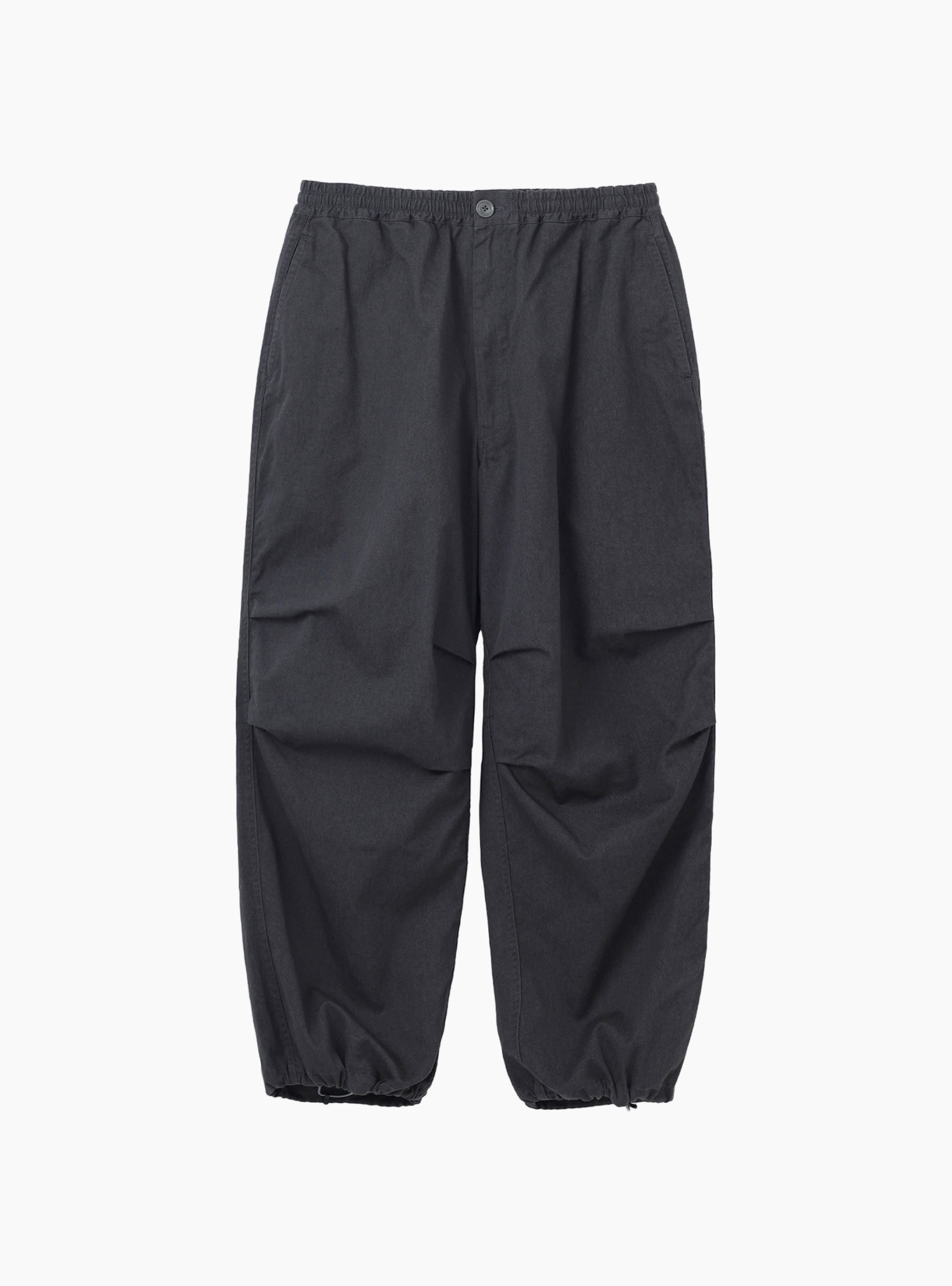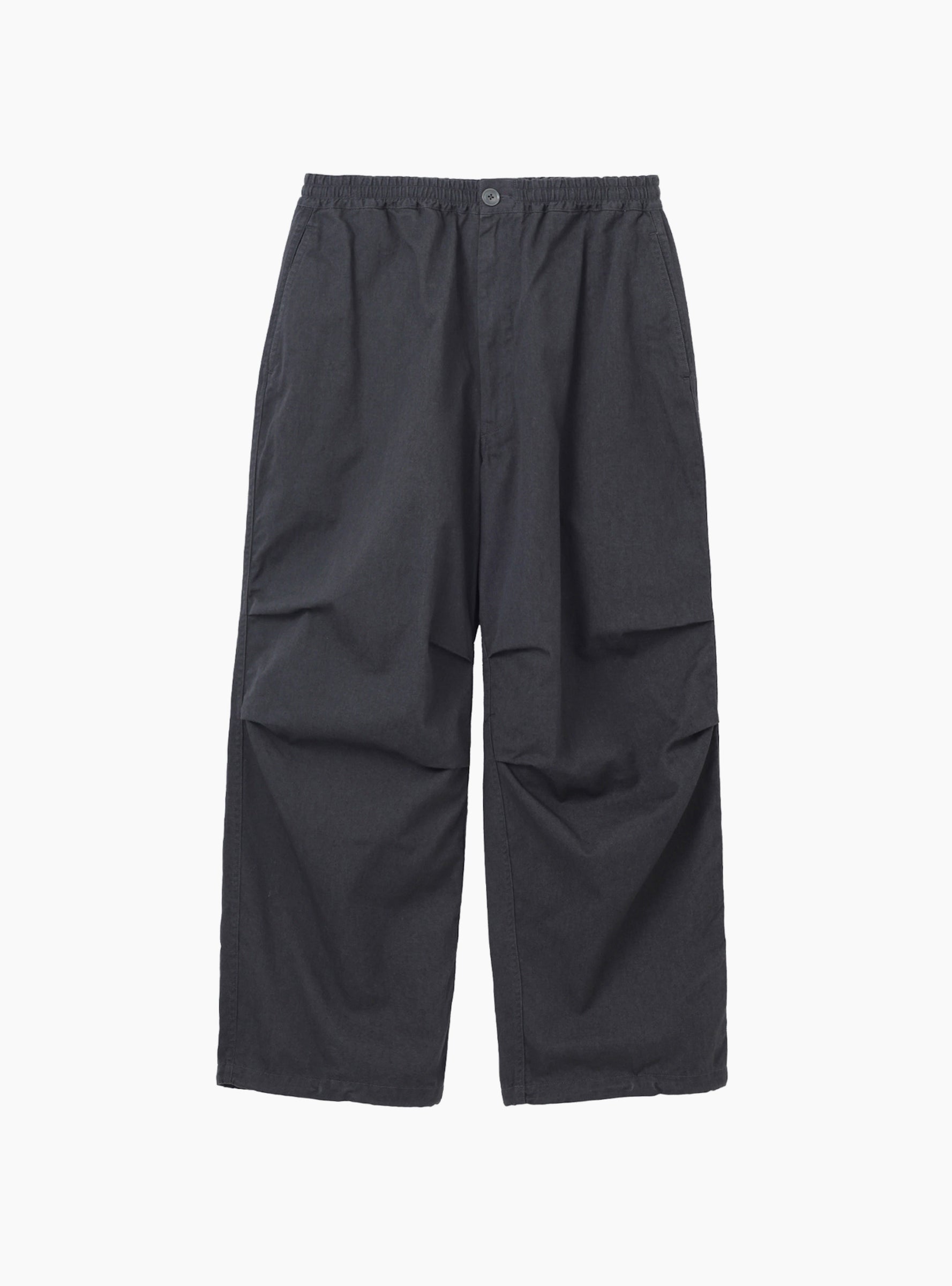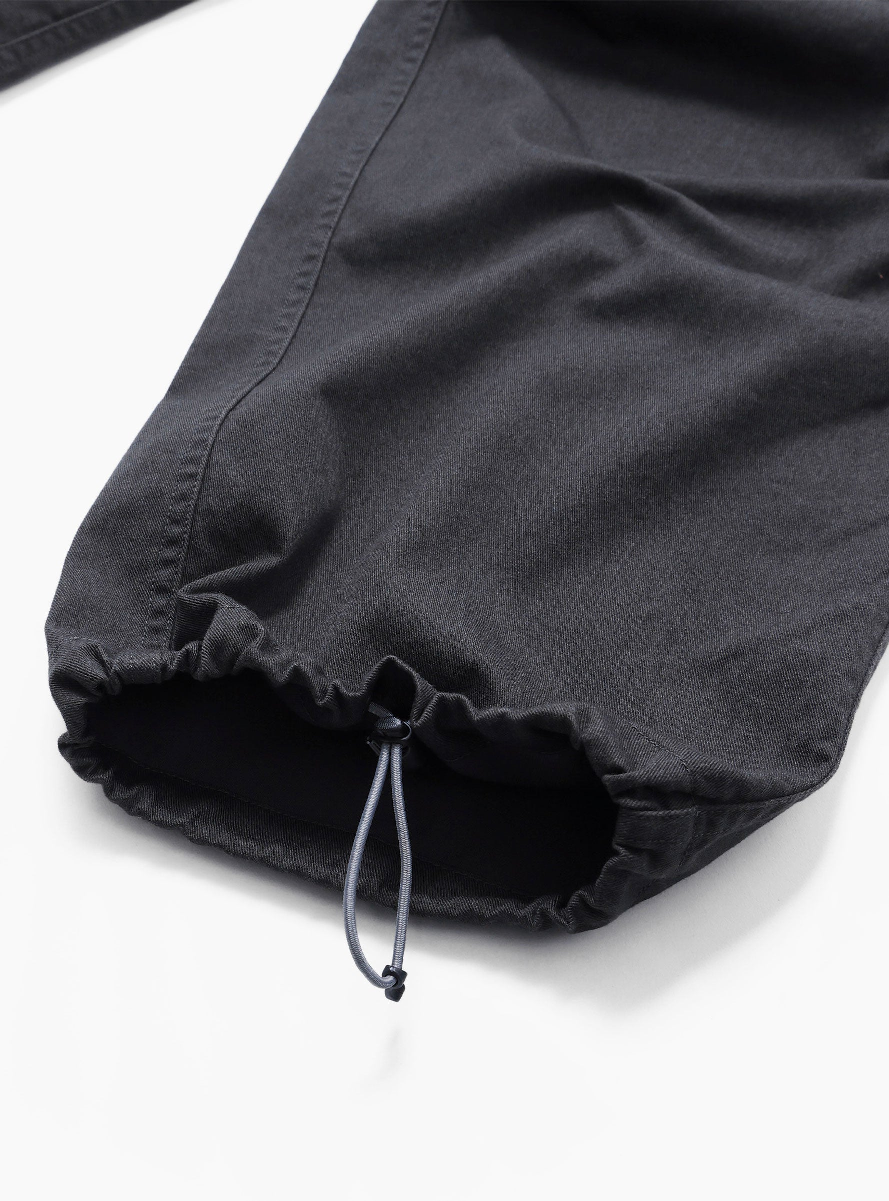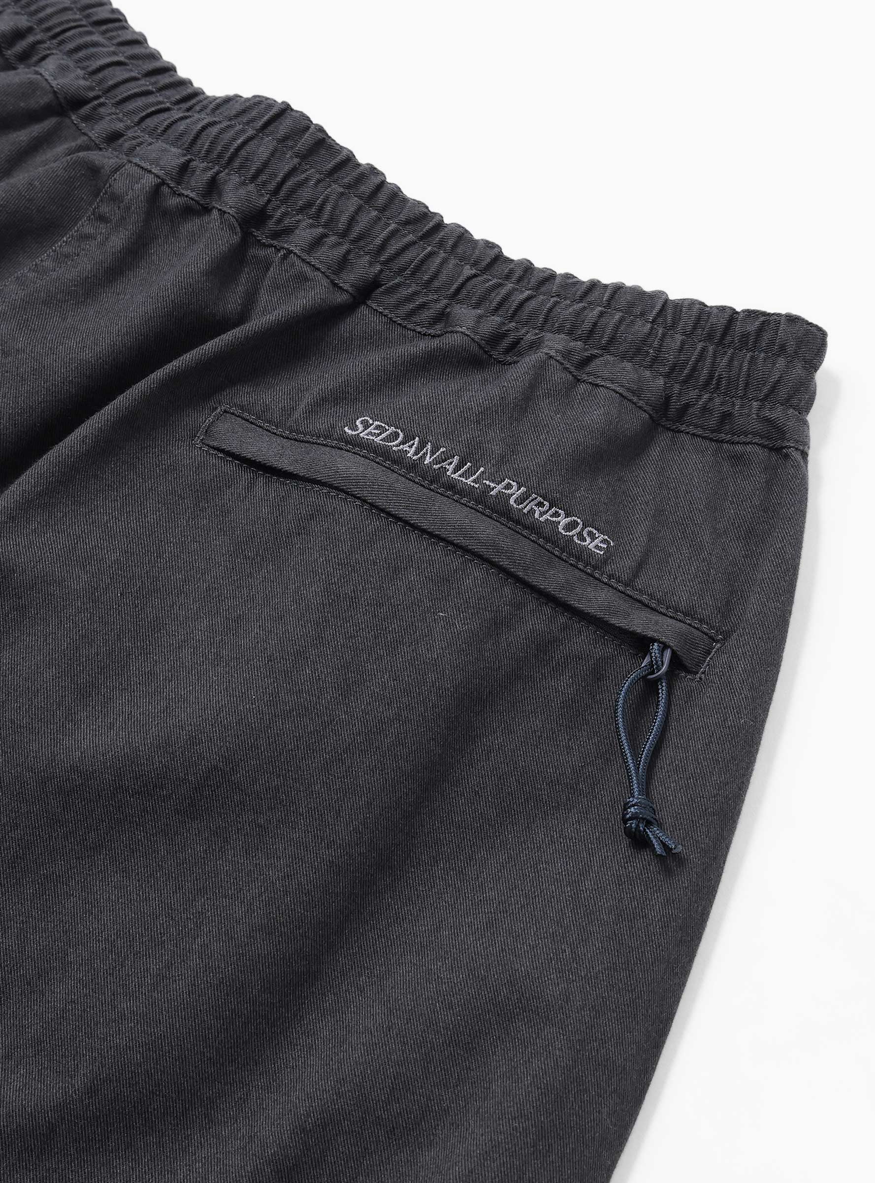 The Vintage Washed Over Easy Pants from Sedan All-Purpose come in Charcoal, cut from cotton twill with a relaxed, utilitarian feel. The elasticated waist is adjustable with an internal drawstring, while the hem also features a drawcord for a custom fit. Functional details include zippered hip pockets with an embroidered logo at the opening and a distinct smartphone pocket placed on the left thigh.
