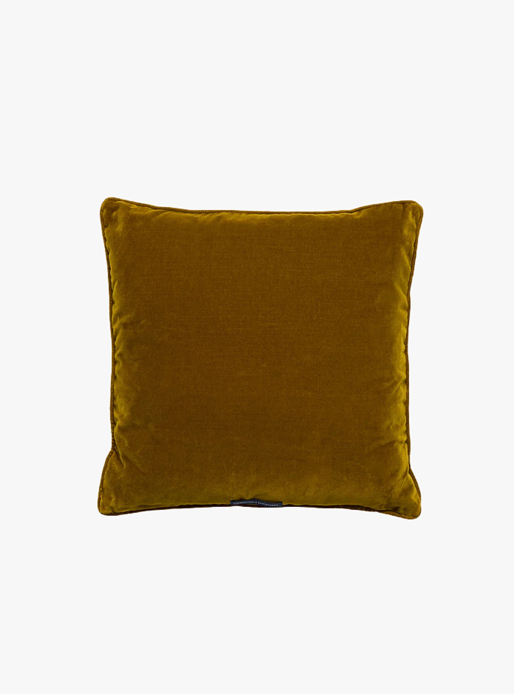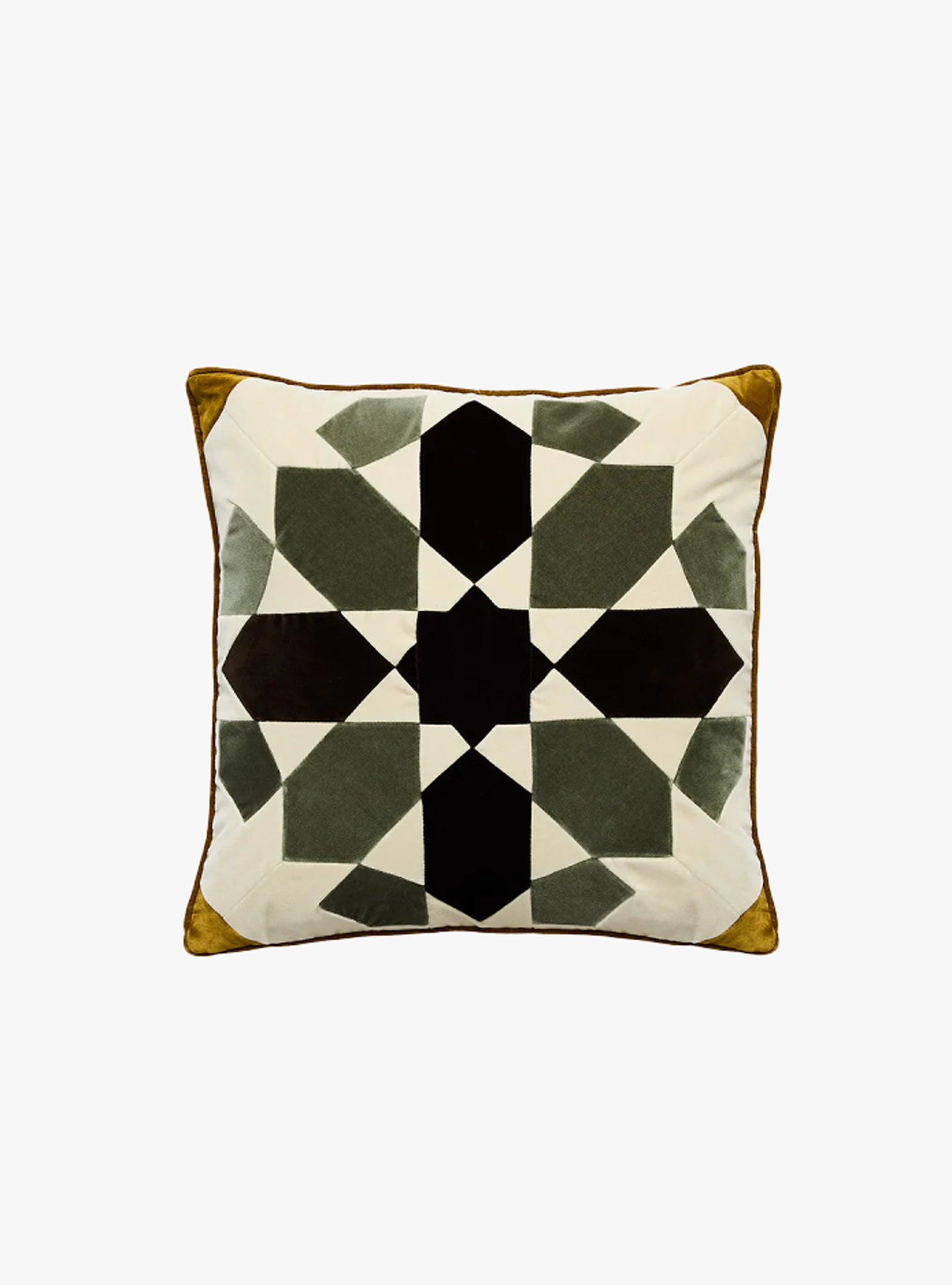 The Viola Cushion from Christina Lundsteen is handmade in Europe from soft cotton velvet. This cushion features a mix of emerald, pale olive, and curry tones, offering a soft, textured finish and a considered design for contemporary interiors.