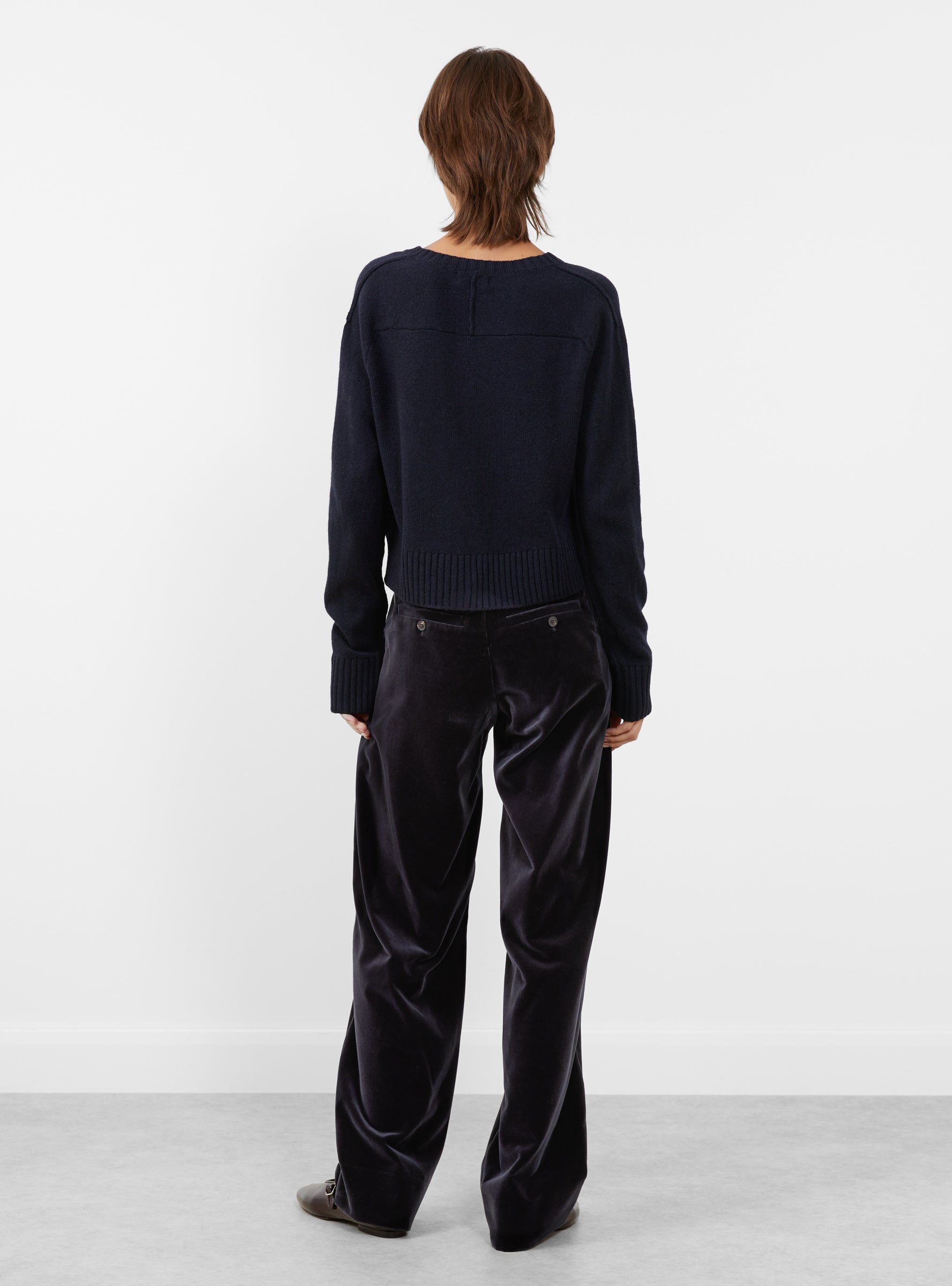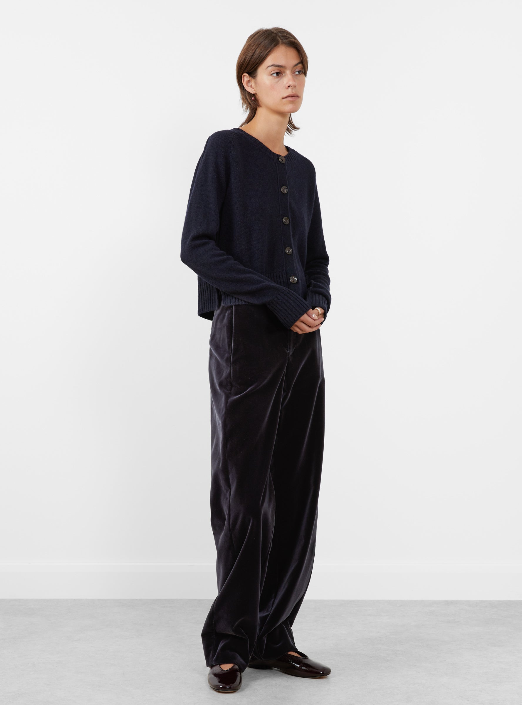 The Virginia Knit Cardigan from Soeur arrives in Navy. This cropped Merino wool cardigan features a classic round neckline and long sleeves, complete with front button closure and subtle shoulder seam detailing for a refined finish.
