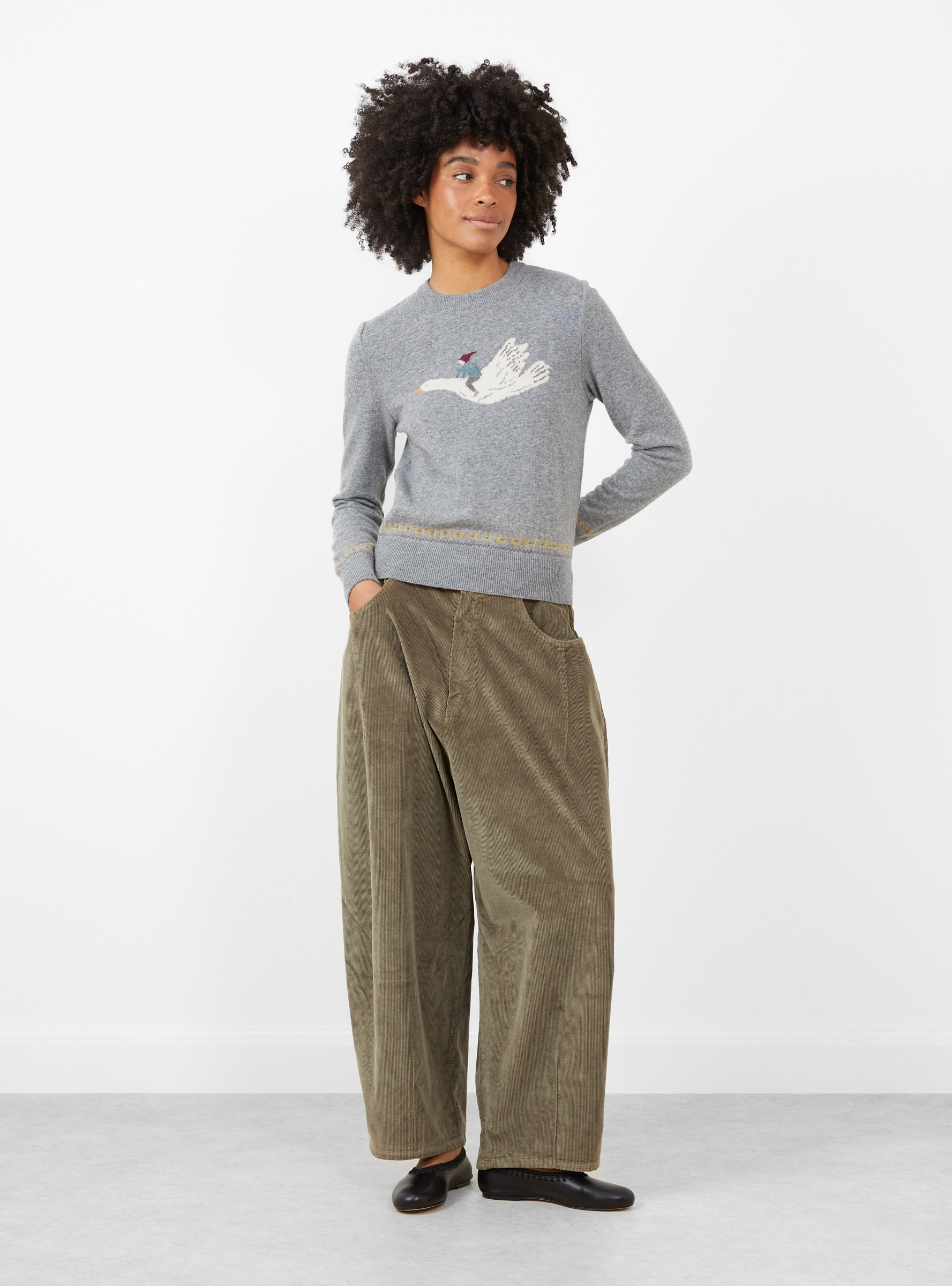 The 12G Wool Crew Neck Fly Goose Sweater from Kapital comes in Gretand is made in Japan from 100% wool. Featuring a motif of a character riding a flying goose, the sweater has yellow stitch detailing and a classic rounded neck with ribbed hem, cuffs, and collar.