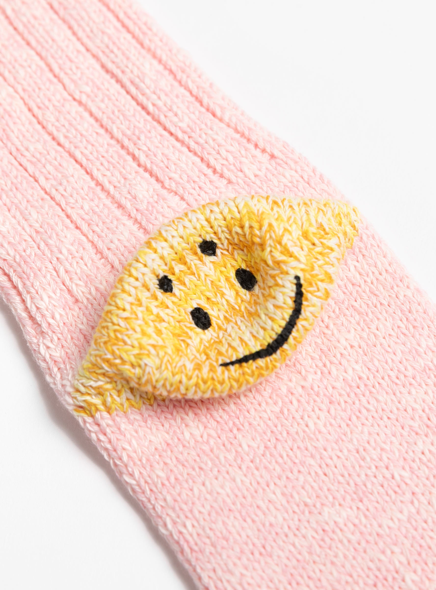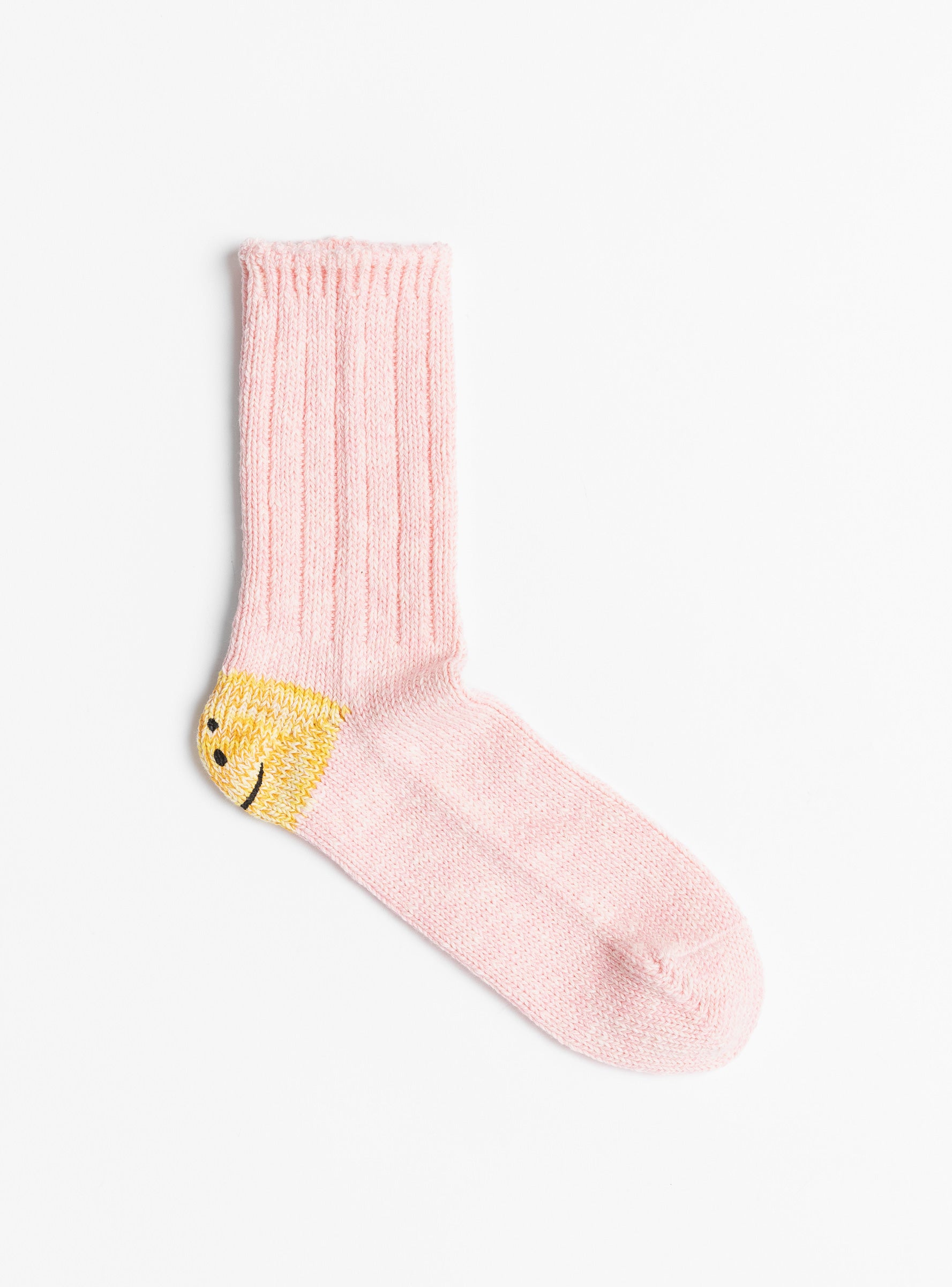 The 56 Yarns Rib RAINBOW HAPPY Heel Socks come in Pink from Kapital and are crafted from a cotton blend. Designed with a thick woven handle, they feature a melange knit toe and a smiley face motif at the heel for a playful finish.
