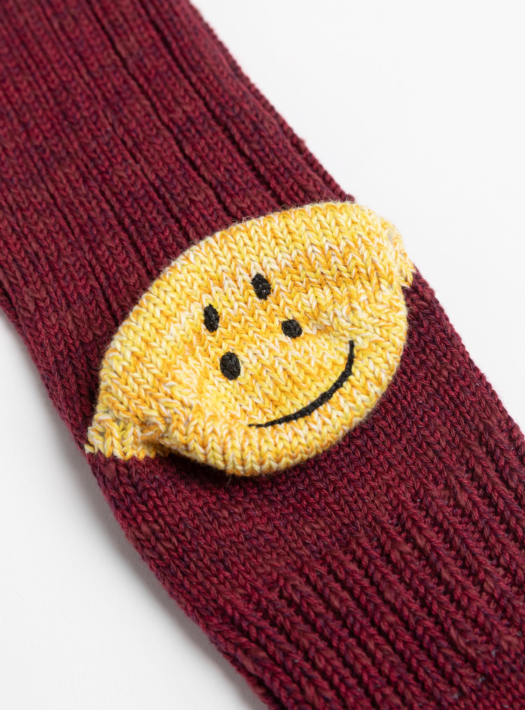 The 60yarns Grandrelle IVY RAINBOW HAPPY Heel Socks from Kapital come in Burgundy and are made in Japan from a cotton and hemp blend. These crew-length socks feature a burgundy base with red and orange stripes, finished with a yellow "Rainbowy" motif on the heel.