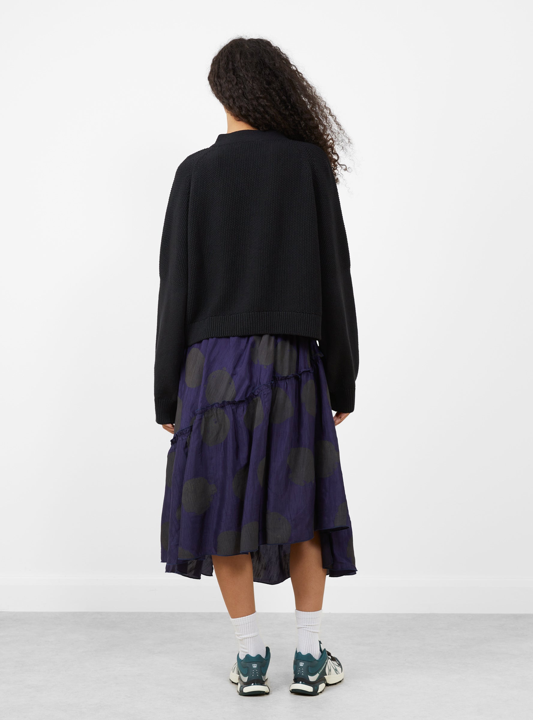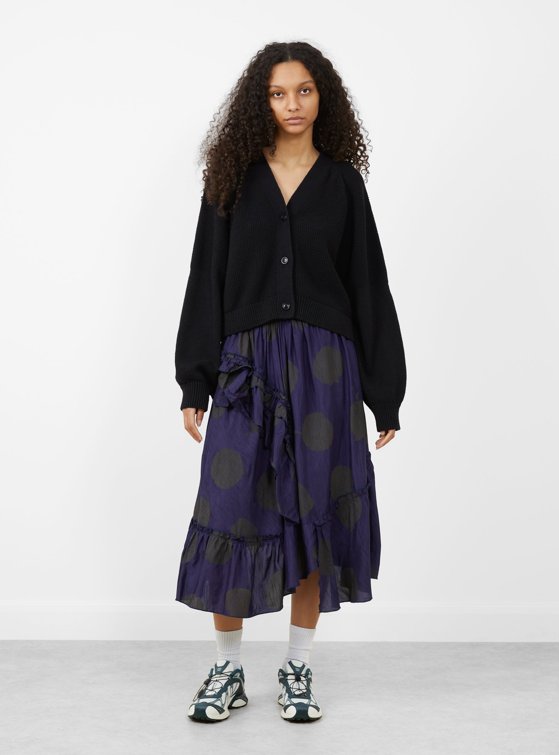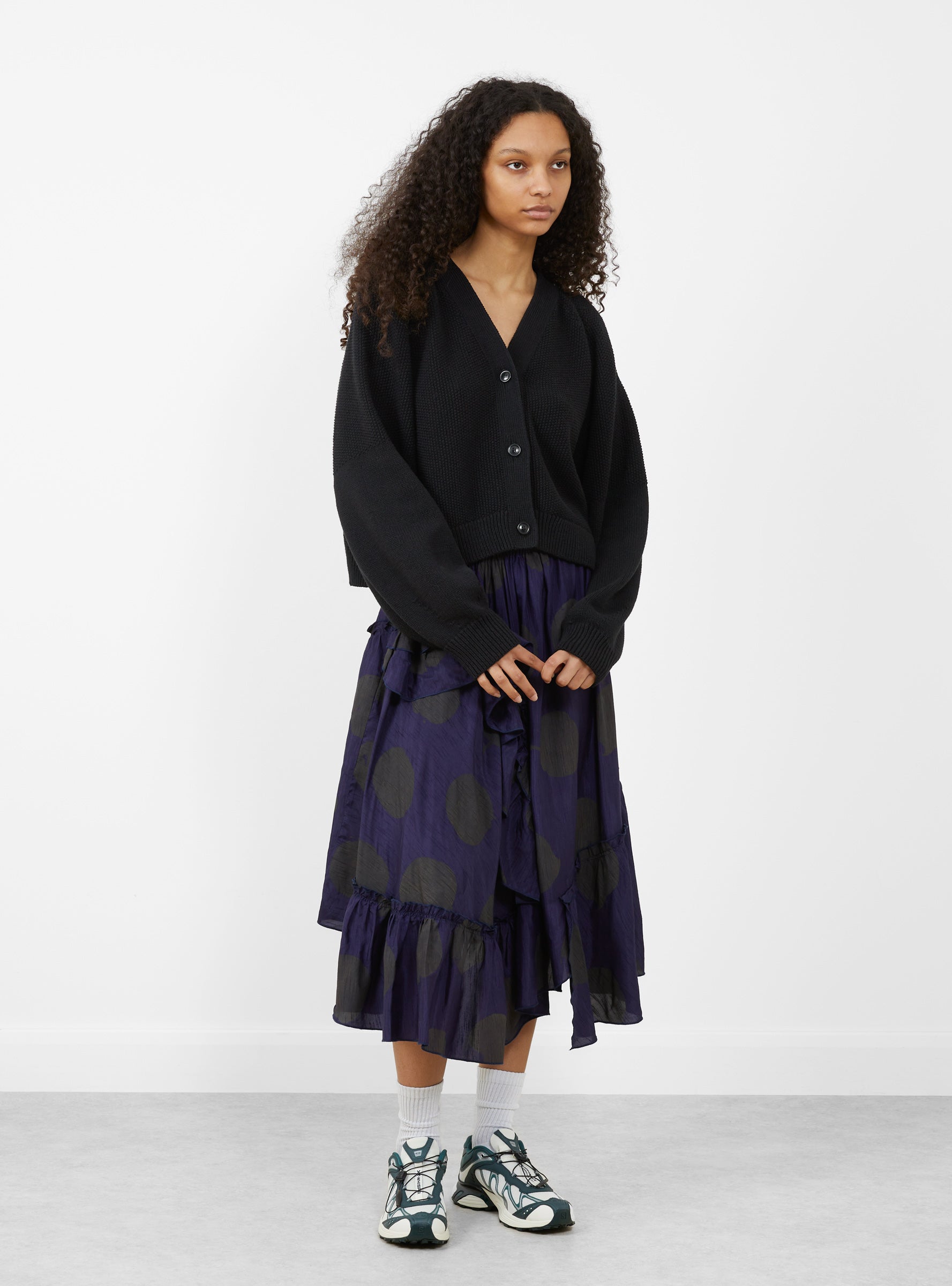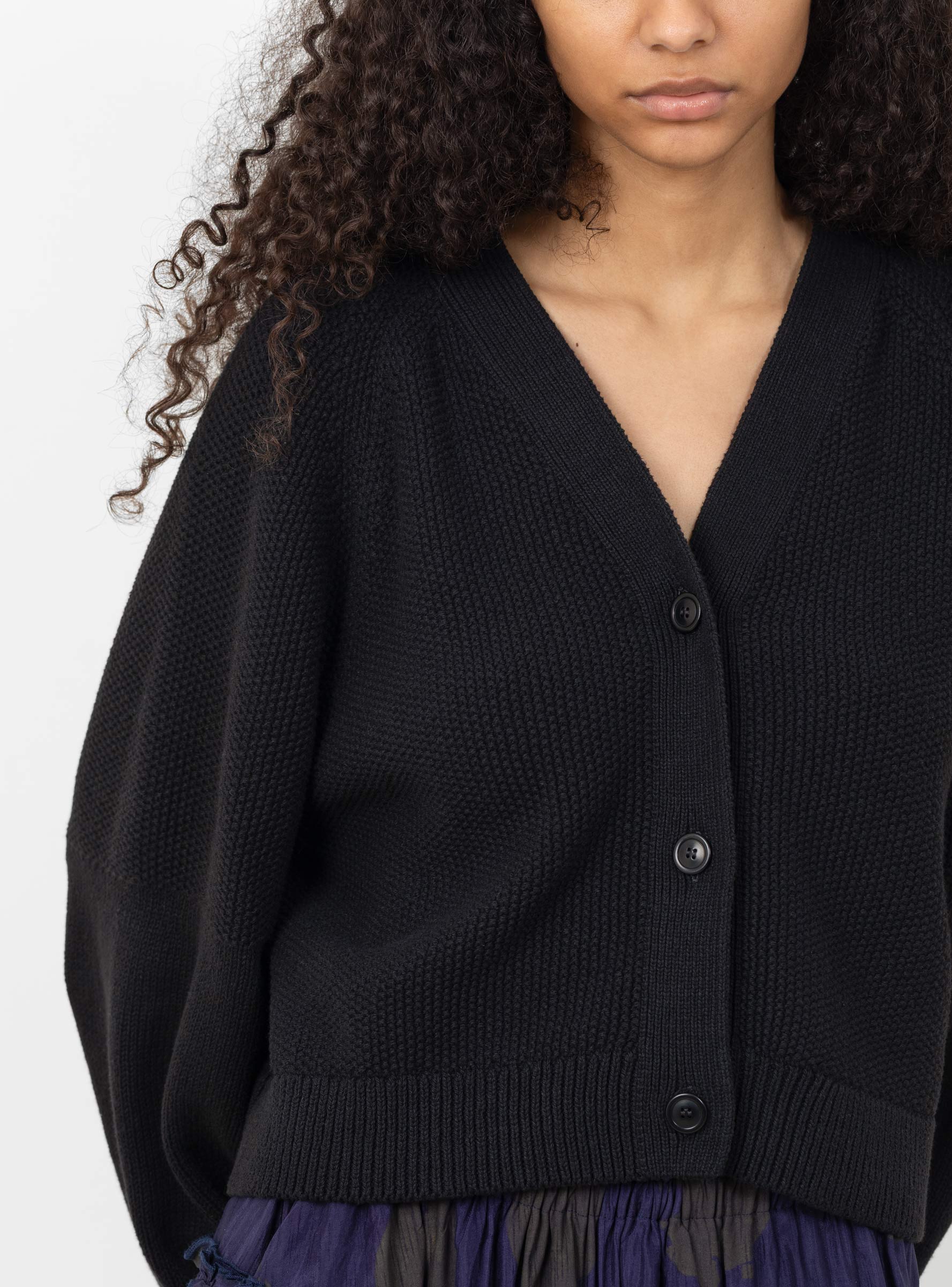 The Computer Cardigan comes in Black from YMC and is knitted from a cotton blend with recycled fibres. Designed with a V neckline, it features a combination of moss stitch and plain knit panels, raglan sleeves and a cropped shape. Corozo button fastening completes the front.