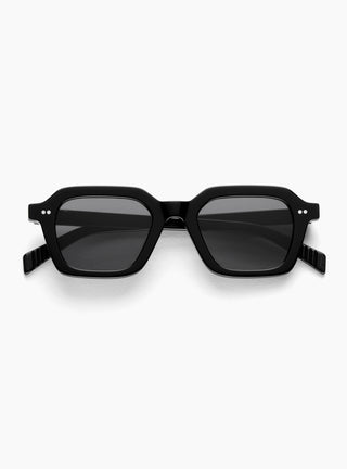 AKILA'S Era Sunglasses in Black feature a hexagonal acetate-frame with grey lenses, finished with two-pin rivets and engraved temple cores. Fitted with integrated nose pads for comfort, these sunglasses provide 100% UVA/UVB Protection.