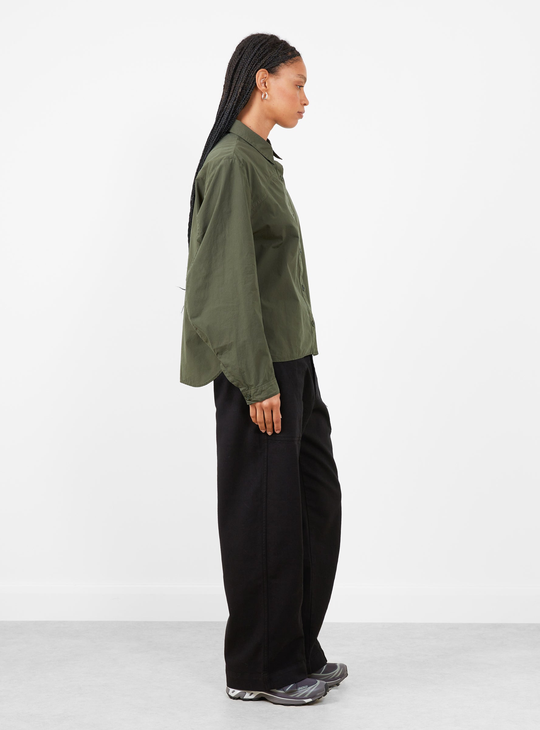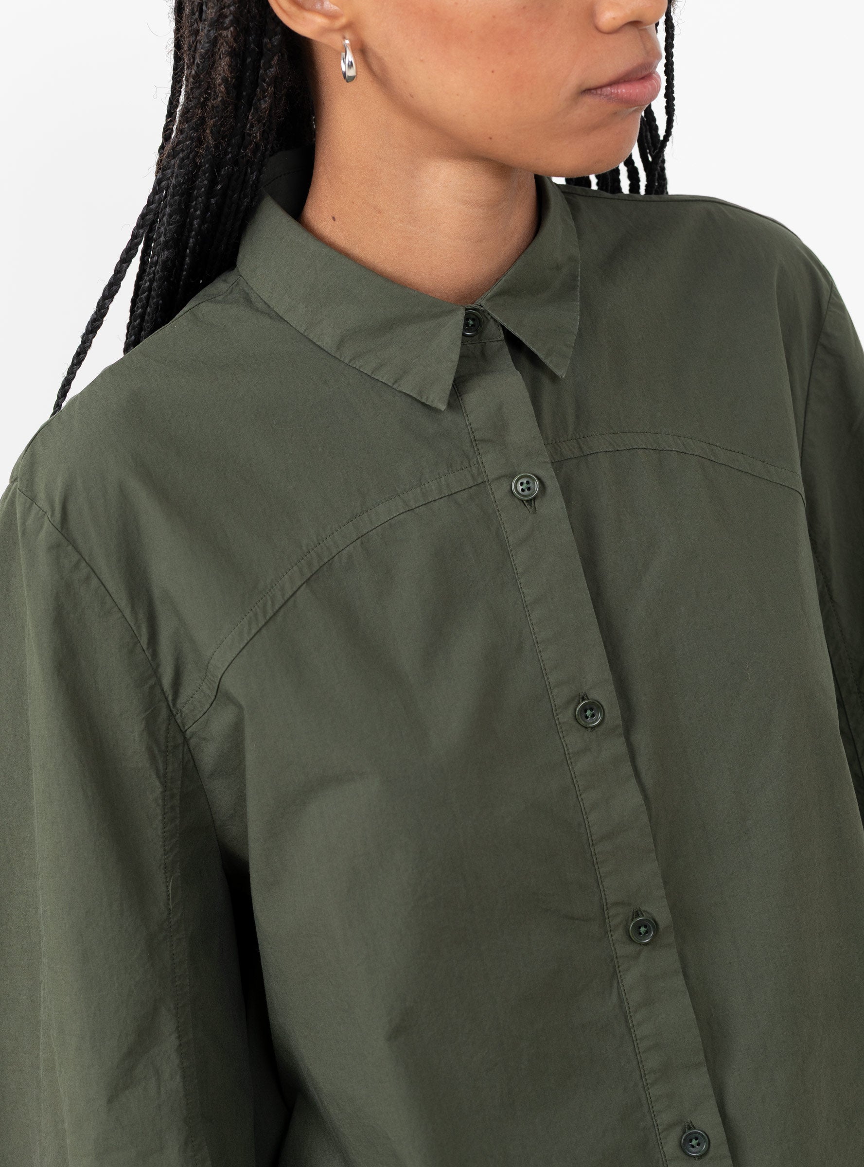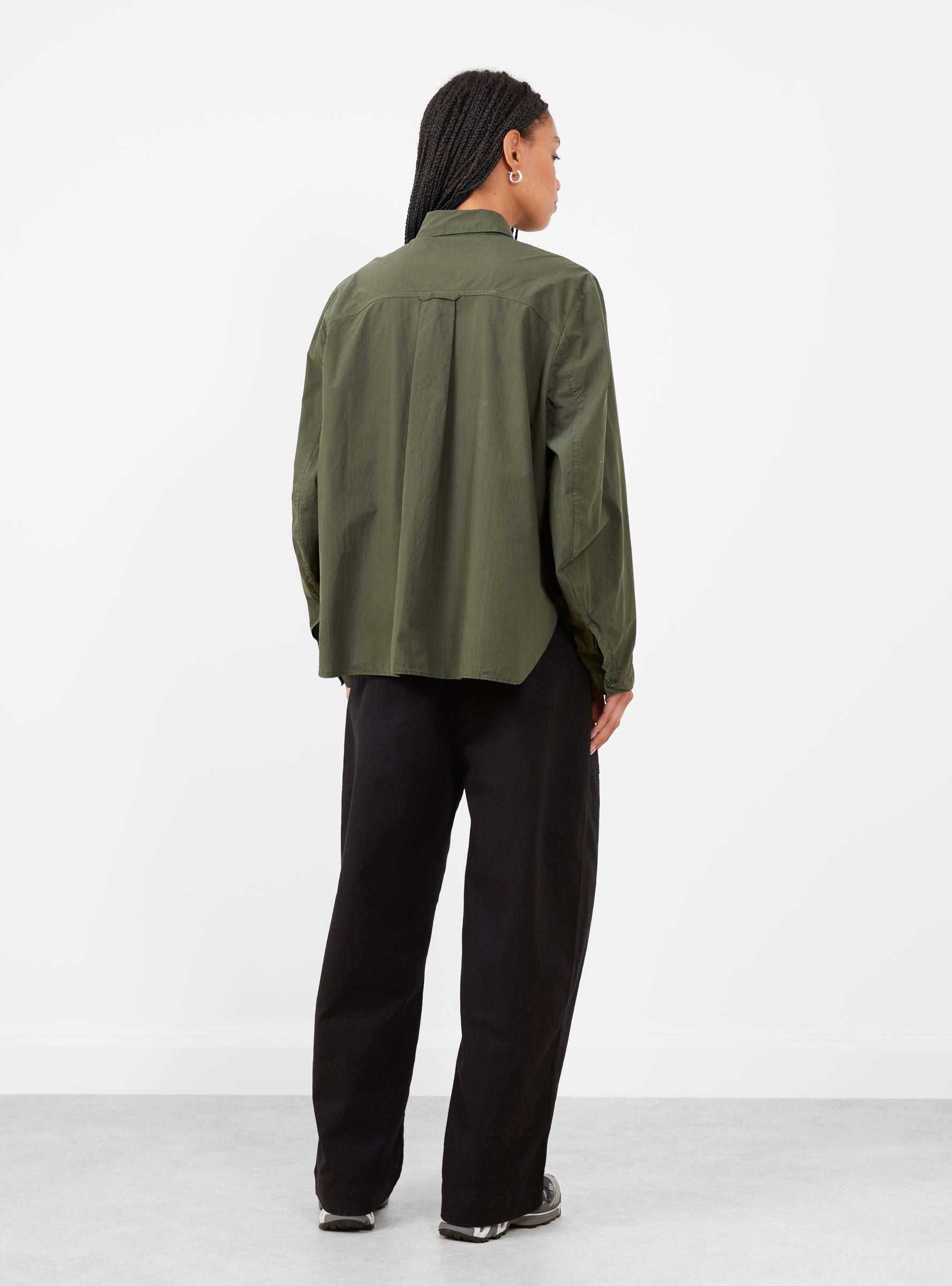 Crafted from Portuguese organic cotton poplin, this garment-dyed long sleeve shirt is cut to a regular fit. Designed with curved front and back yokes, it features a rounded sleeve with seam detailing, a dropped back hem, and a functional loop at the centre back.
