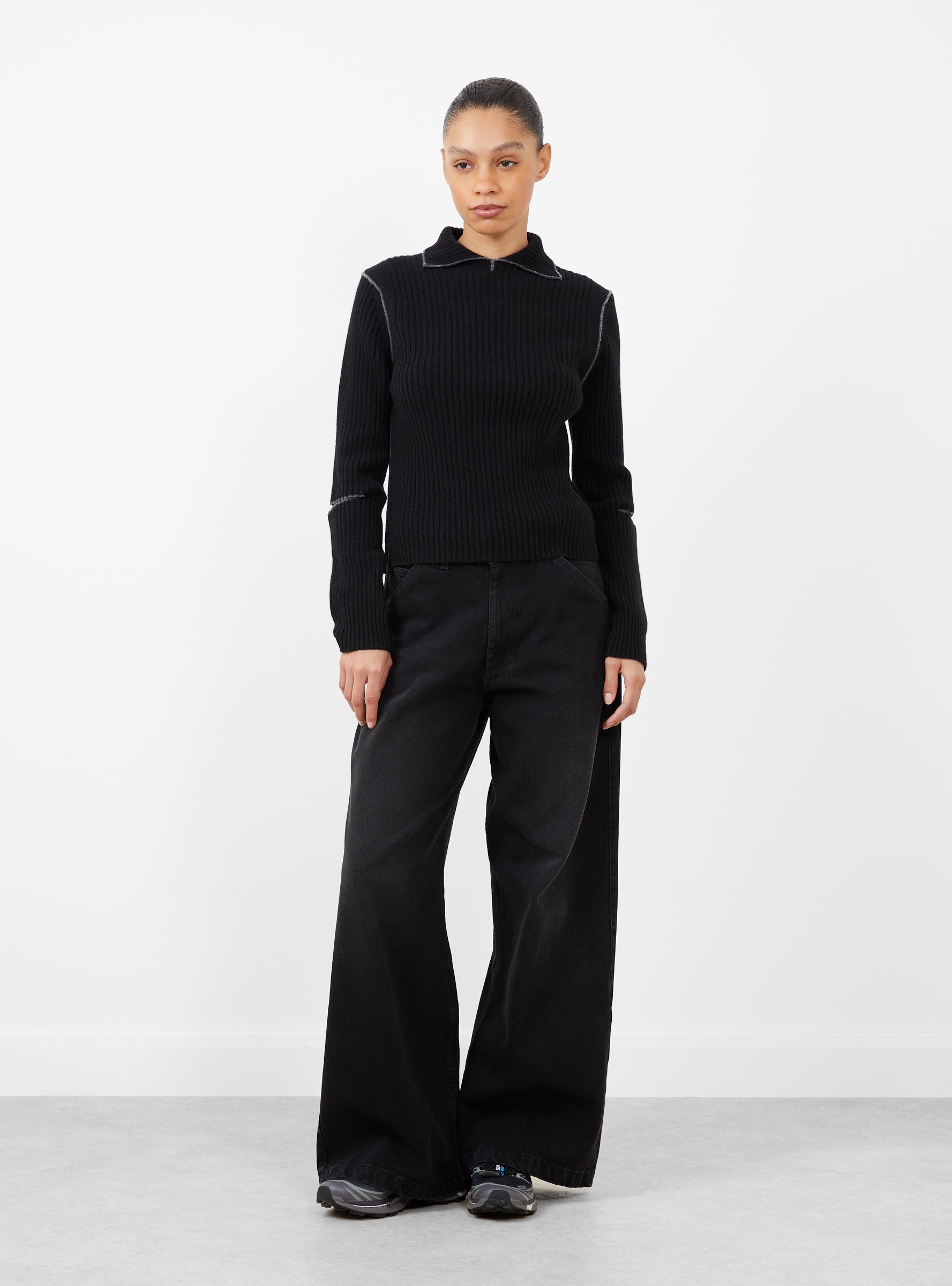The Peeka Knit from YMC arrives in Black. Made in Portugal from virgin wool, this cropped jumper has a slim fit with a ribbed finish and a spread collar. The knit features elbow cut outs and contrast yarn detailing, while side splits at the hem add ease of movement.